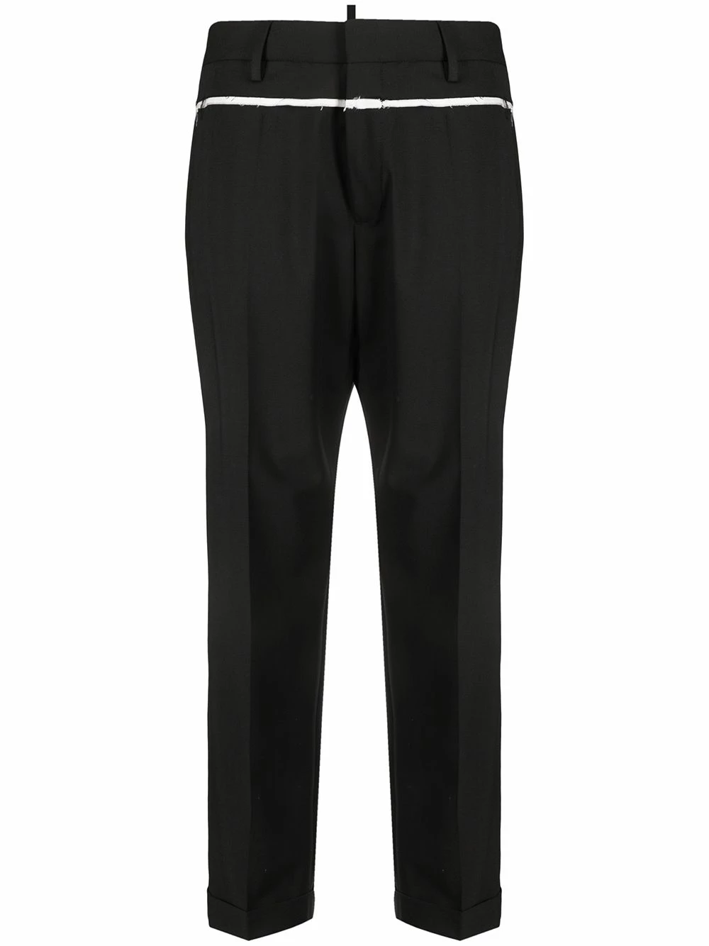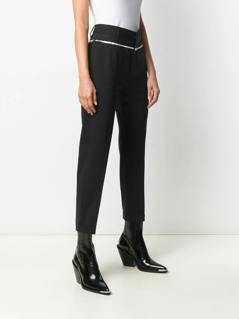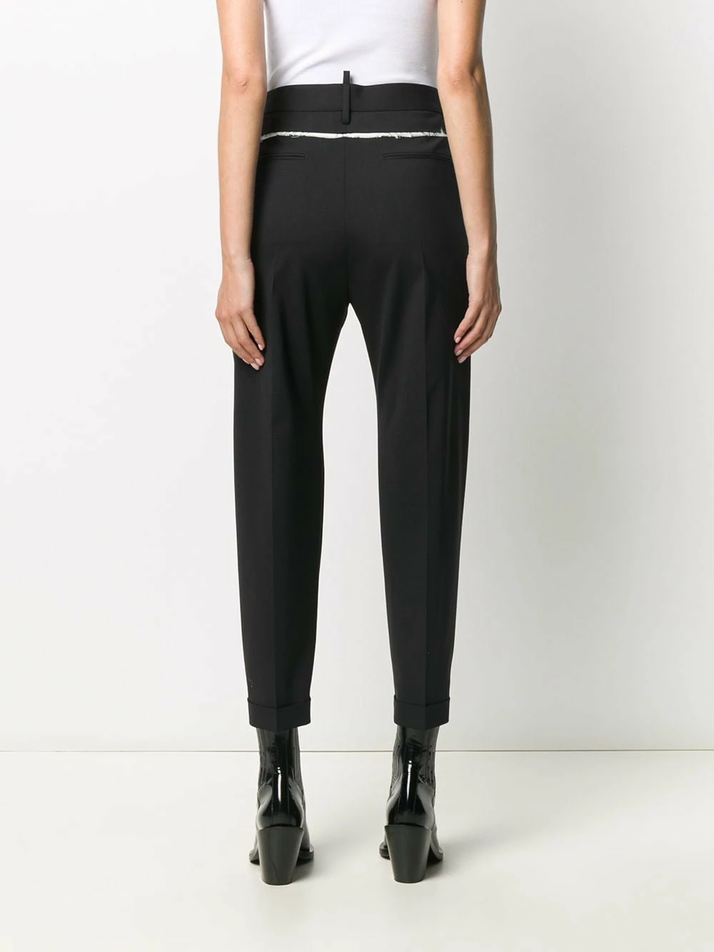 Taille haute, passants de ceinture, fermeture dissimulée sur le devant, poches latérales fendues, poches arrière passepoilées, effet usé, coupe fuselée, ourlet retroussé.