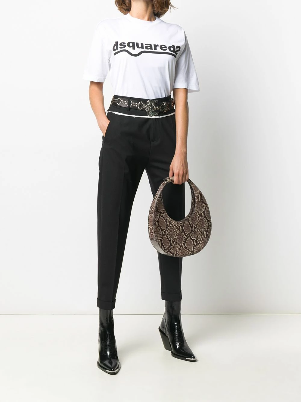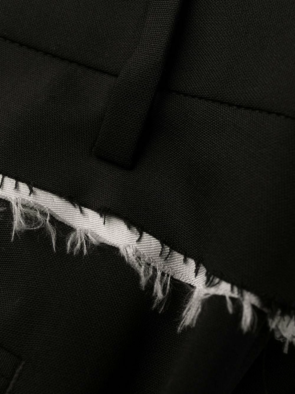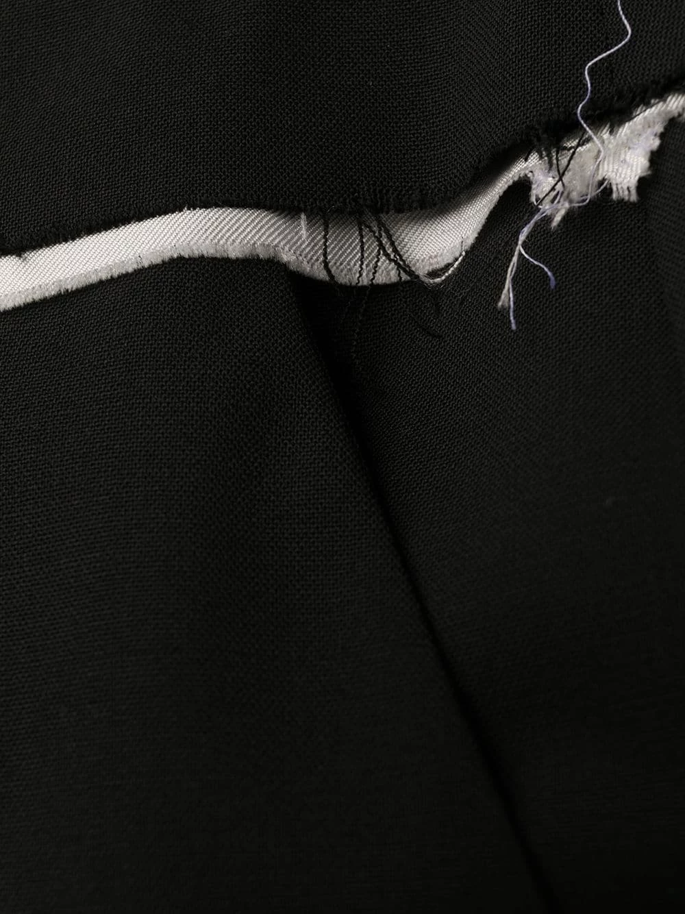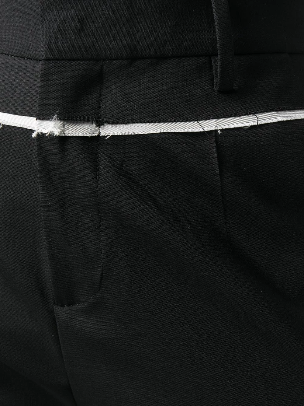 Taille haute, passants de ceinture, fermeture dissimulée sur le devant, poches latérales fendues, poches arrière passepoilées, effet usé, coupe fuselée, ourlet retroussé.
