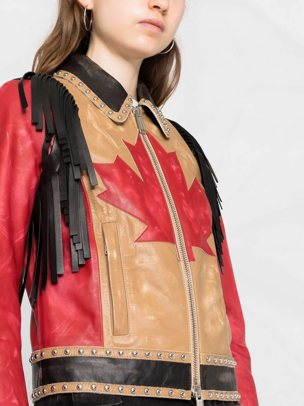 Col pointu plat, fermeture zippée à double sens sur le devant, ornements argentés, poches plaquées latérales, design de puce d’oreille ronde, finition à franges, manches longues, design colour block, ourlet droit.