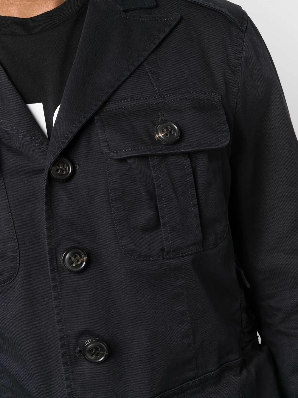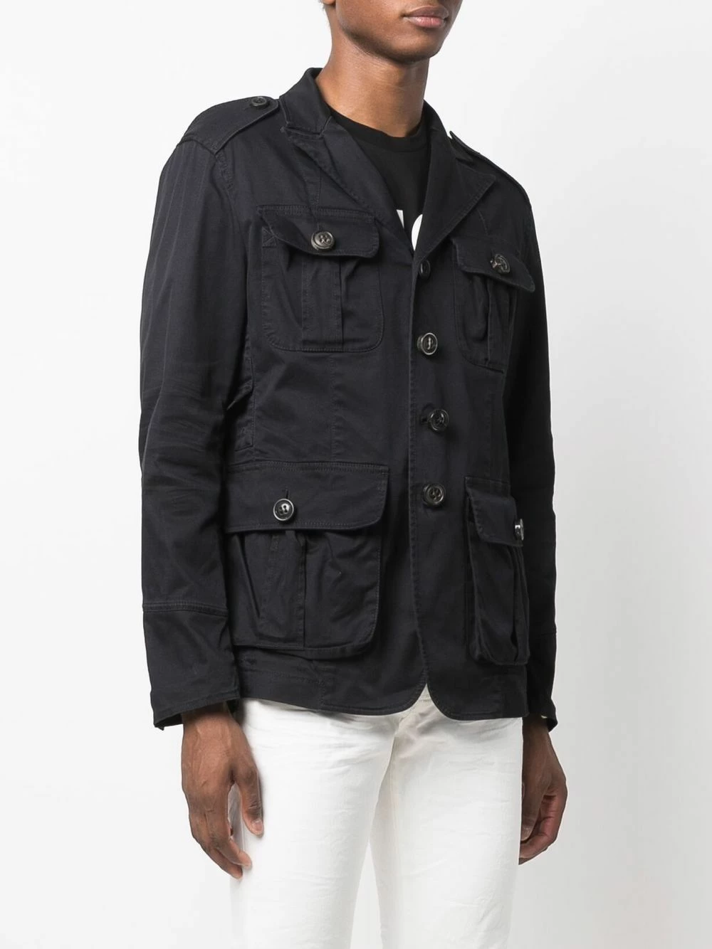 Épaulettes, revers crantés, boutonnière sur le devant, deux poches poitrine à rabat, deux poches à rabat sur le devant, poignets boutonnés. Couleur : noir.