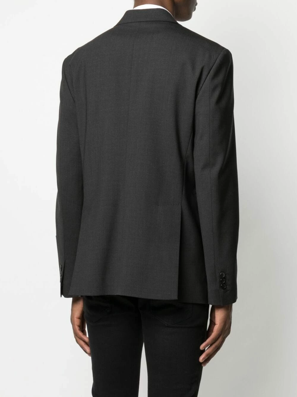 Patch logo sur le côté, revers crantés, poche passepoilée sur la poitrine, boutonnière sur le devant, deux poches latérales à rabat, double fente arrière, doublure intégrale.