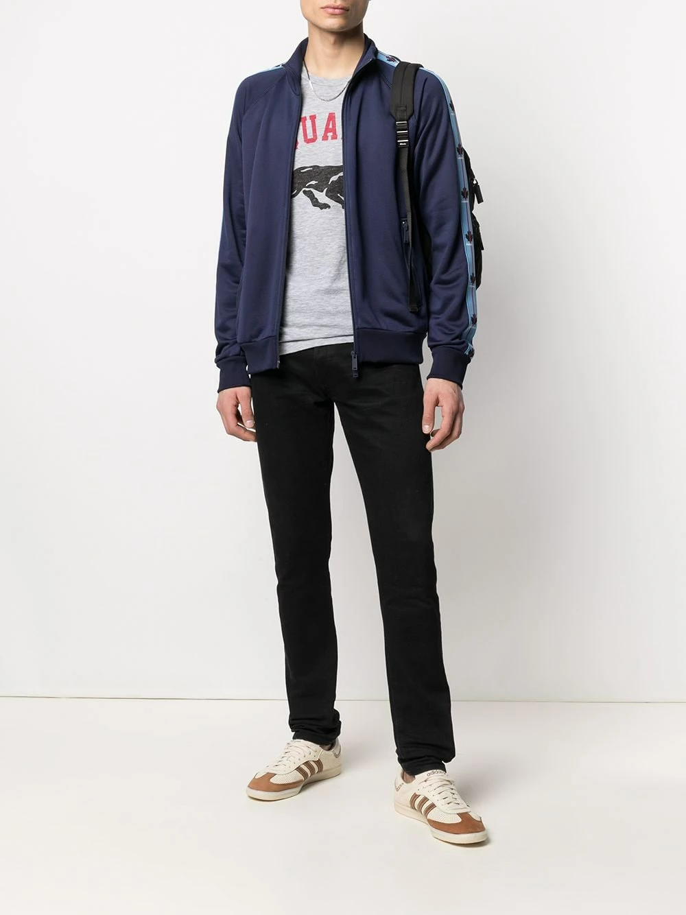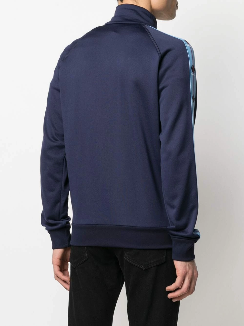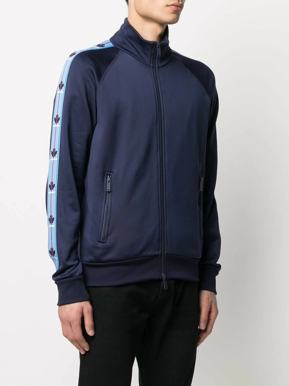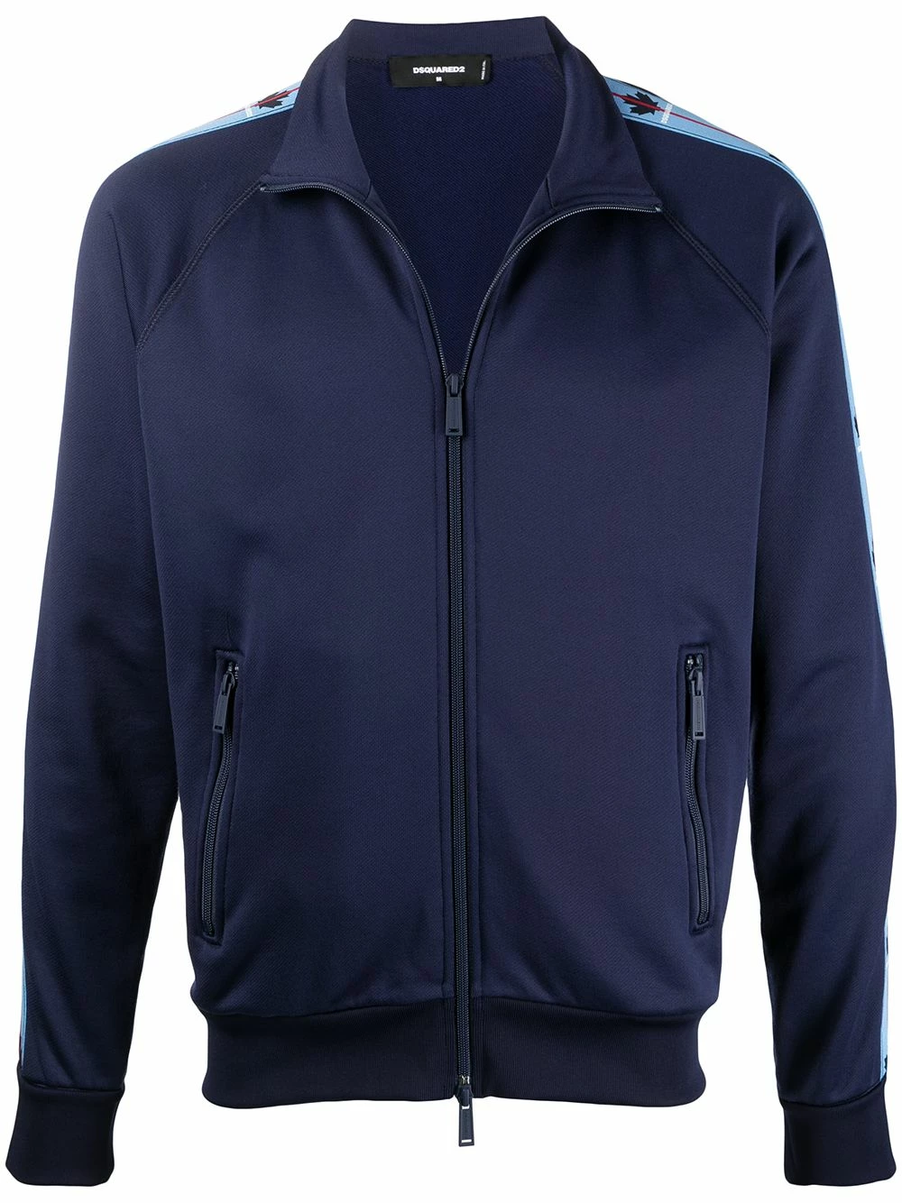 Finition à bande logo, bordures nervurées, col montant, fermeture zippée devant, manches longues, deux poches latérales zippées, ourlet droit. Couleur : Bleu. Matière : coton.