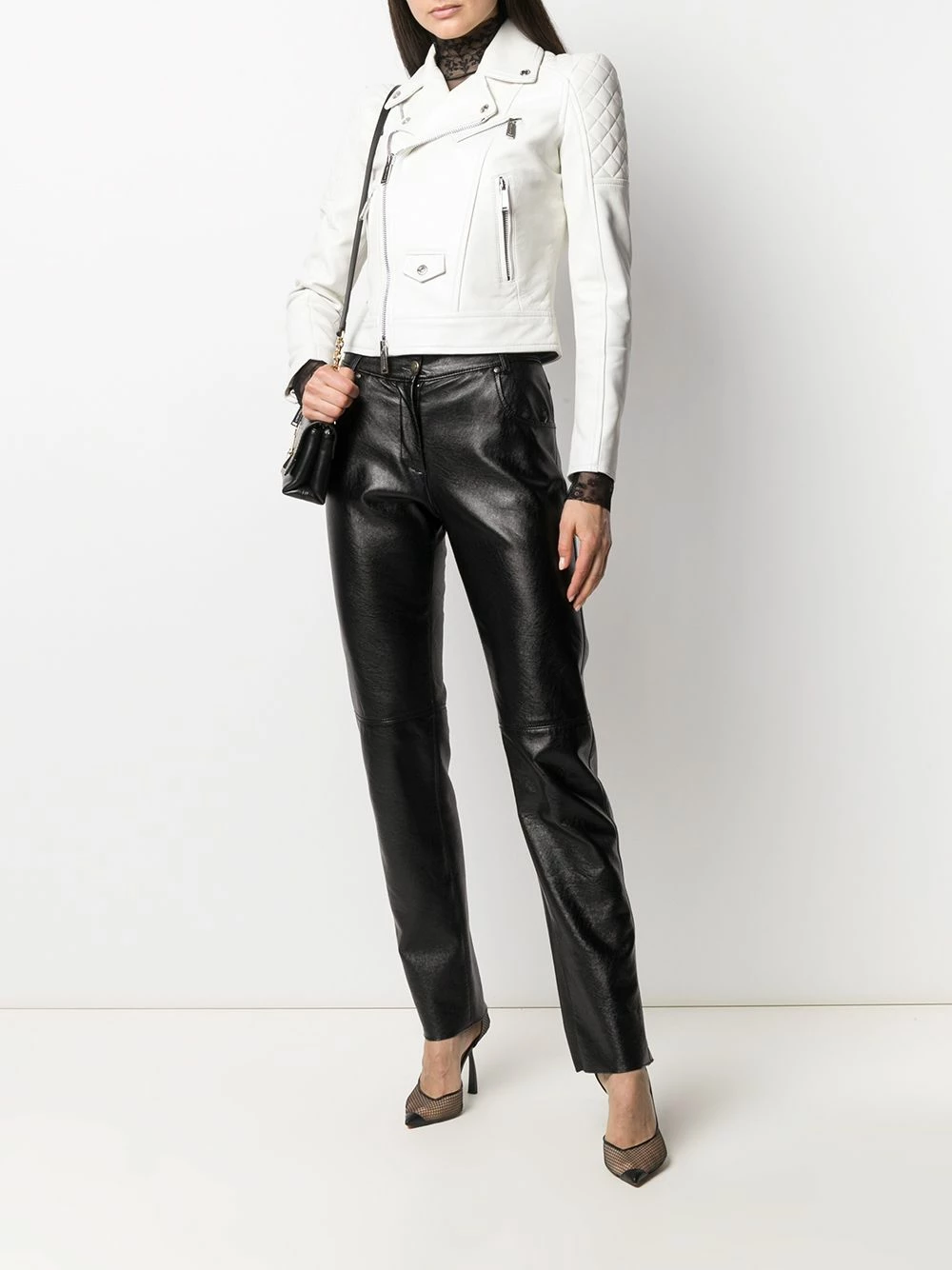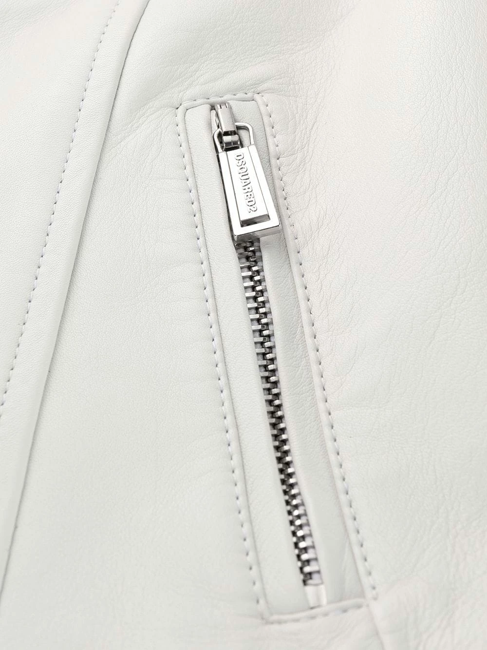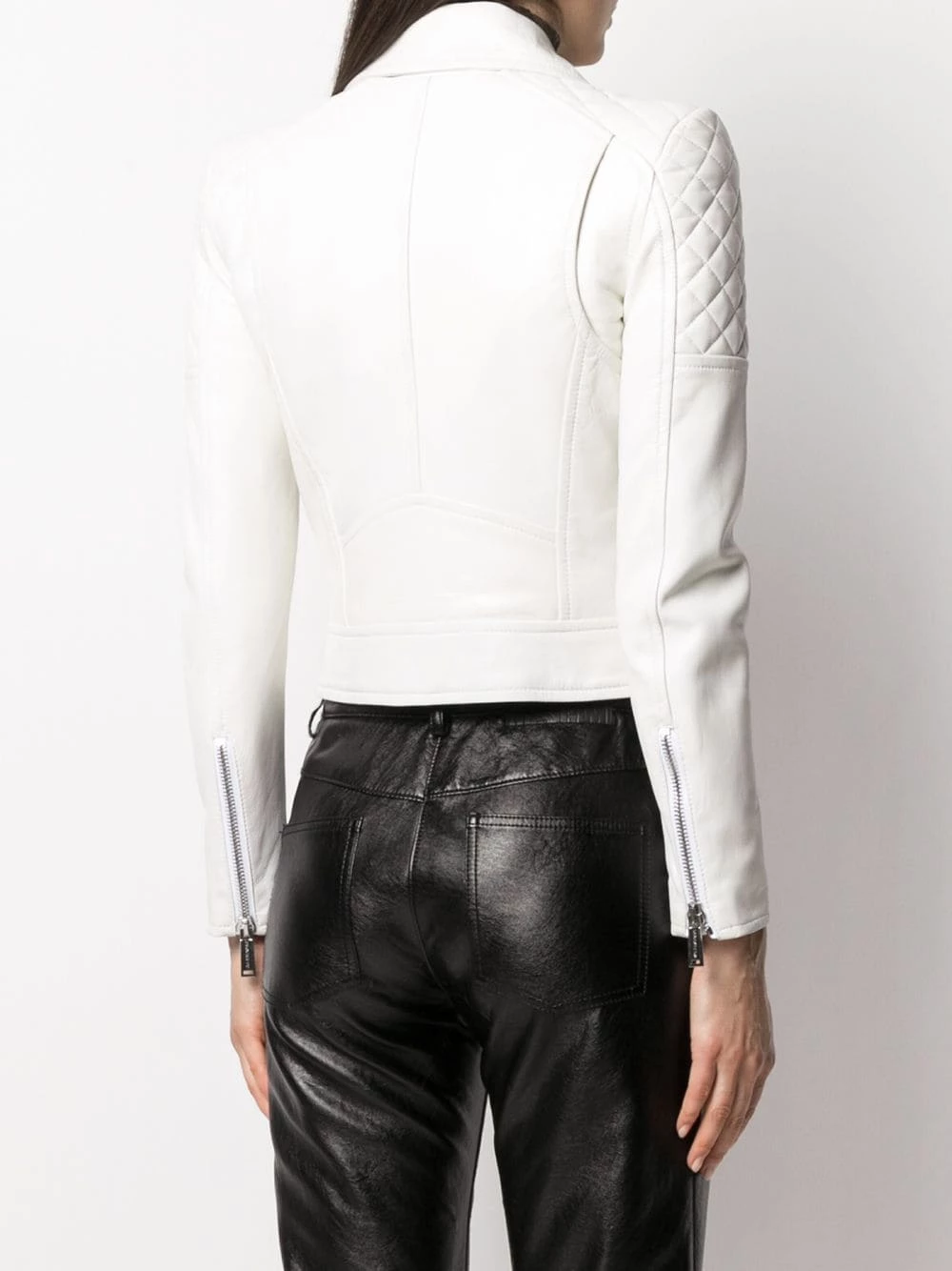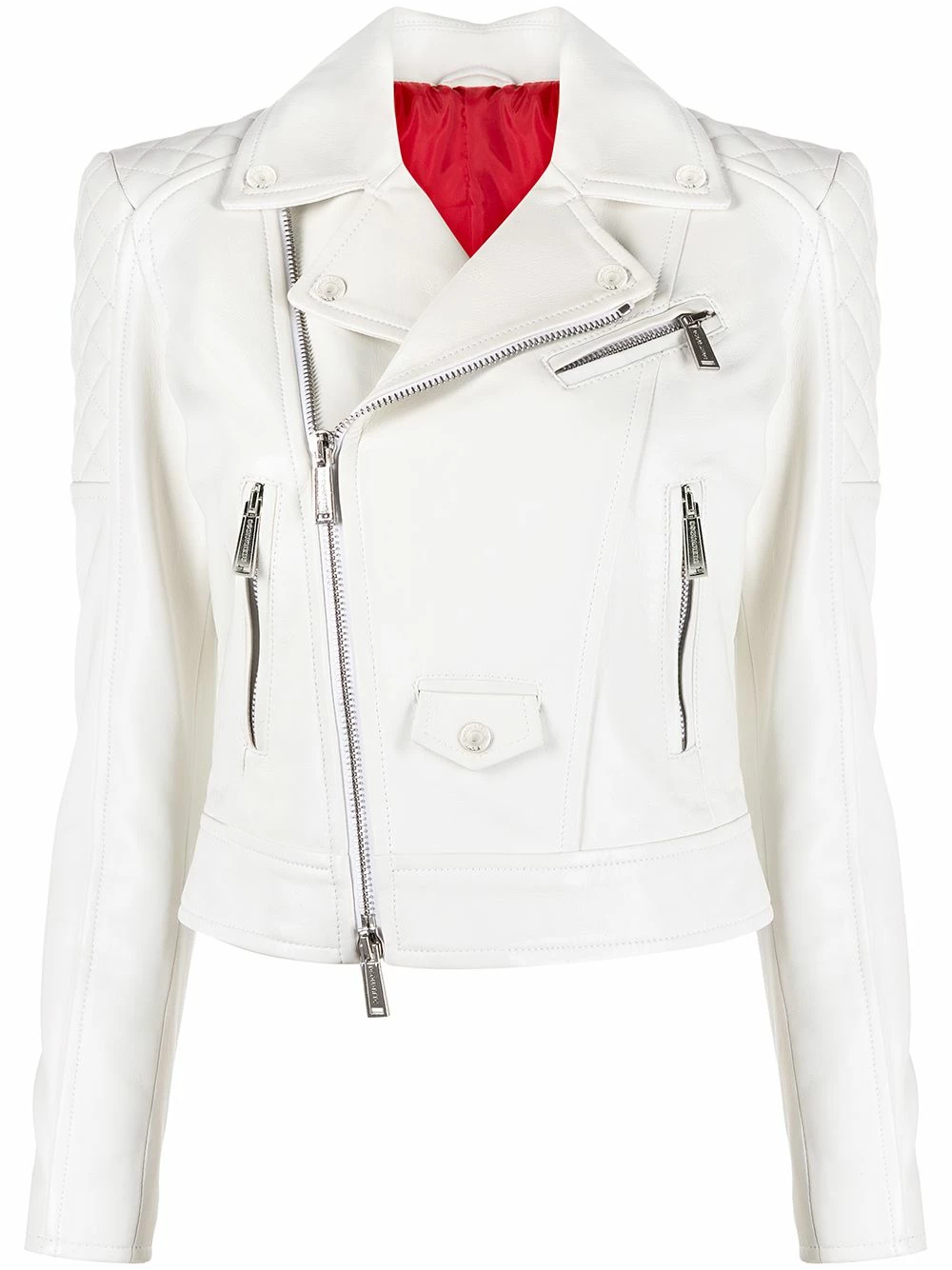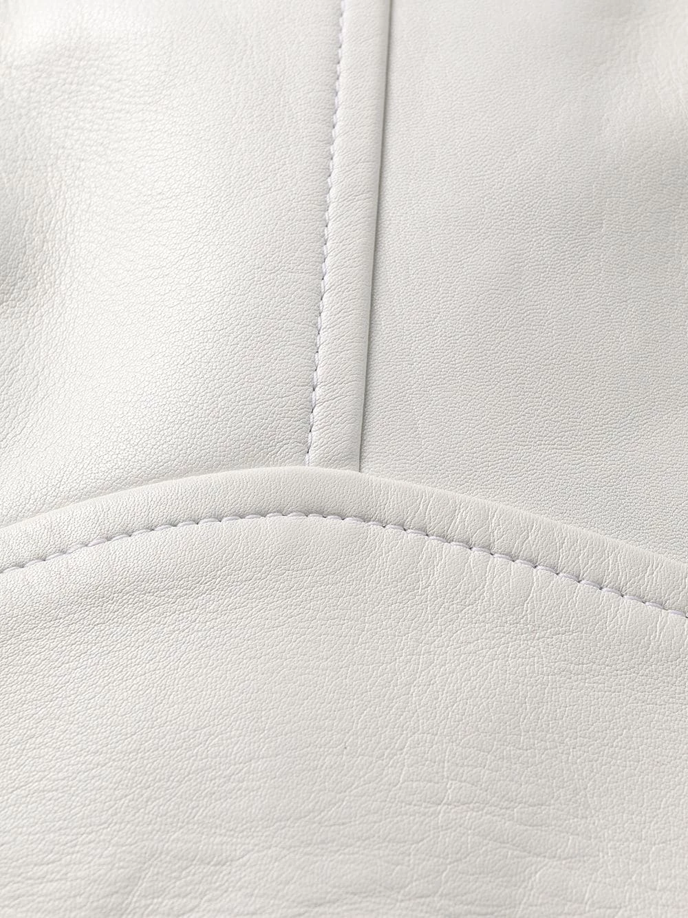 Matelassage à surpiqûres en losange, col cranté, fermeture zippée en biais, manches longues, deux poches latérales zippées, poignets zippés, ourlet droit. Couleur : Blanc. Matière : cuir.