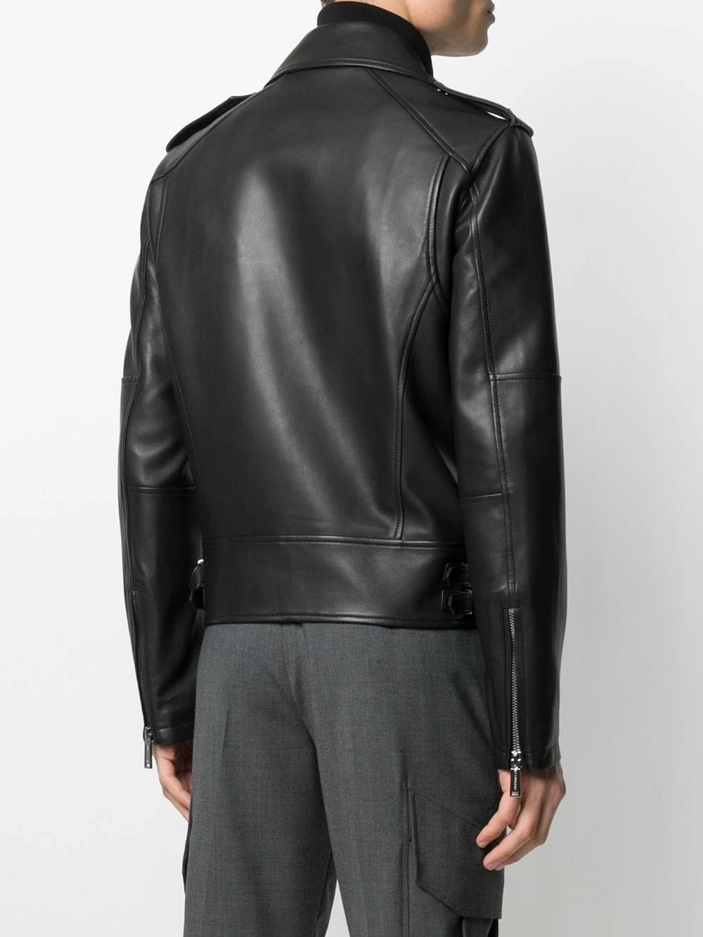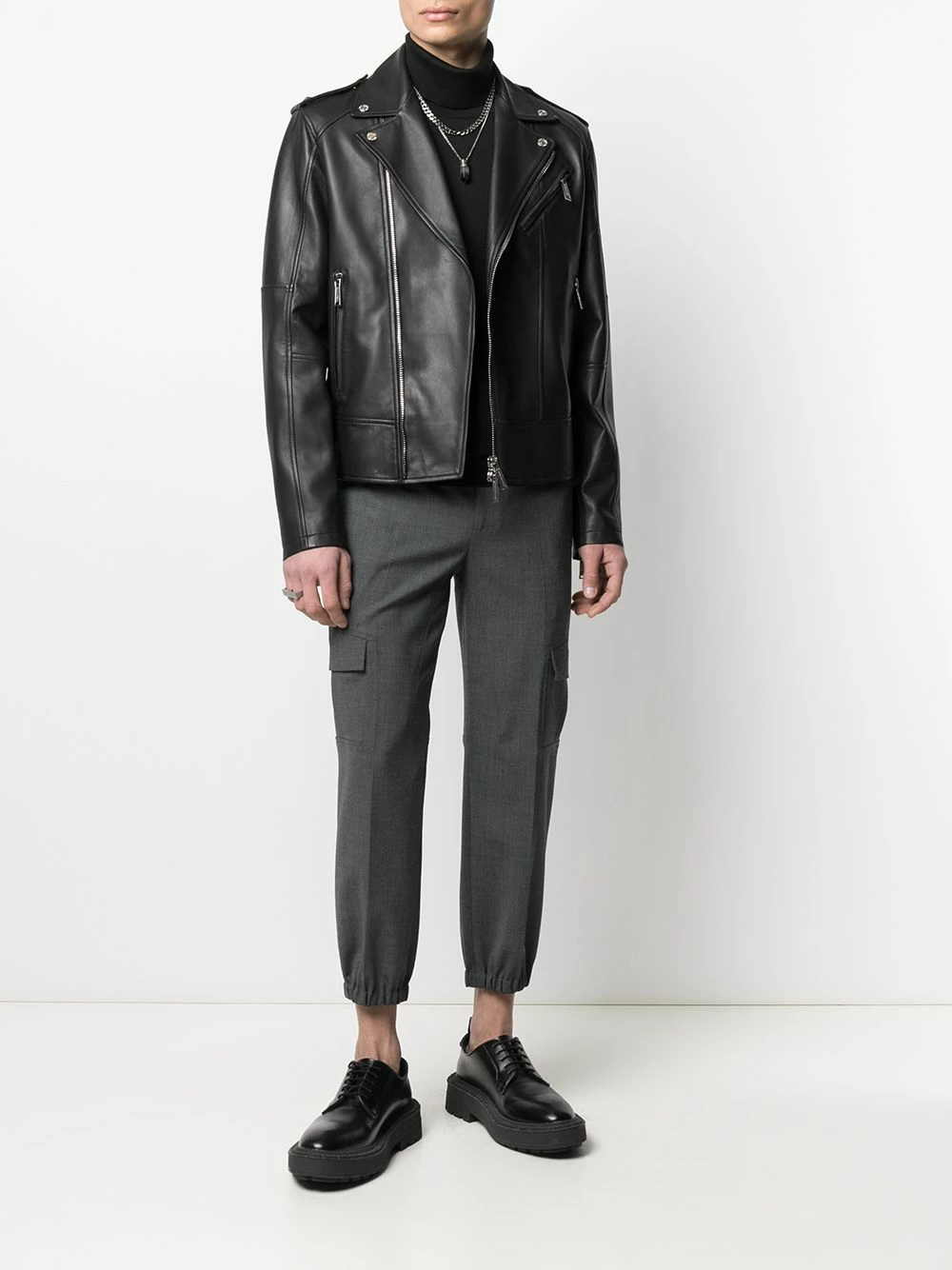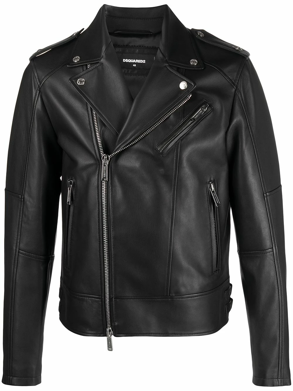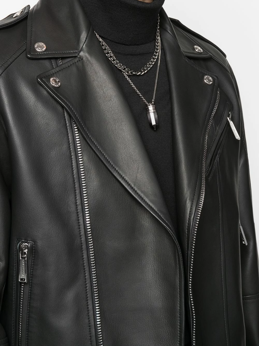 Revers crantés, fermeture zippée en biais, poches à fermeture zippée devant, épaulettes, tirants à boutons décoratifs, manches longues, manches à poignets resserrés. Couleur : noir.