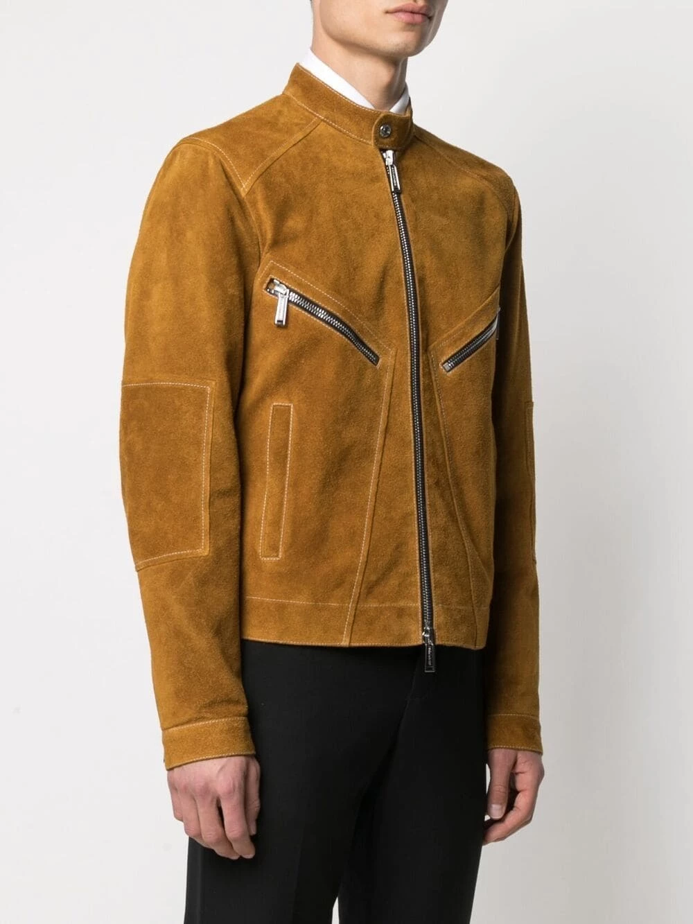 Coutures contrastantes, col à bouton pression, fermeture zippée à double sens sur le devant, deux poches poitrine zippées, deux poches passepoilées latérales, poignets à boutons pression, doublure intégrale. Matière : cuir.