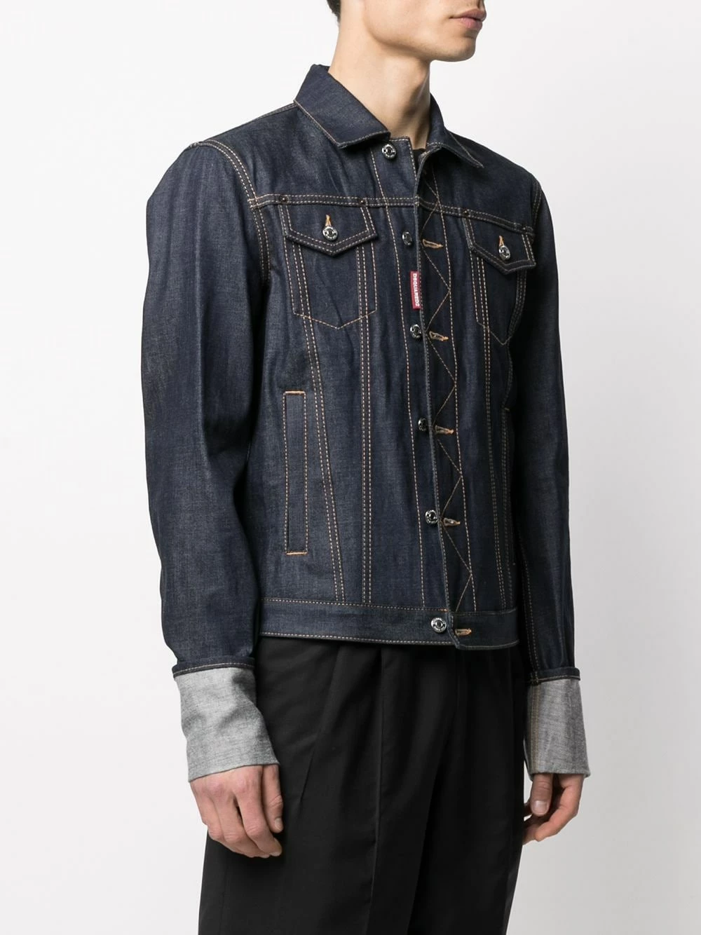 Col classique, coutures contrastantes, deux poches poitrines boutonnées, manches longues, poignets retroussés, deux poches latérales passepoilées, boutonnière sur le devant, ourlet droit. Couleur : Bleu. Matière : coton mélangé.