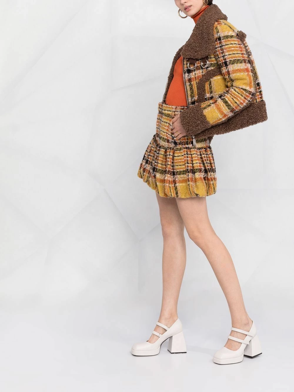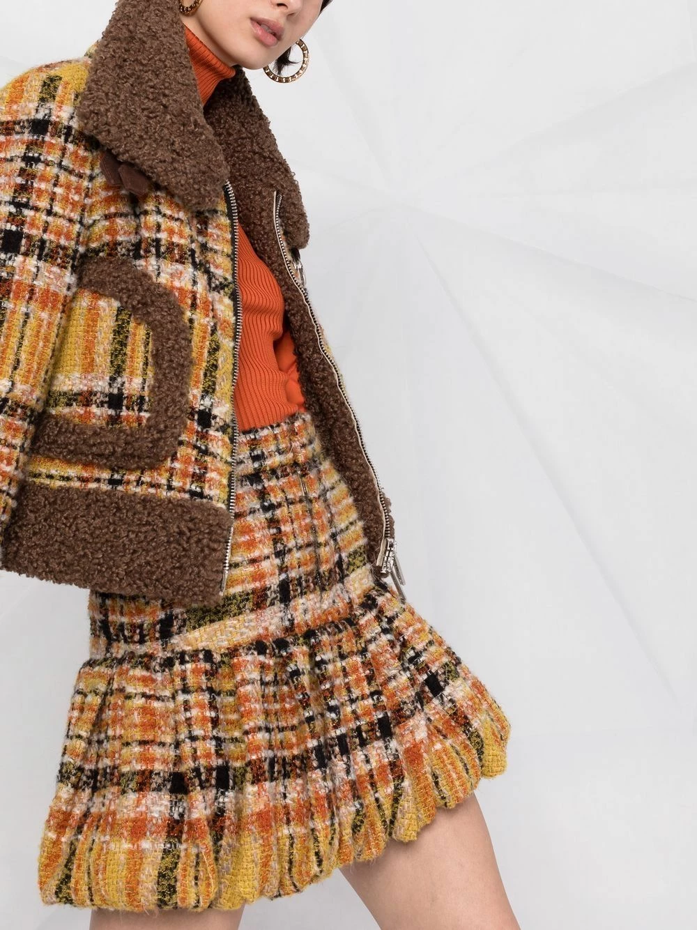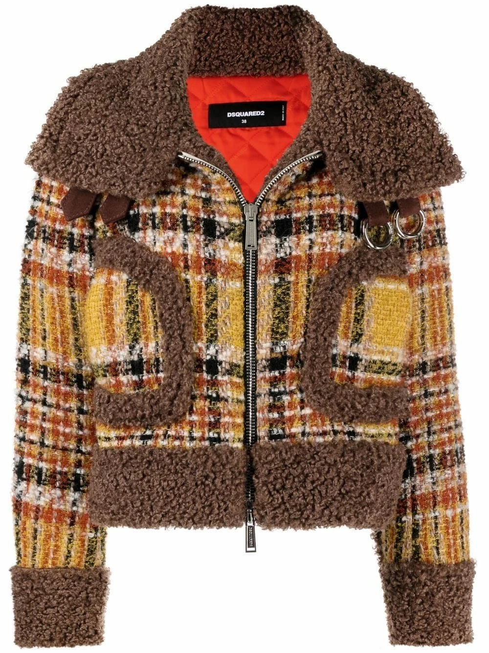 Tweed, motif tartan, embouchure large, finitions en fourrure, fermeture zippée à double sens sur le devant, poches latérales arrondies, manches longues, doublure matelassée, ourlet droit.