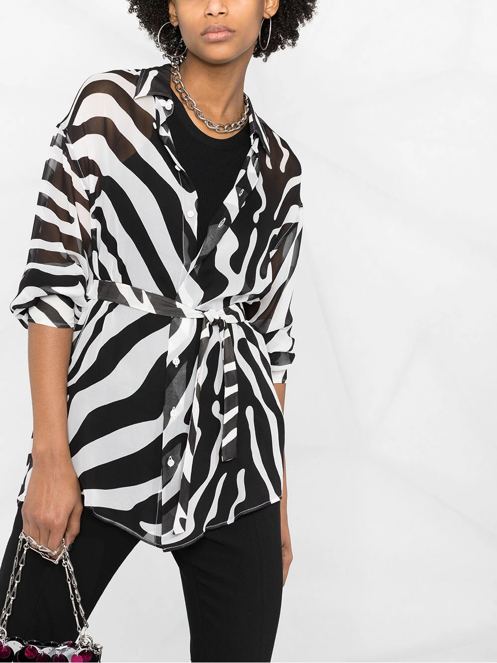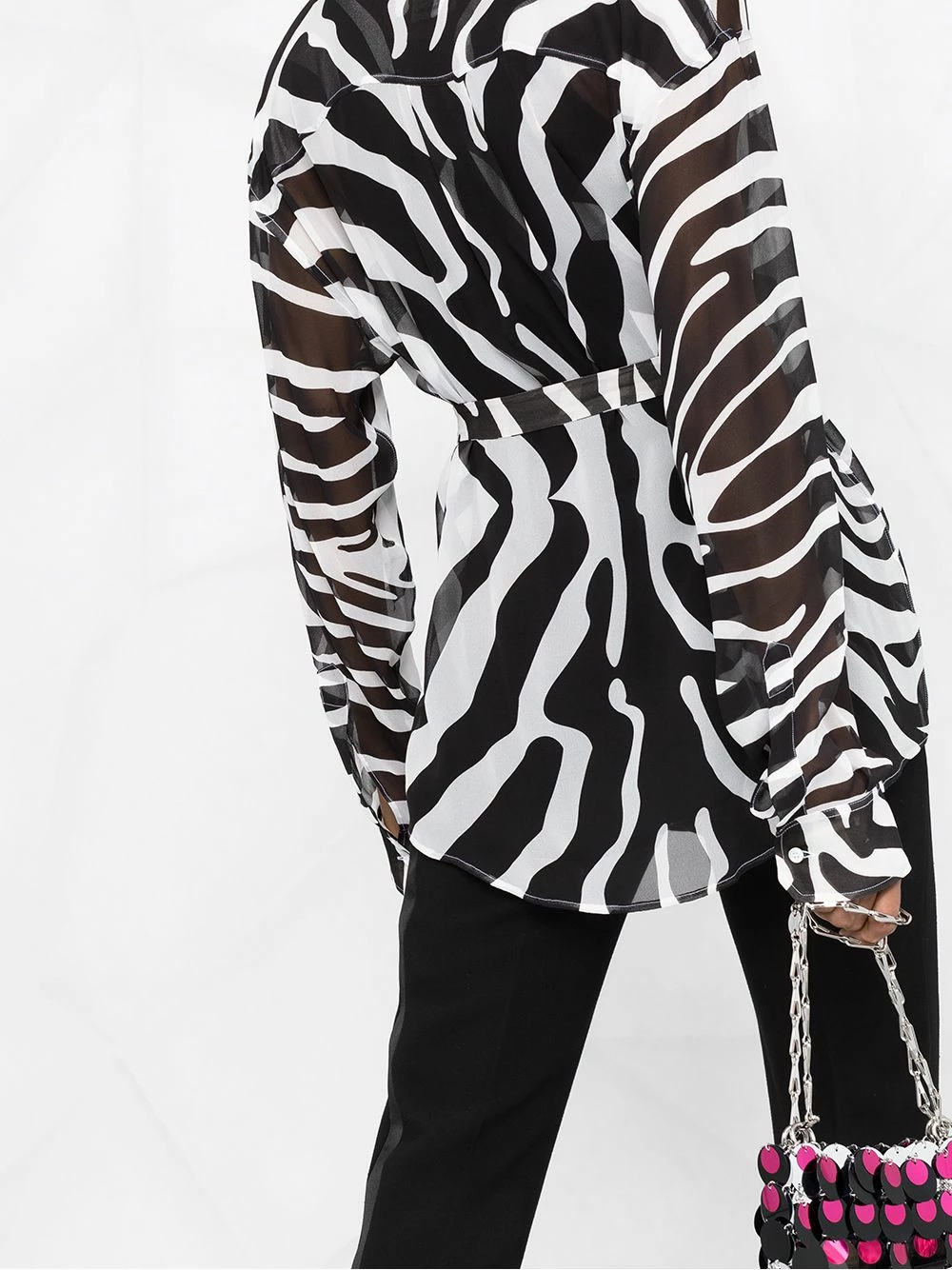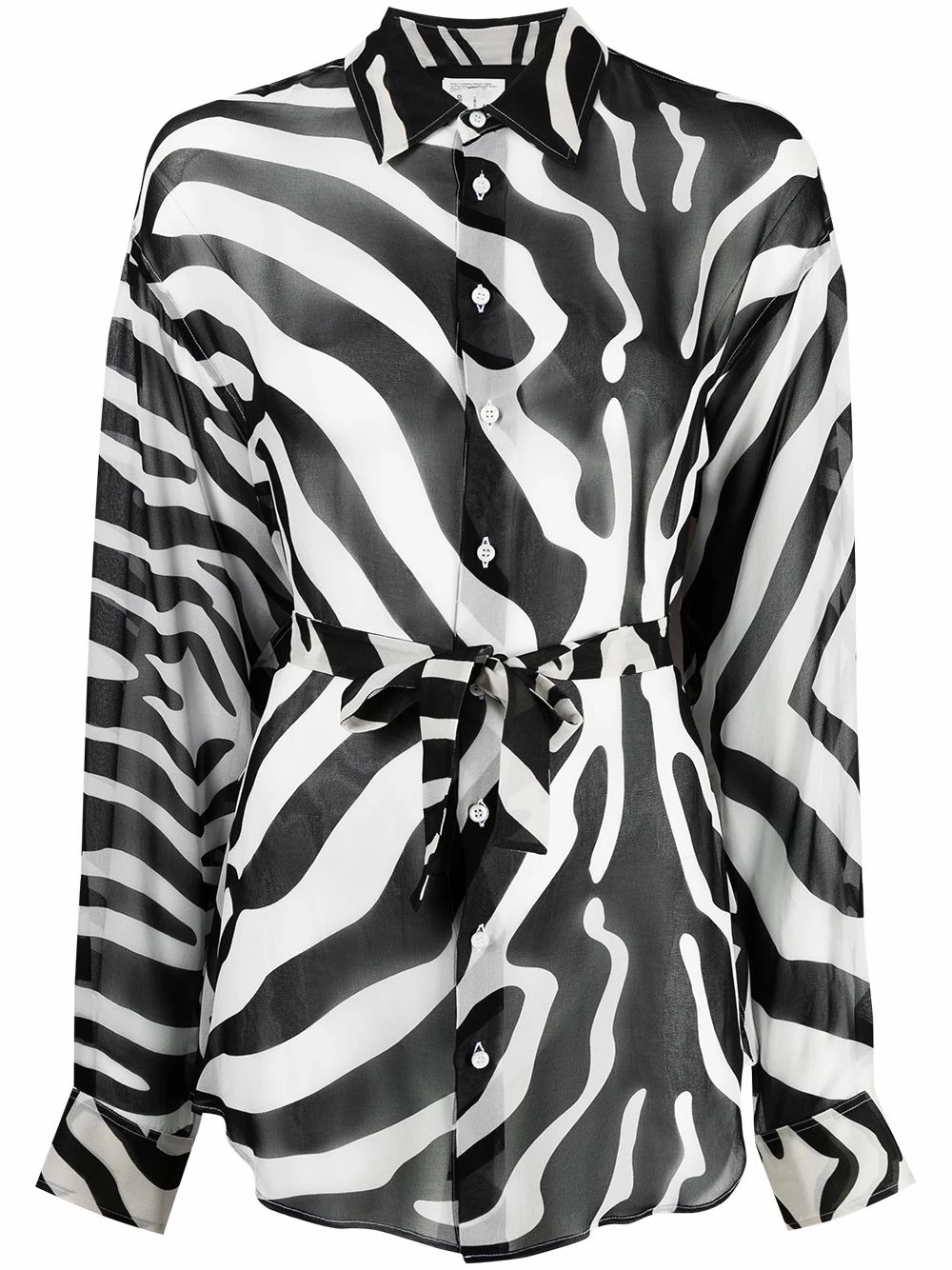 Imprimé zèbre, effet de transparence, col classique, effet d’épaules descendues, boutonnière sur le devant, taille ceinturée, manches longues, poignets boutonnés, ourlet incurvé.