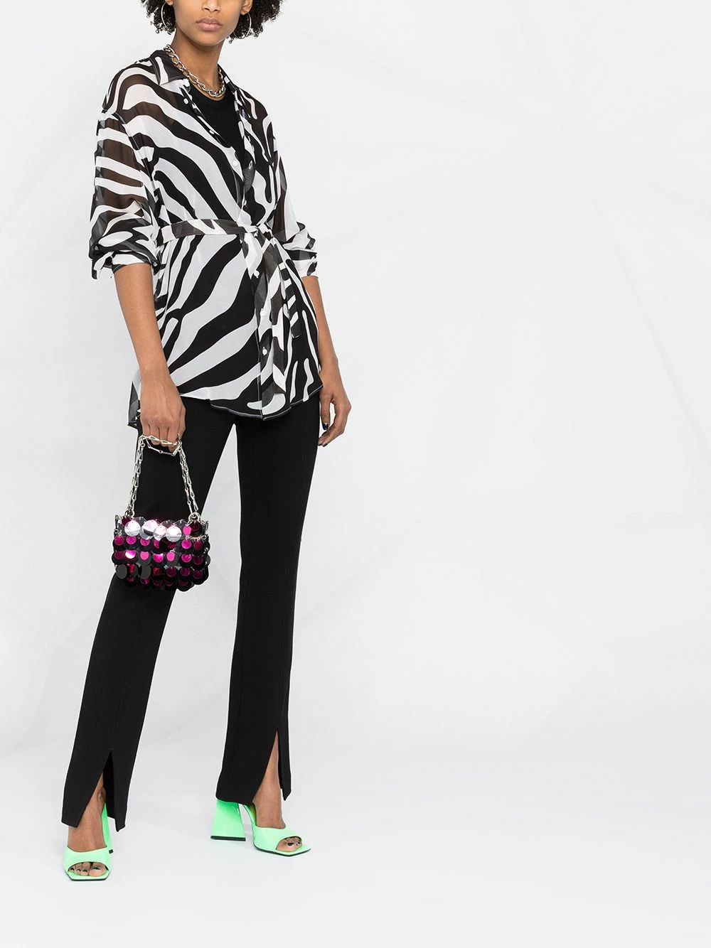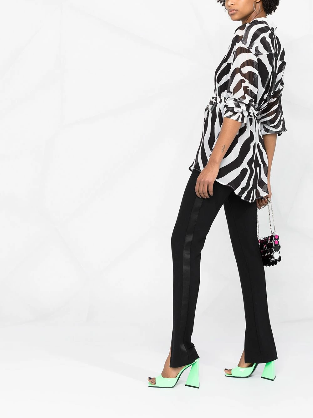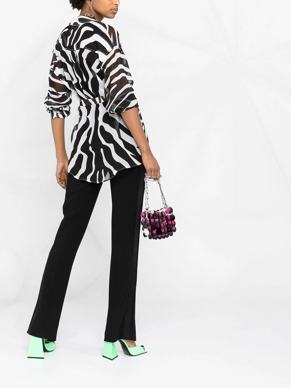 Imprimé zèbre, effet de transparence, col classique, effet d’épaules descendues, boutonnière sur le devant, taille ceinturée, manches longues, poignets boutonnés, ourlet incurvé.