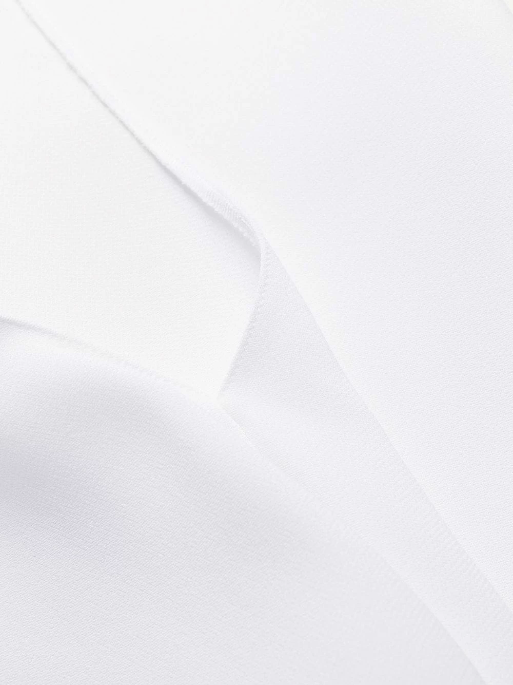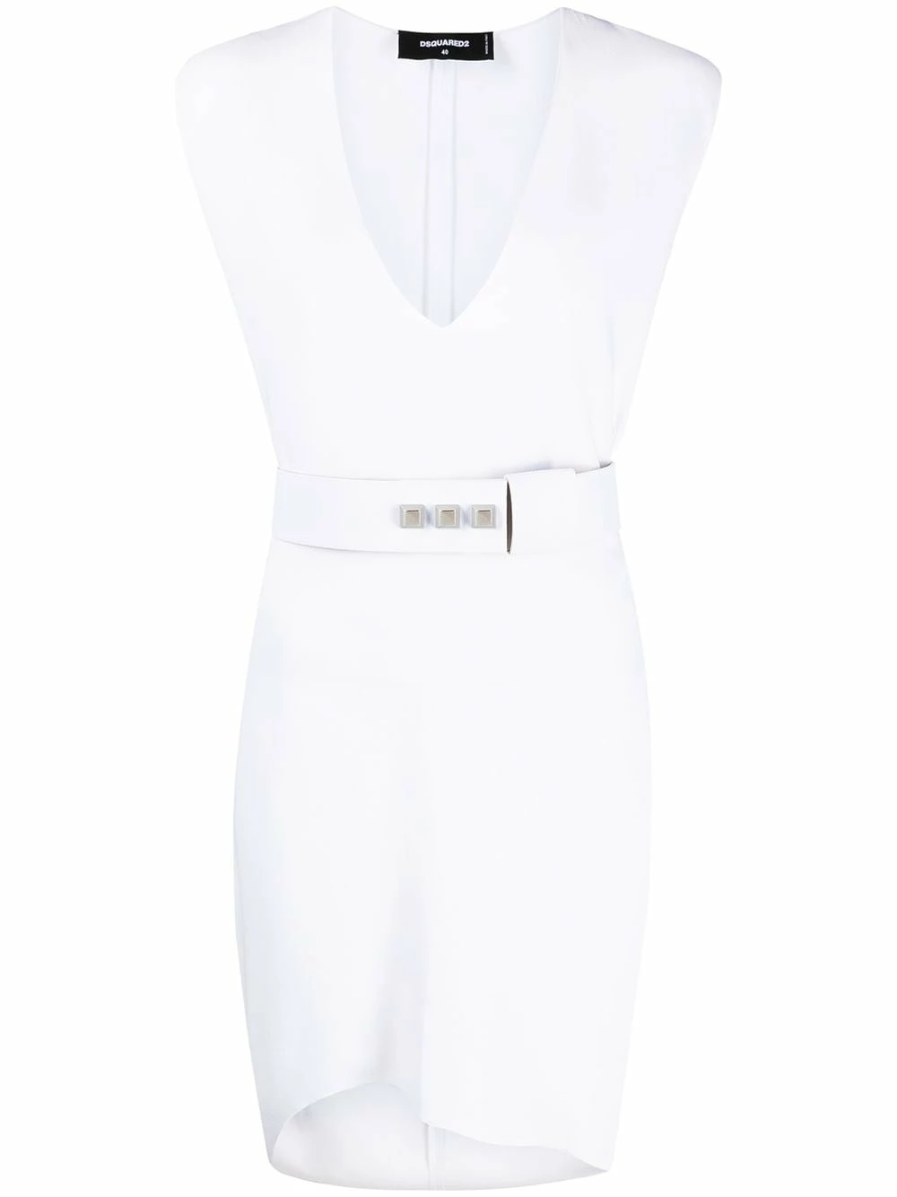 Design sans manches, col v, ourlet asymétrique, taille ceinturée, longueur genou. Couleur : blanc.