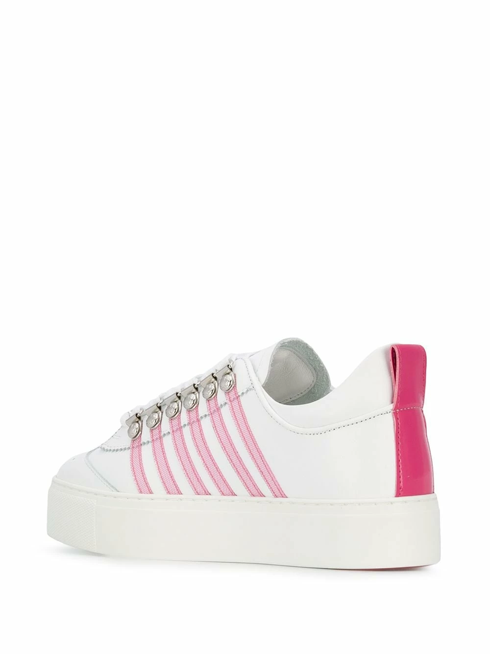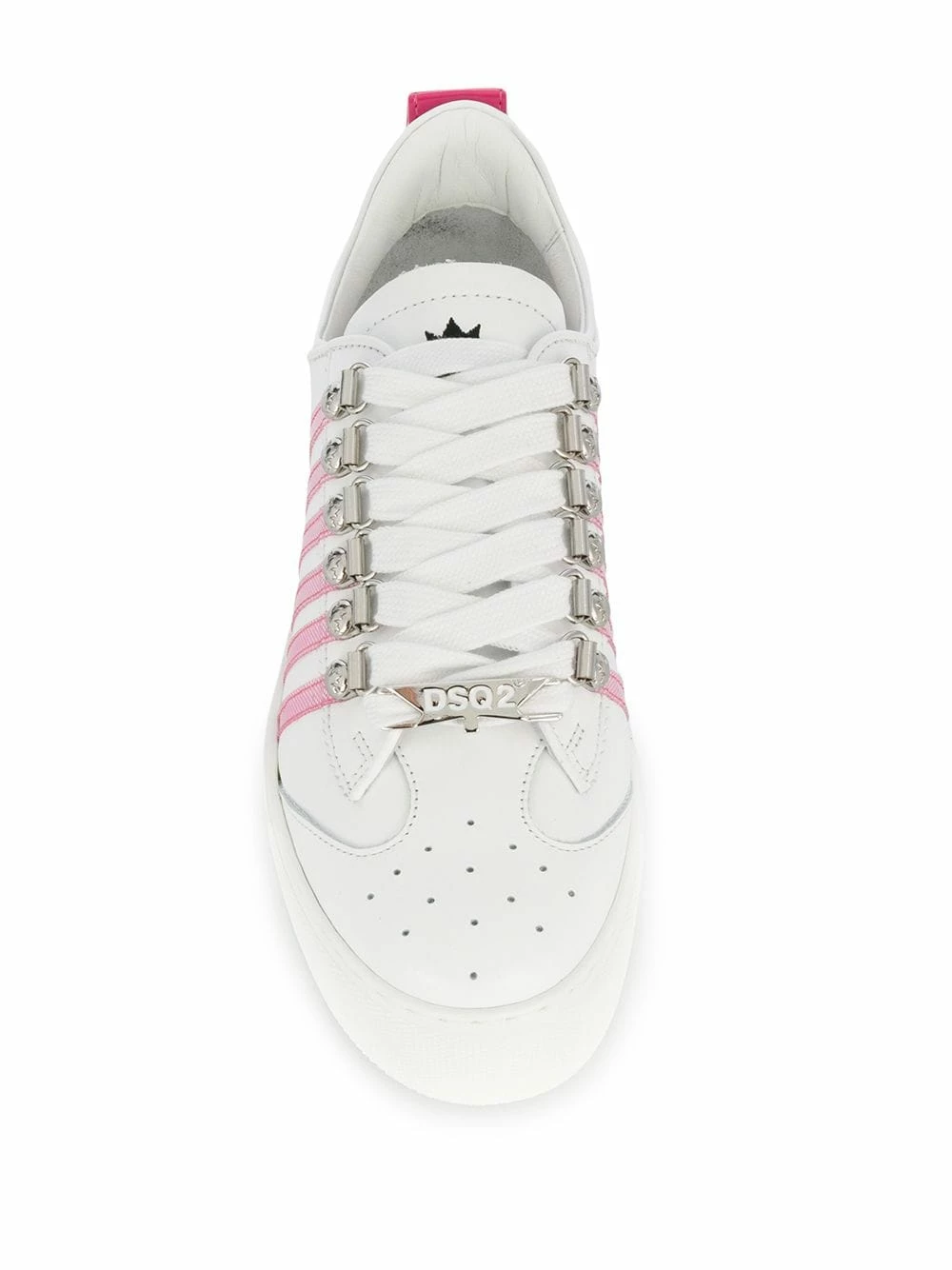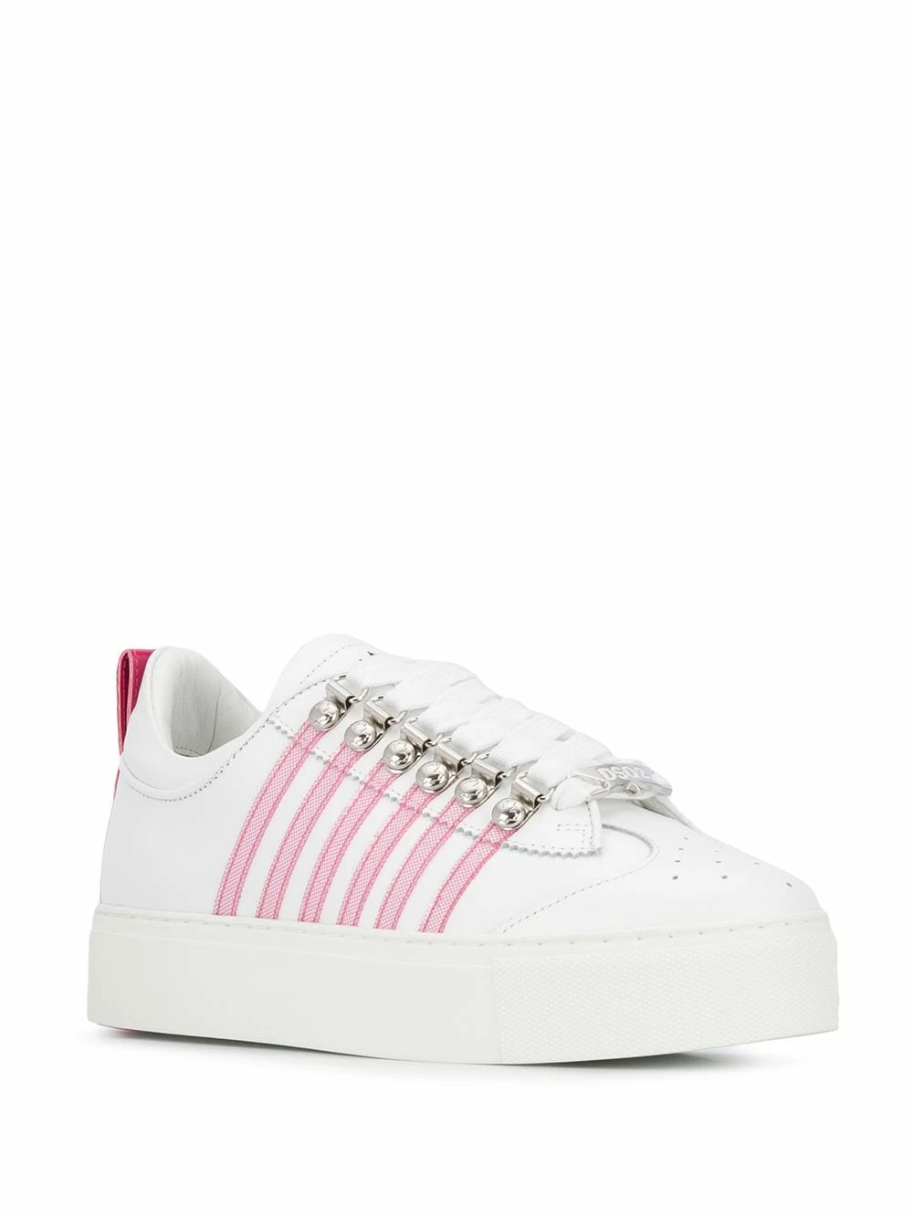Baskets à détail de rayures en cuir Dsquared2 avec empiècements à coutures visibles, bout rond, détail de perforation, détail rayé sur le côté, détails de clous argentés, languette arrière, patch logo sur la languette, fermeture à lacets et semelle plate en caoutchouc. Couleur : blanc.
