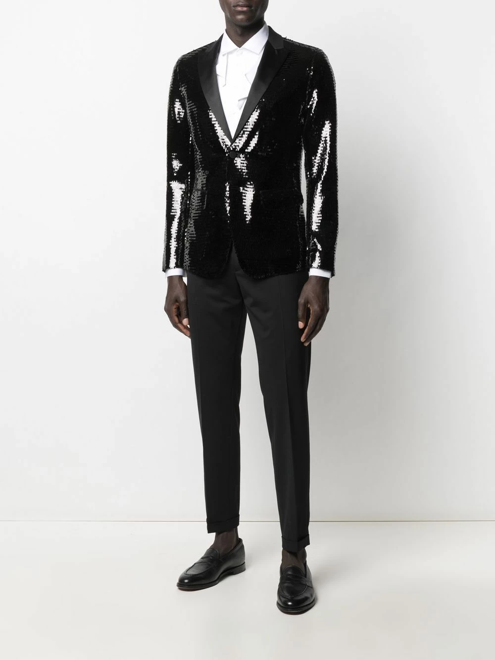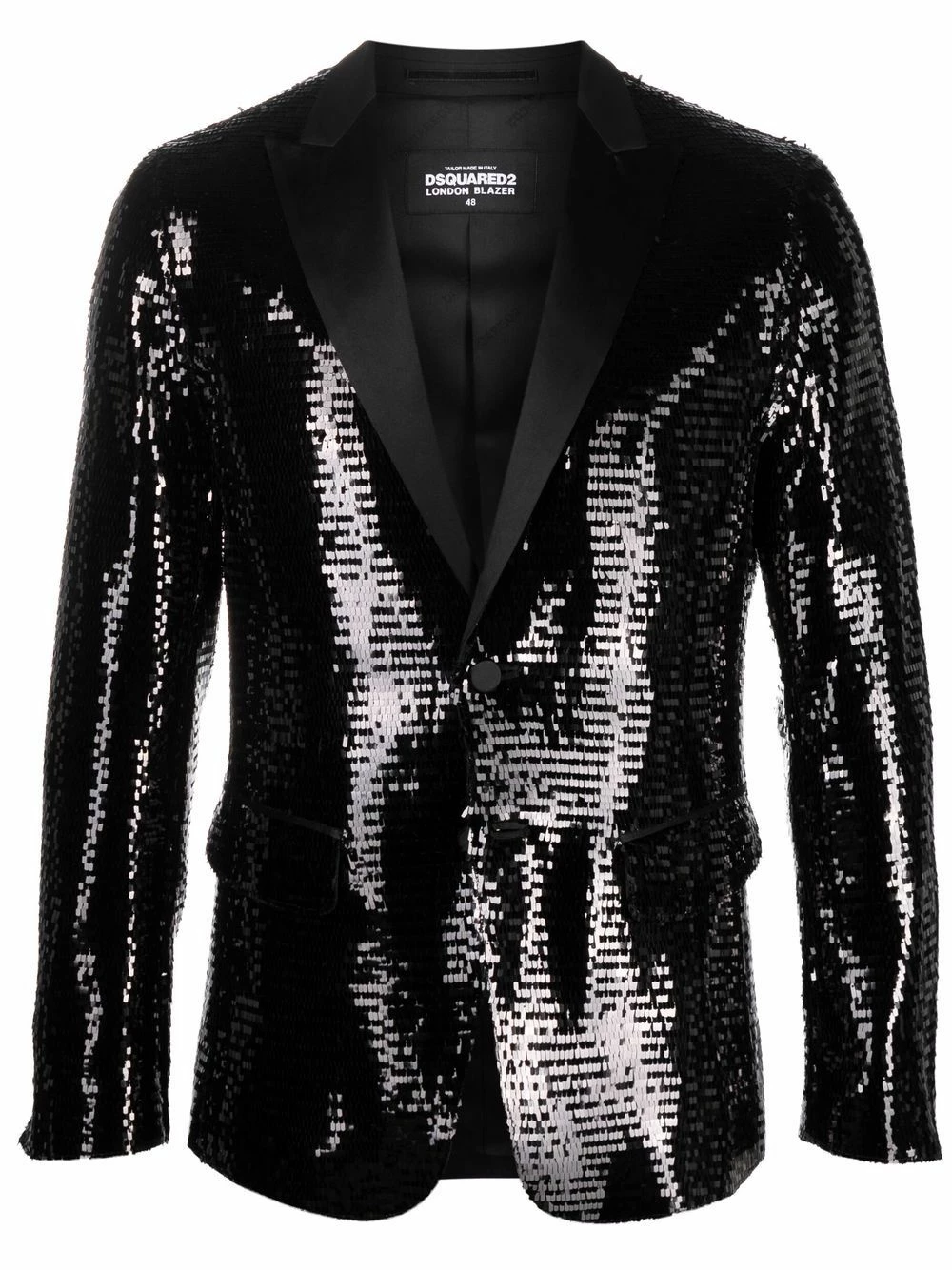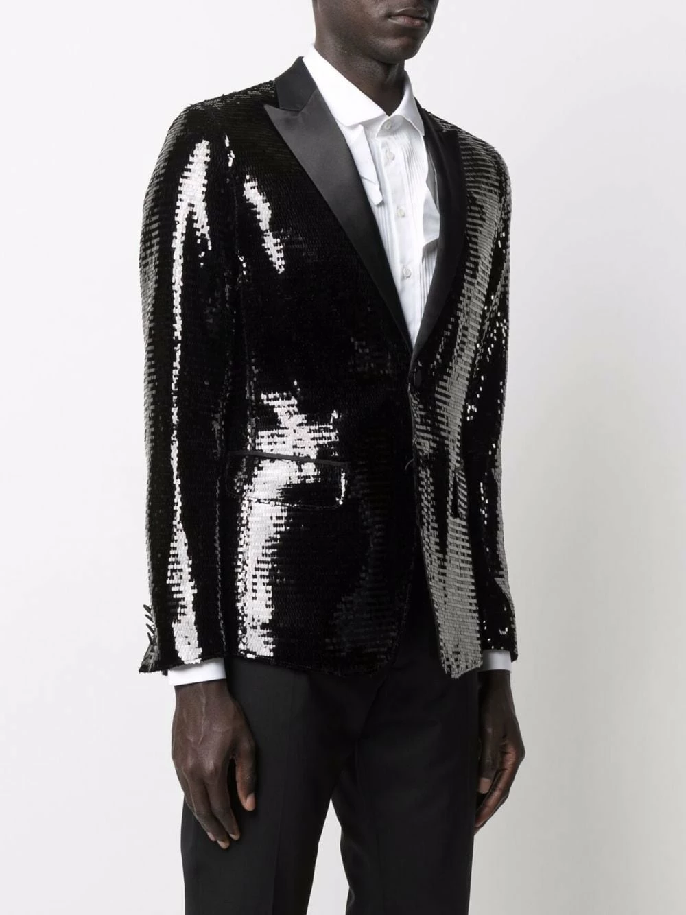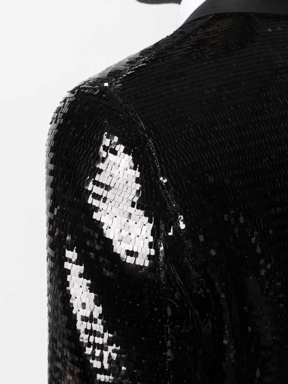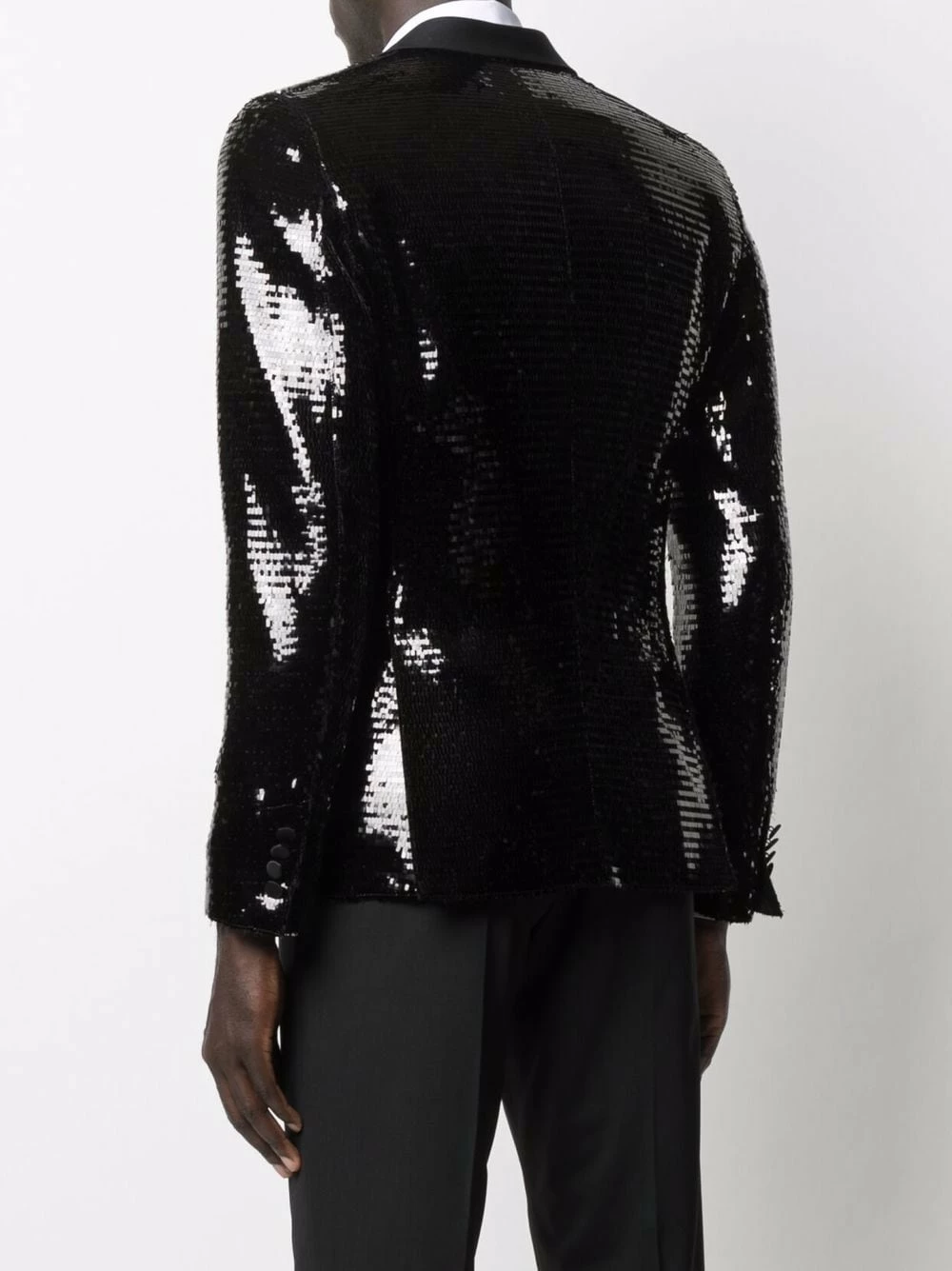 Ornements en sequins, revers pointus, coupe longue, boutonnière sur le devant, poches latérales à rabat. Couleur : noir. Matière : soie.
