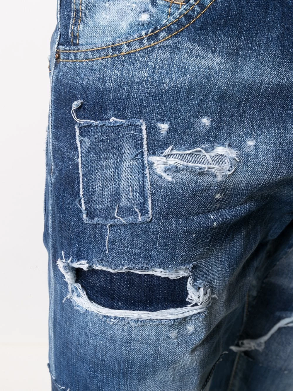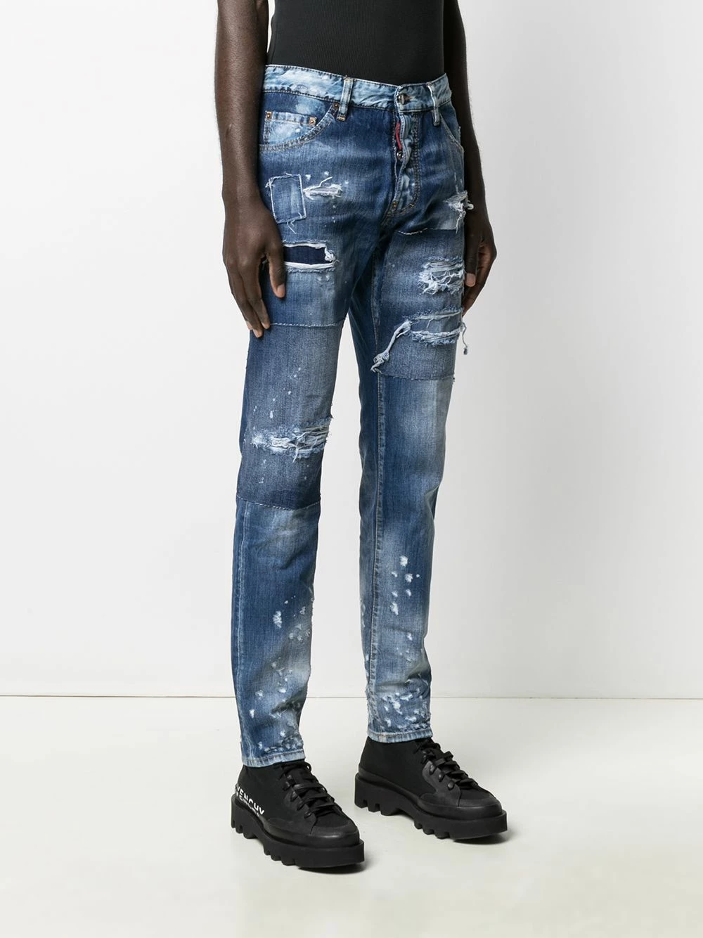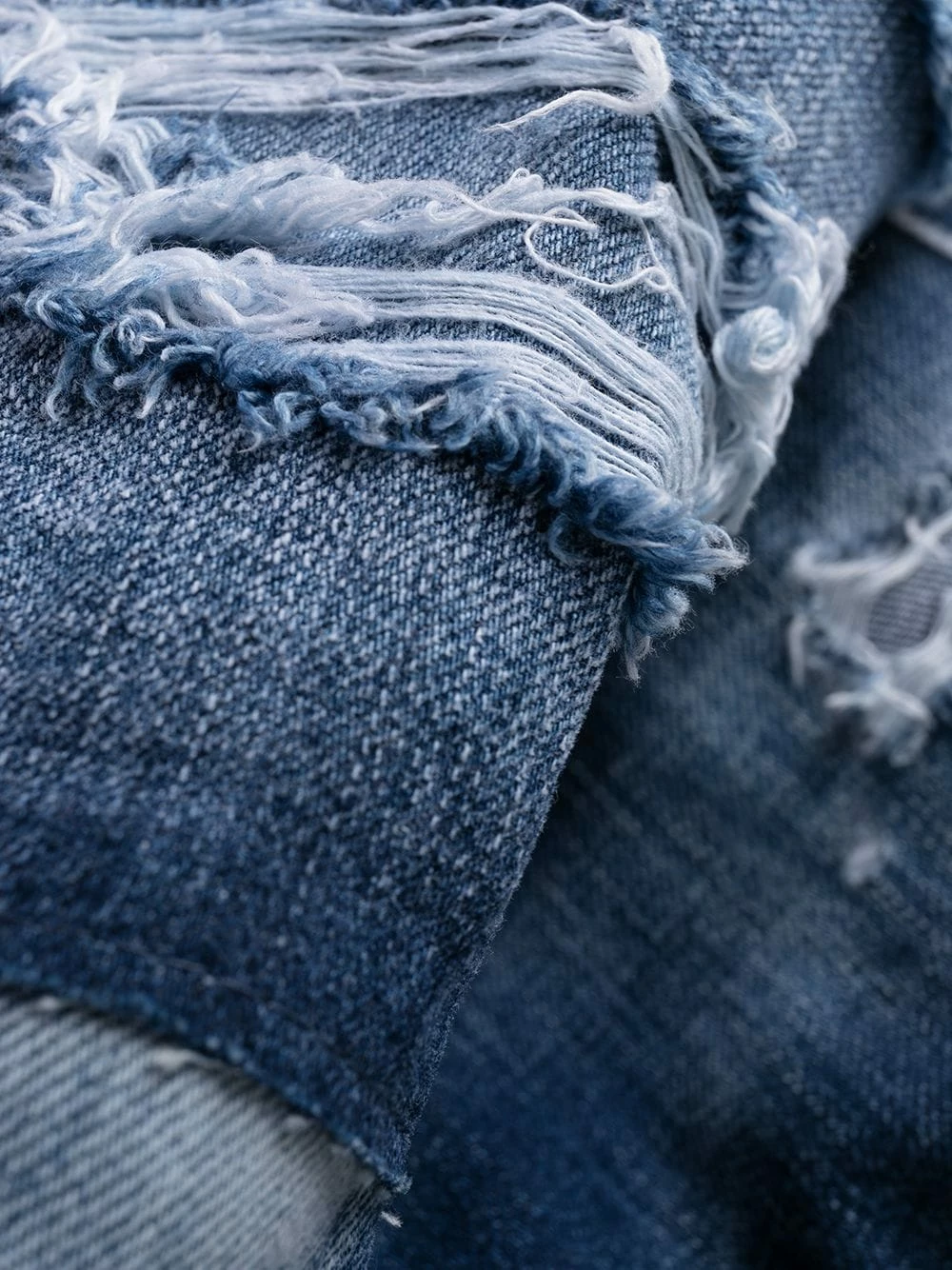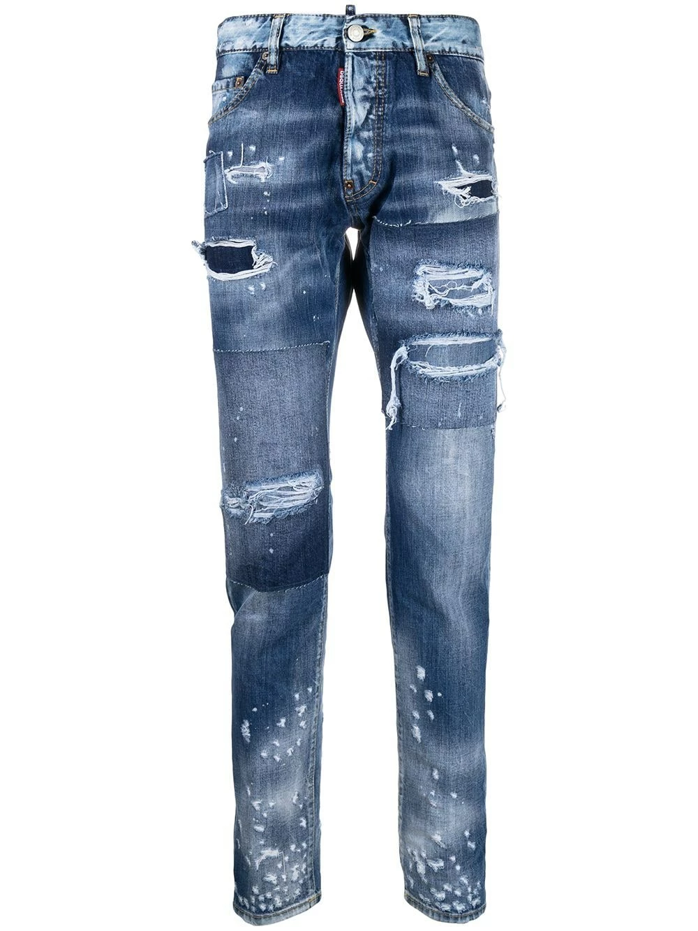 Effet délavé, finitions effilochées, détails d’empiècements, taille mi-haute, passants de ceinture, boutonnière sur le devant, patch logo sur le devant, 5 poches classiques, patch logo sur l’arrière, coupe slim. Couleur : bleu. Matière : denim de coton.