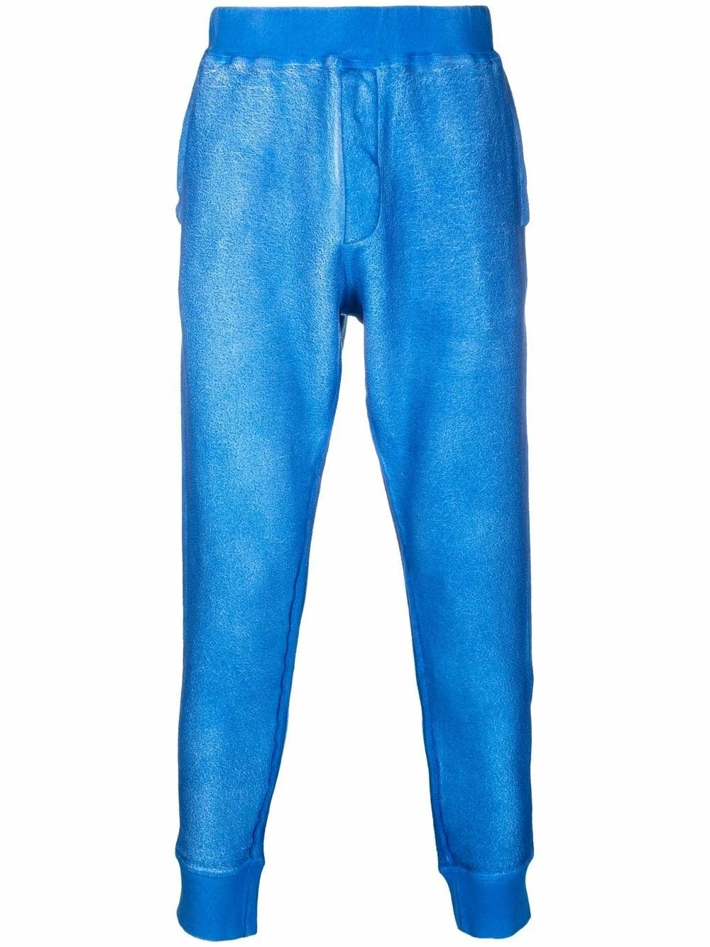Effet délavé, feutre, logo imprimé à l’arrière, ceinture élastique, poches latérales fendues, coupe fuselée, poignets élastiqués. Couleur : bleu. Matière : coton.