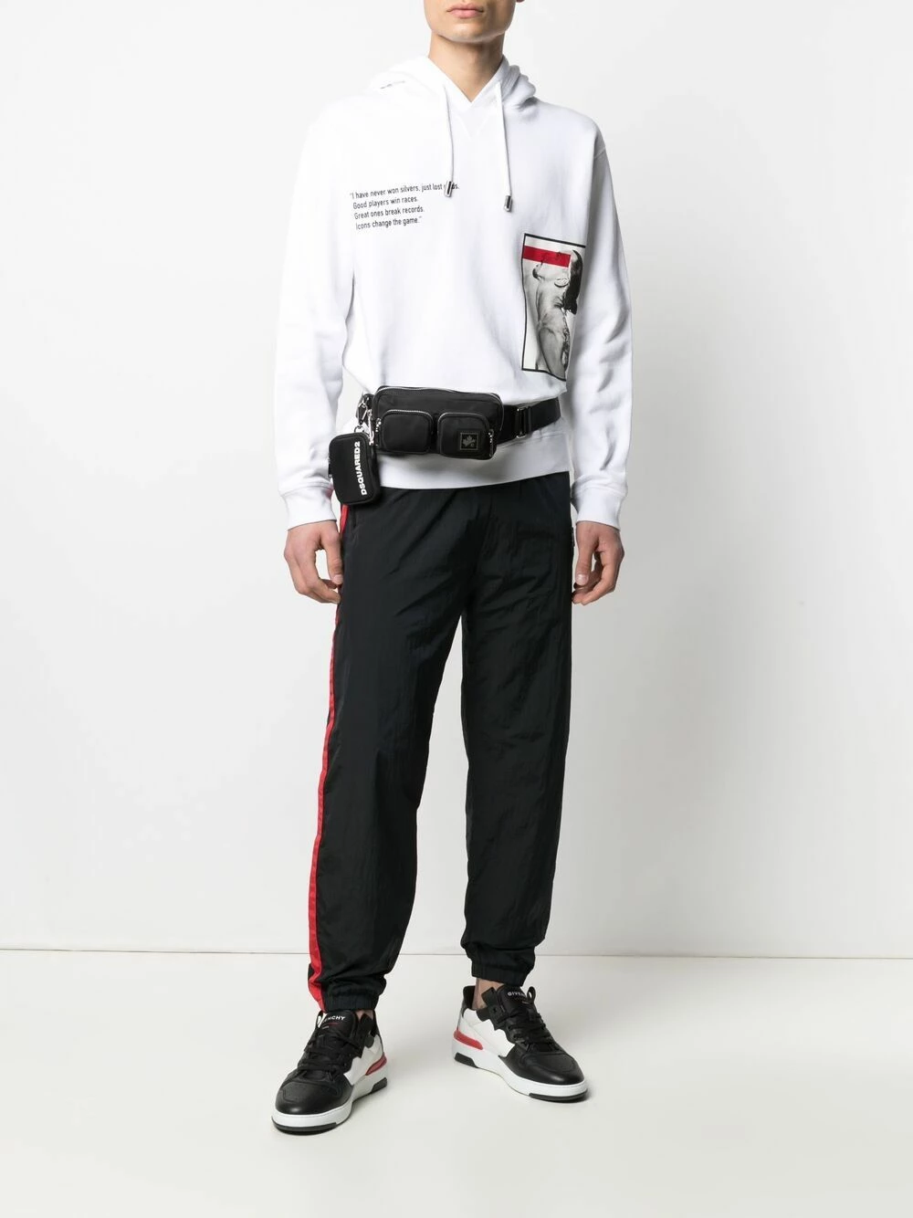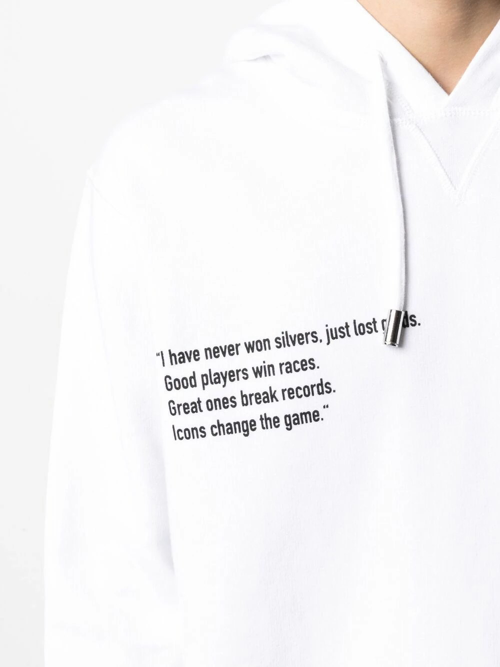 Motif Icon signature, imprimé photographique, slogan imprimé sur l’avant, capuche classique, manches longues. Couleur : blanc. Matière : coton.