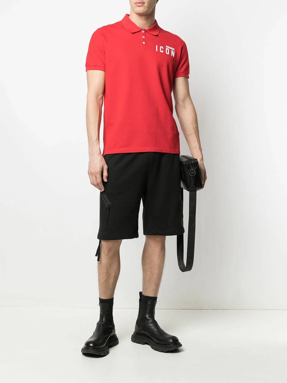 Logo imprimé à la poitrine, col polo, patte de boutonnage sur le devant, manches courtes, ourlet plus long au dos. Couleur : rouge.