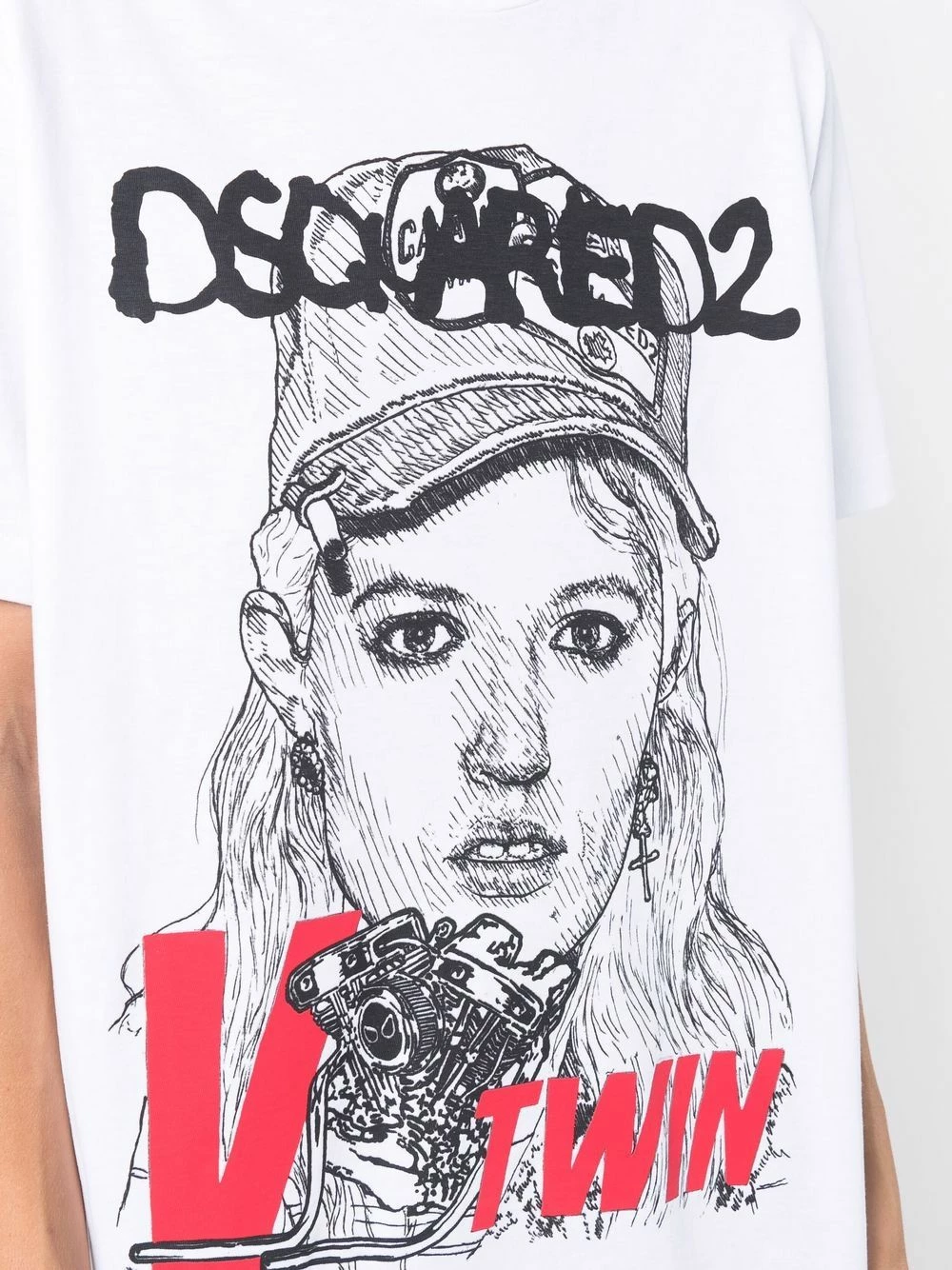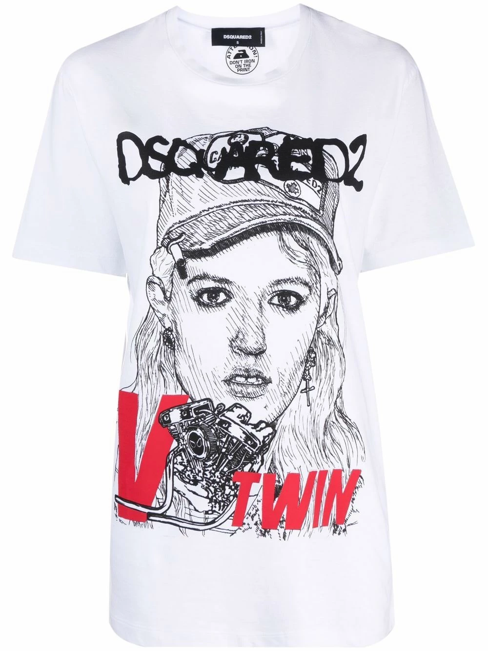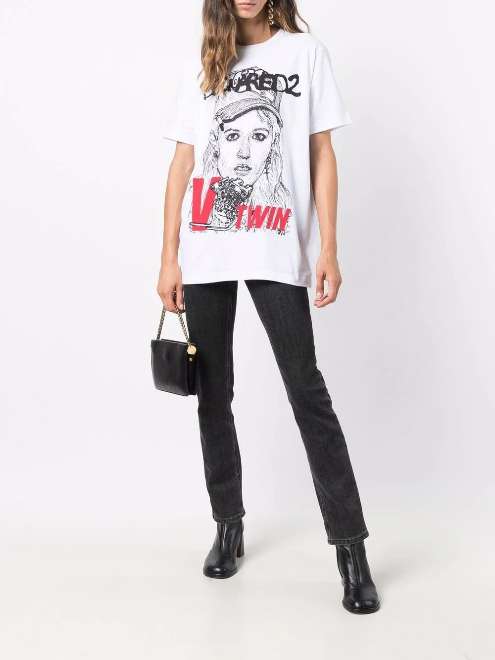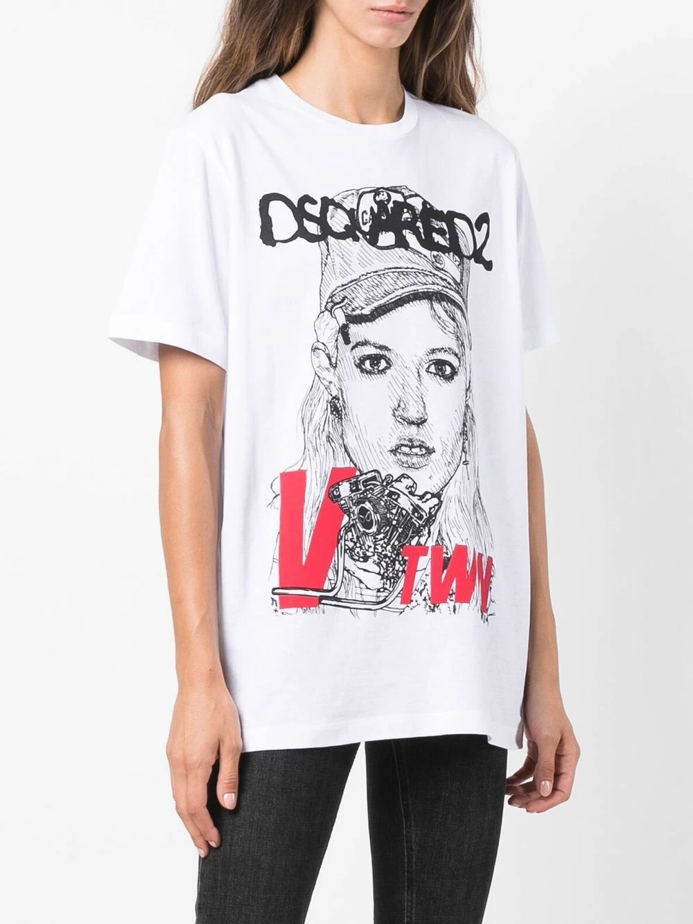 Imprimé façon illustration, encolure ronde, manches courtes, ourlet droit. Matière : coton.