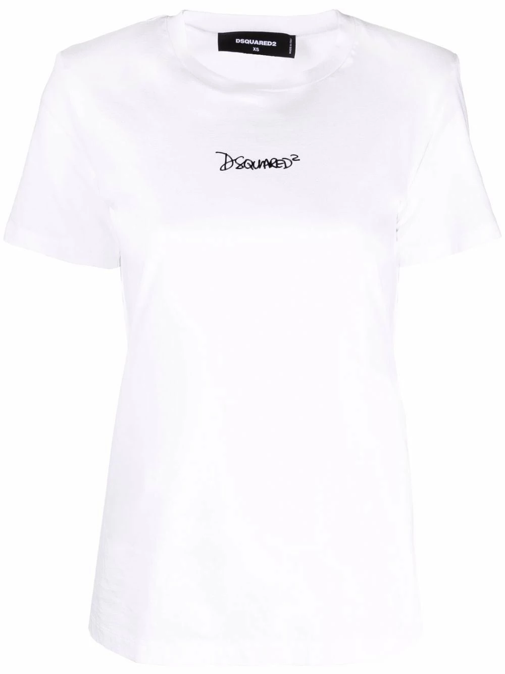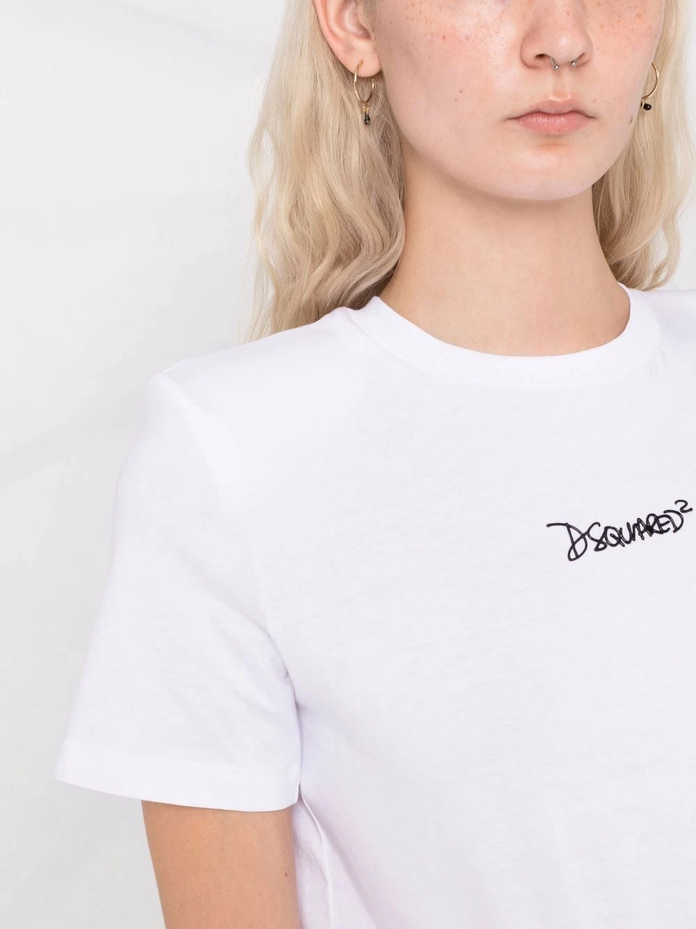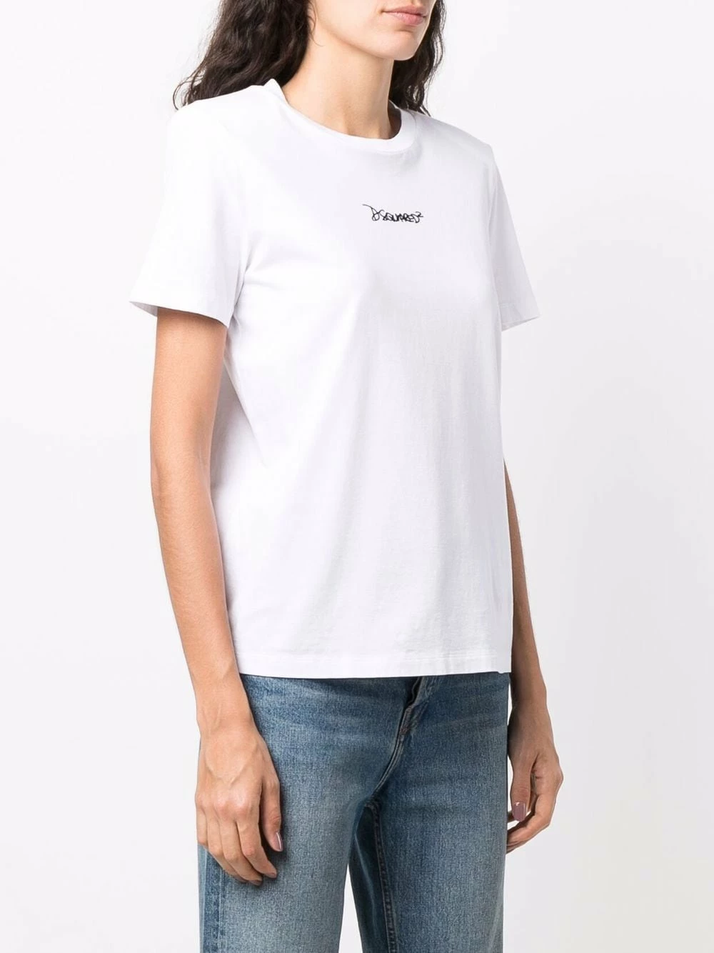 Logo imprimé à la poitrine, encolure ras du cou, manches courtes, ourlet droit. Couleur : blanc. Matière : coton.