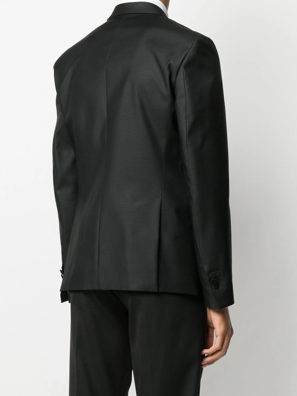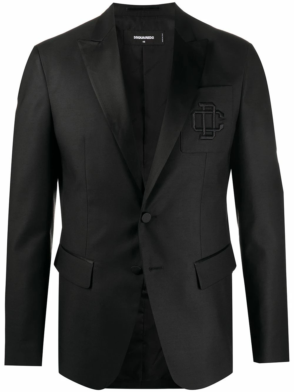 Blazer à logo brodé en laine vierge Dsquared2 avec revers crantés, boutonnière sur le devant, manches longues, poche poitrine, poches devant à rabat et double fente arrière. Couleur : noir.