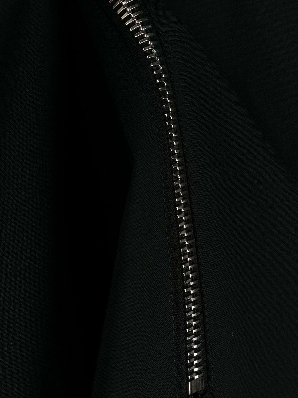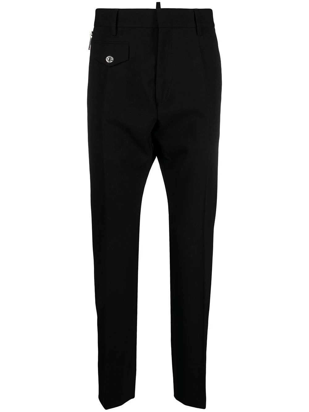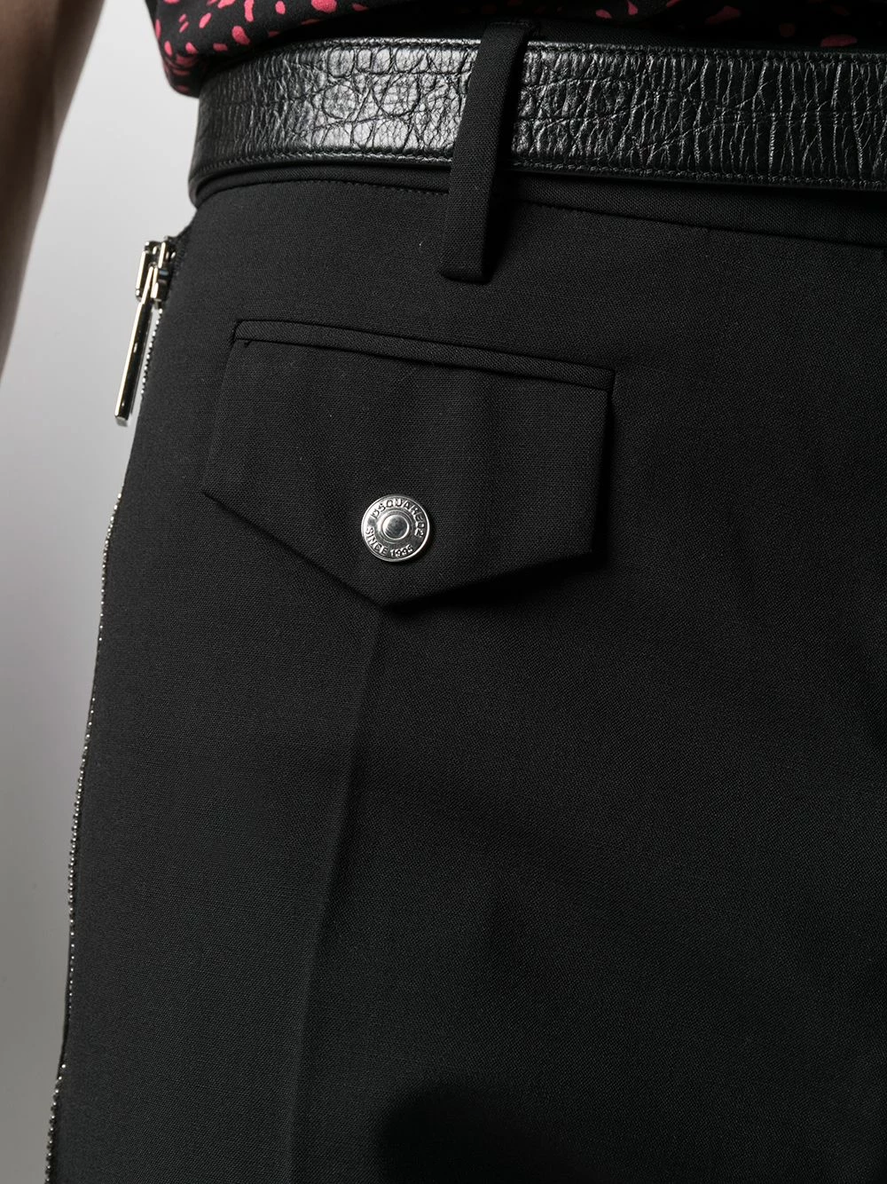 Coupe droite, fermeture dissimulée sur le devant, passants de ceinture, poche latérale zippée, poche devant à rabat, poches arrière passepoilées. Couleur : noir.
