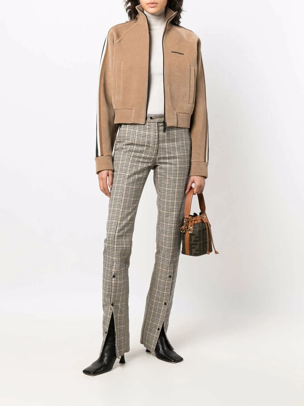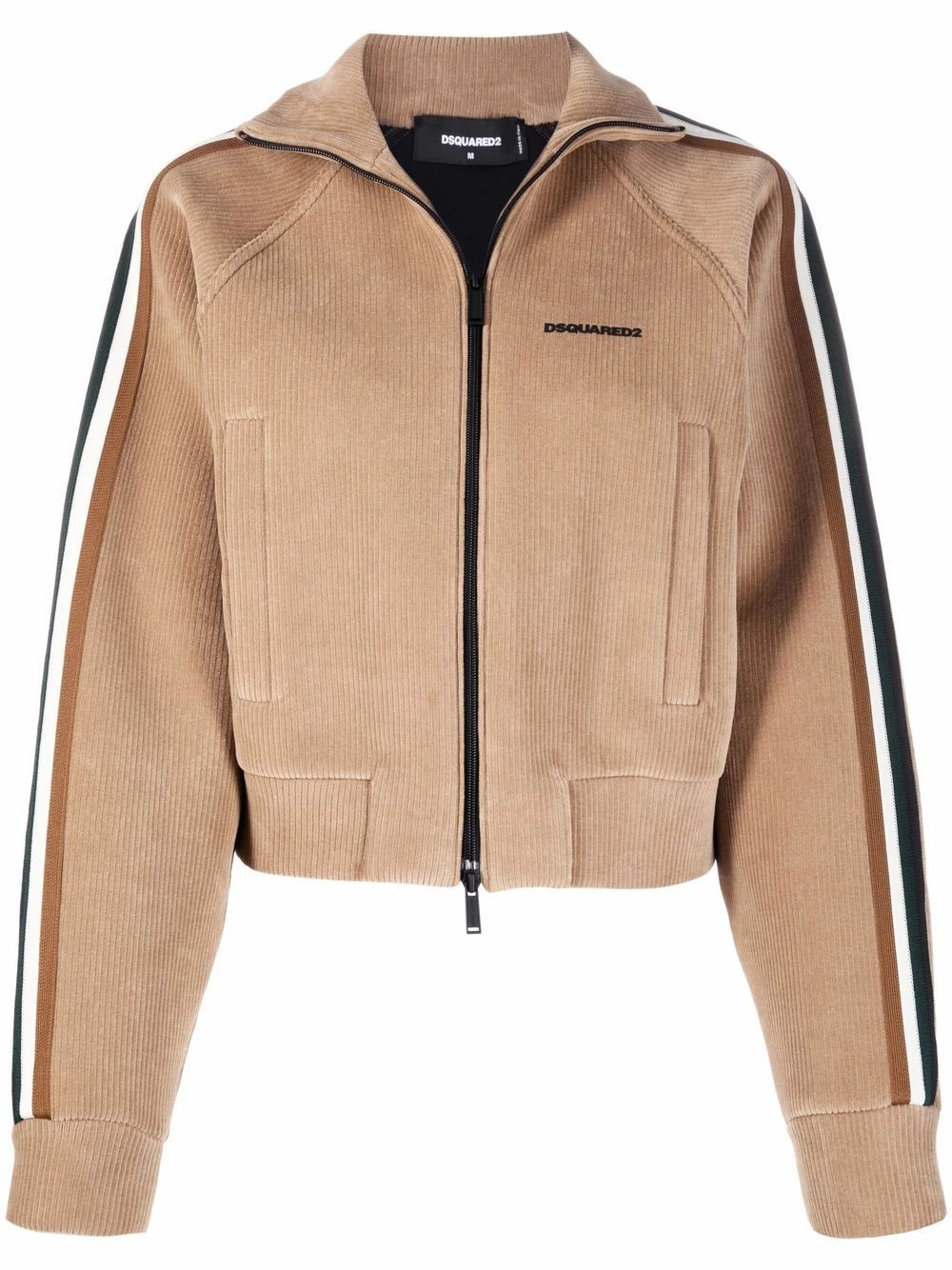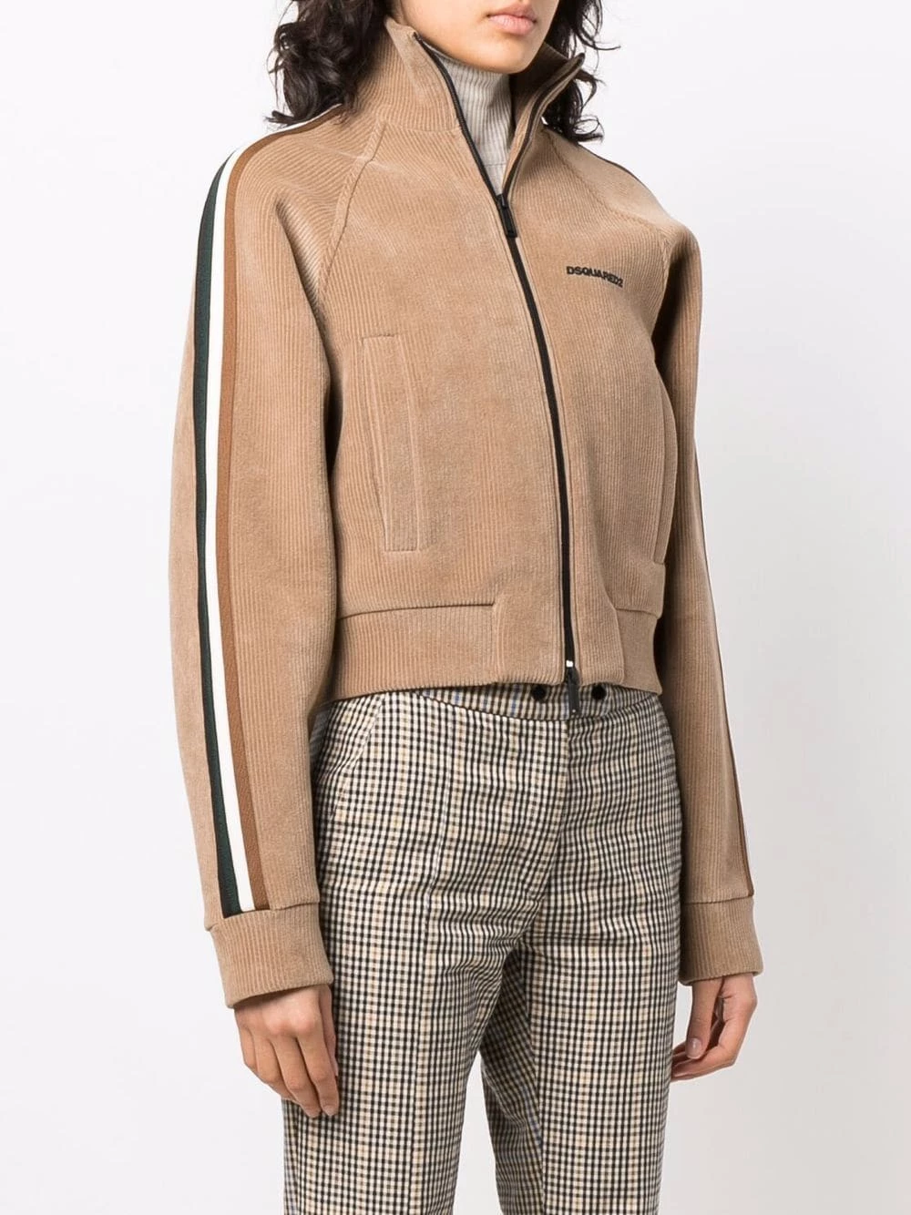 Velours côtelé, coupe courte, col montant, manches longues, détail de rayure latérale, deux poches latérales fendues, fermeture zippée devant, ourlet élastiqué, ourlet droit. Couleur : marron.