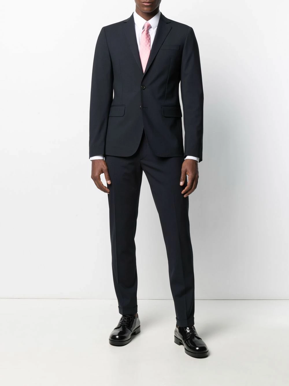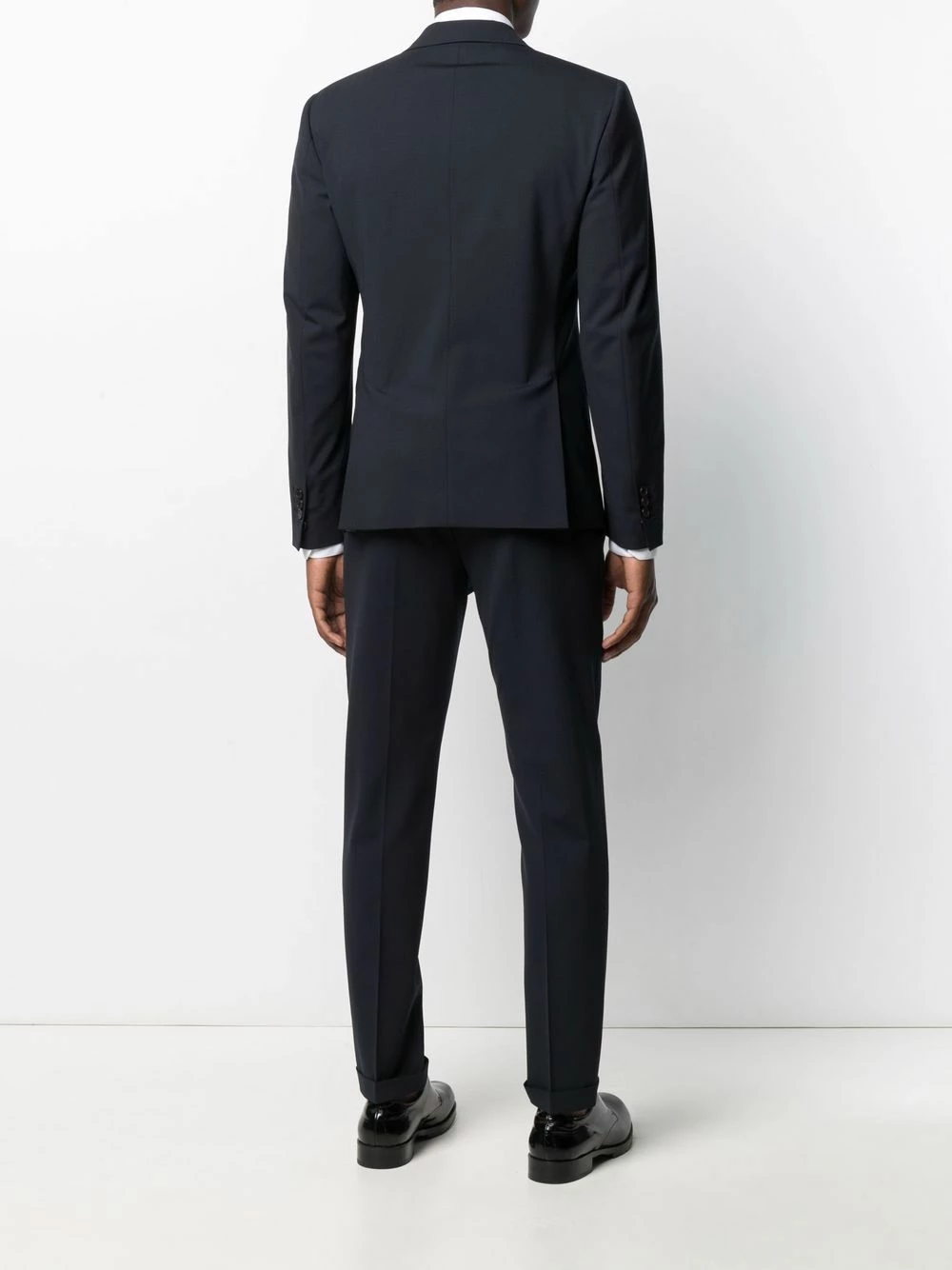 Revers crantés, boutonnière sur le devant, manches longues, deux poches à rabat sur le devant, double fente arrière, passants de ceinture, poches latérales fendues, deux poches arrières boutonnées.
