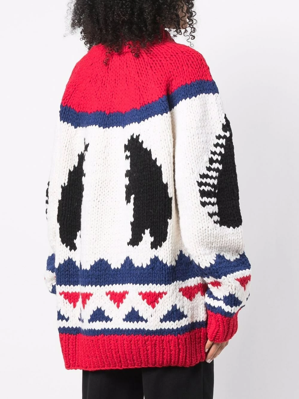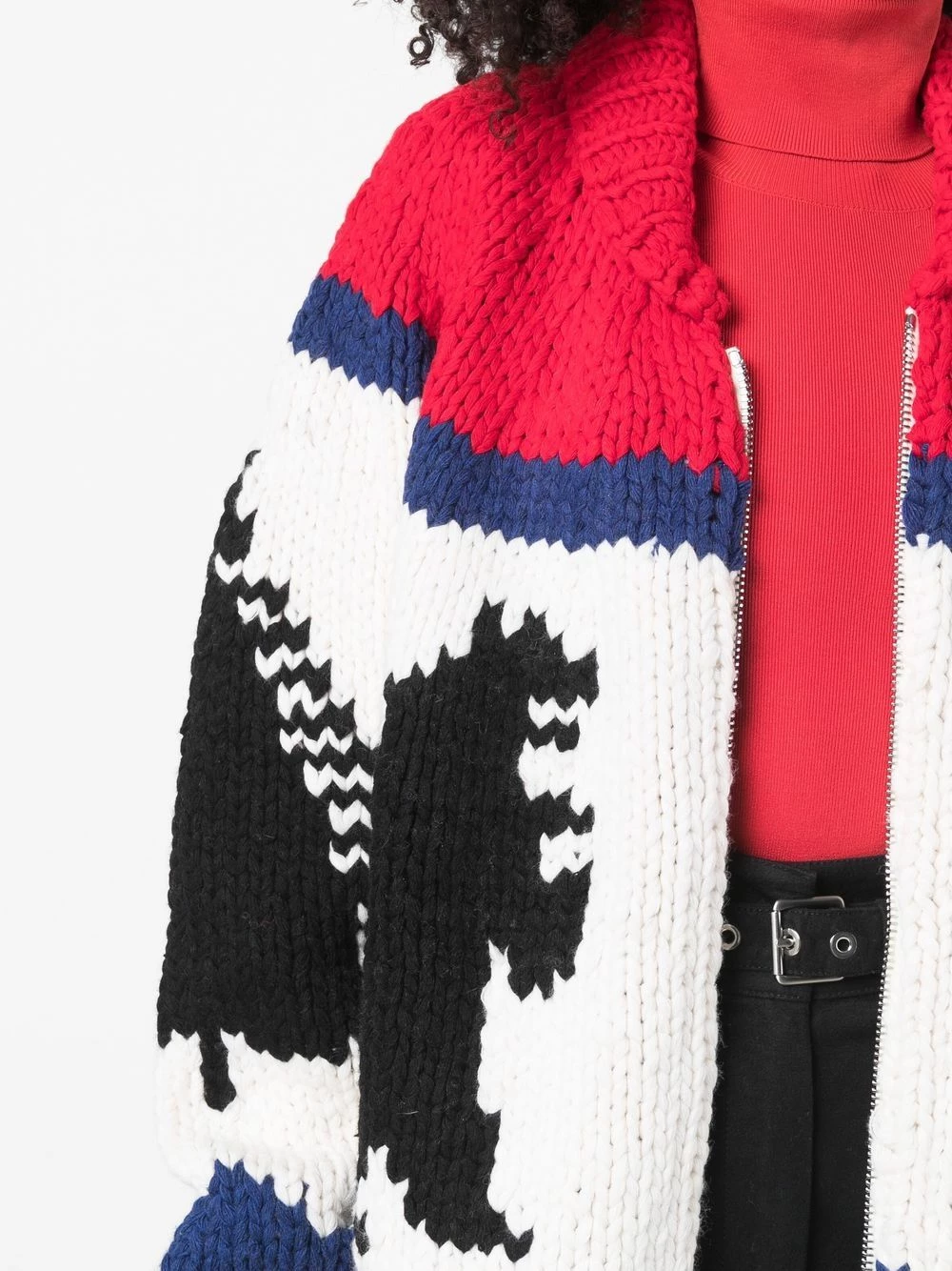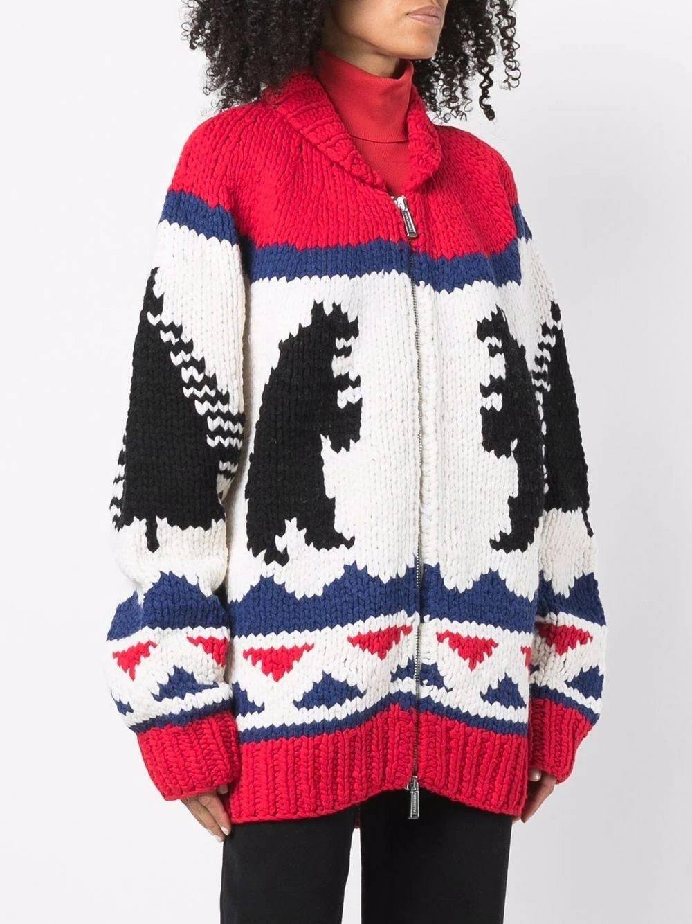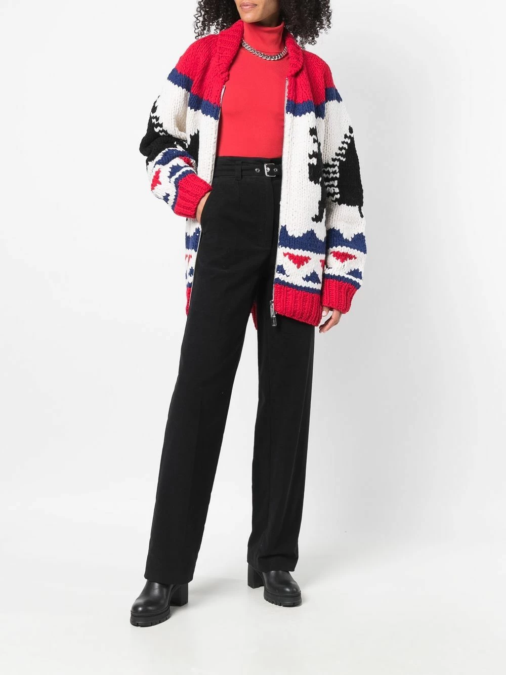 Motif intarsia, fermeture zippée à double sens sur le devant, poignets nervurés, col montant nervuré, ourlet nervuré. Couleur : rouge.