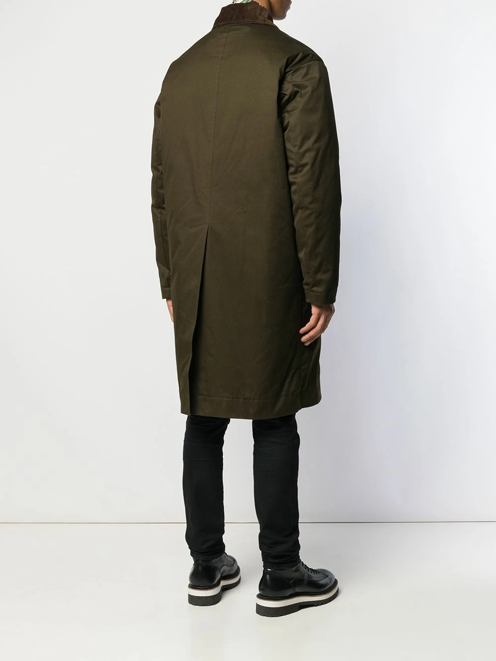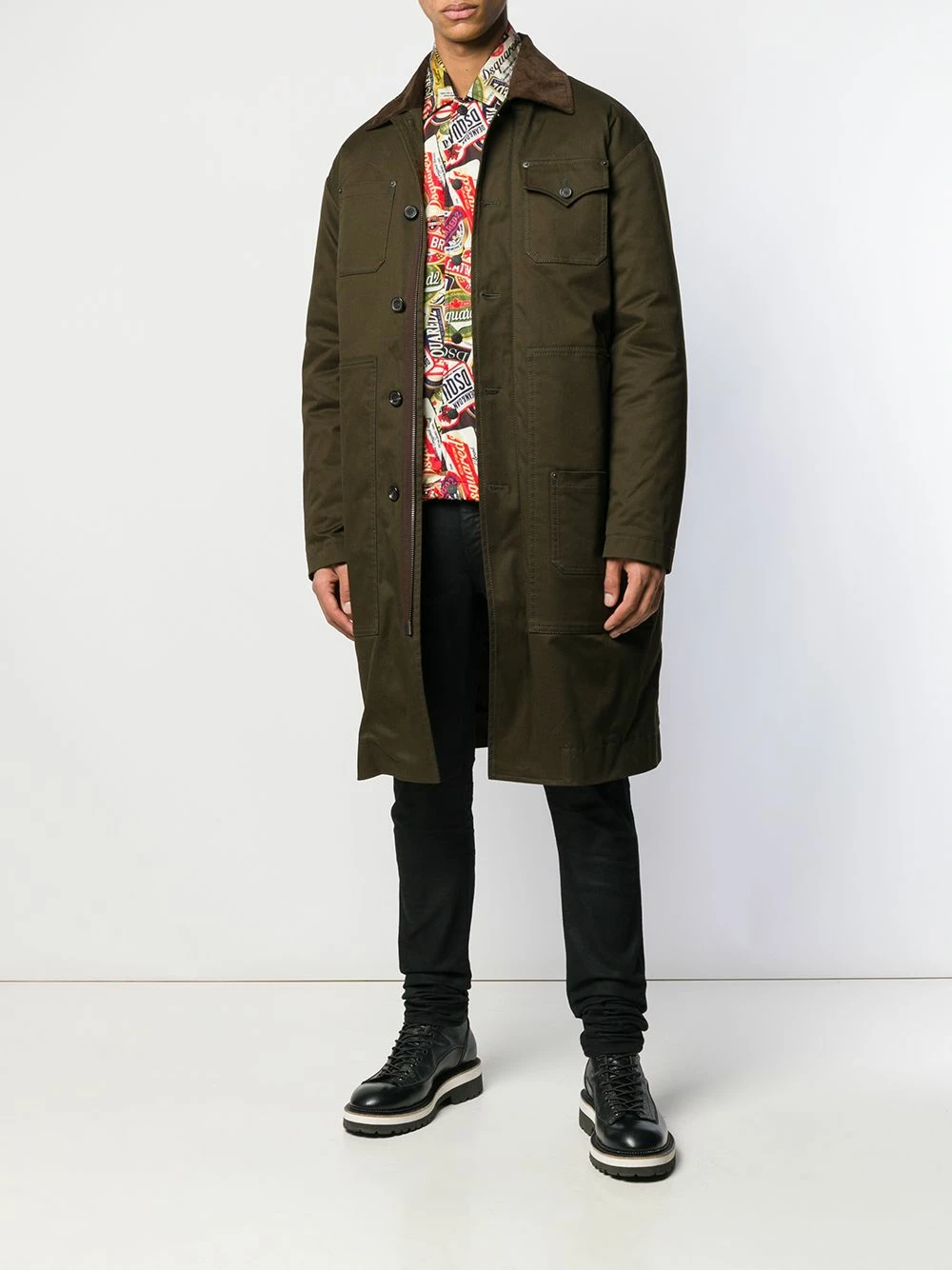 Parka à boutonnière devant en cotton blend Dsquared2 avec revers classiques, boutonnière sur le devant, manches longues, poches latérales et coupe midi. Couleur : vert.