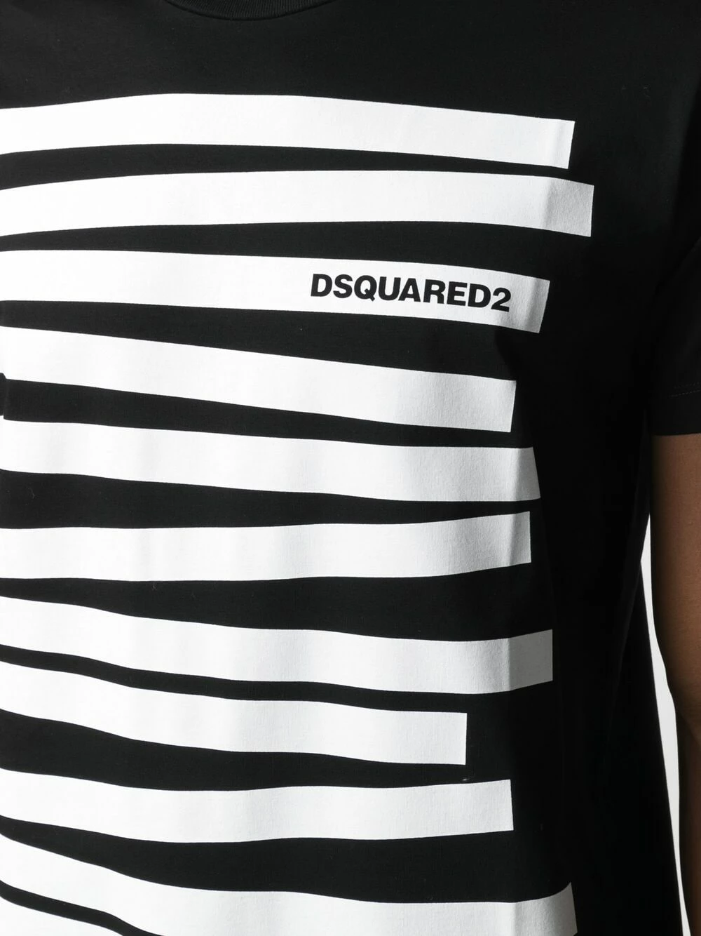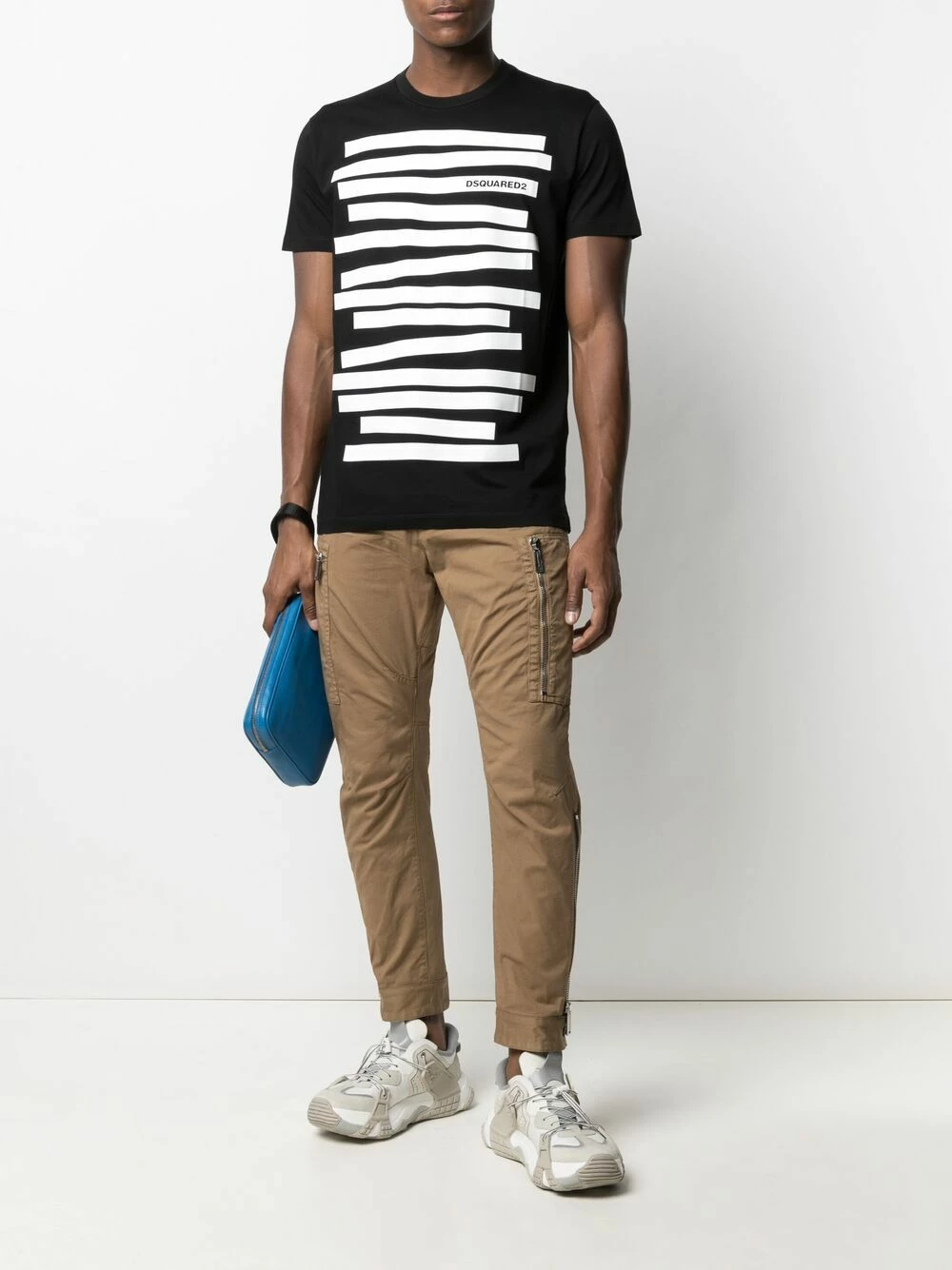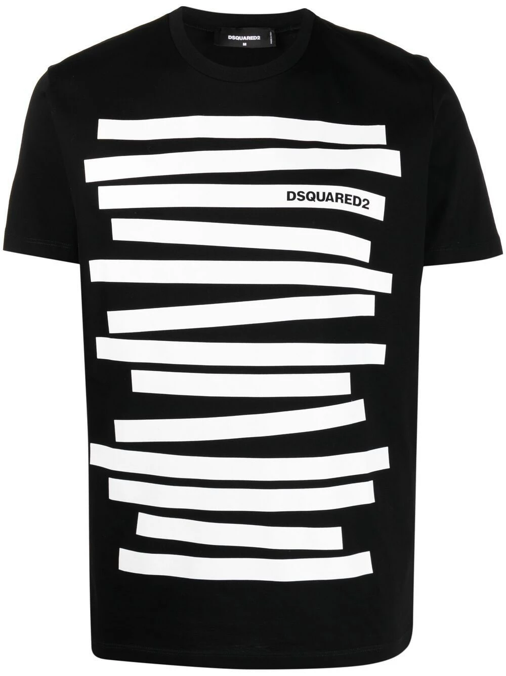 Rayures horizontales imprimées, logo imprimé à la poitrine, encolure ras du cou, manches courtes. Couleur : noir. Matière : coton.