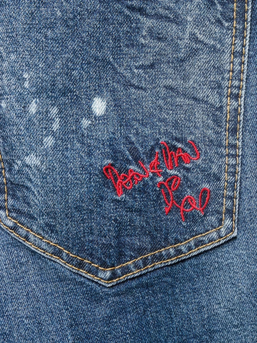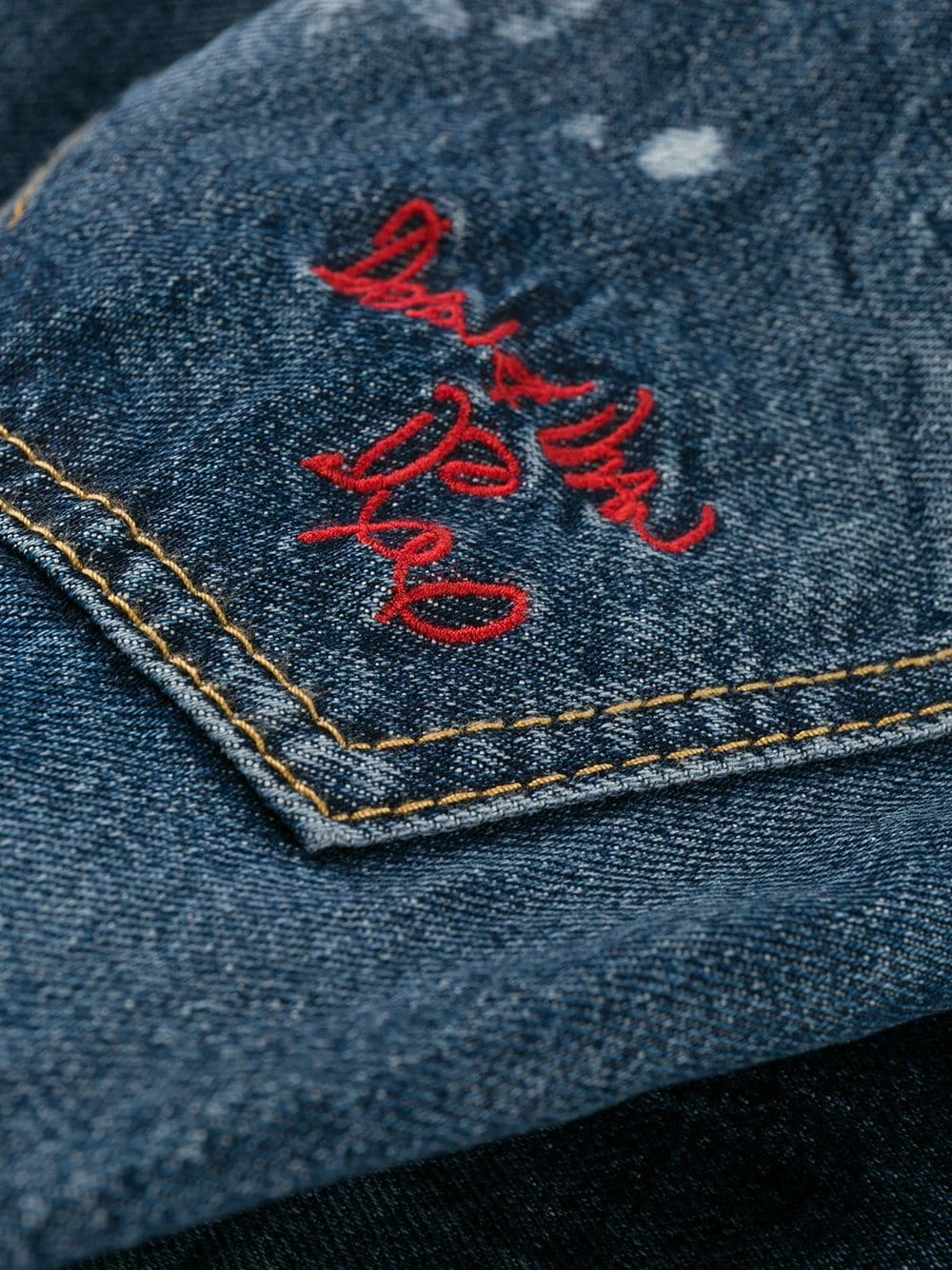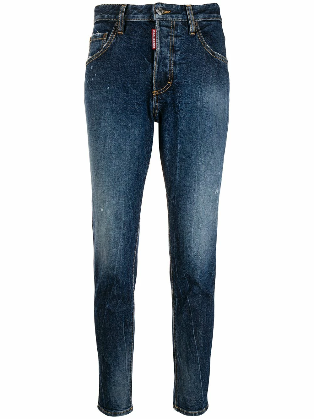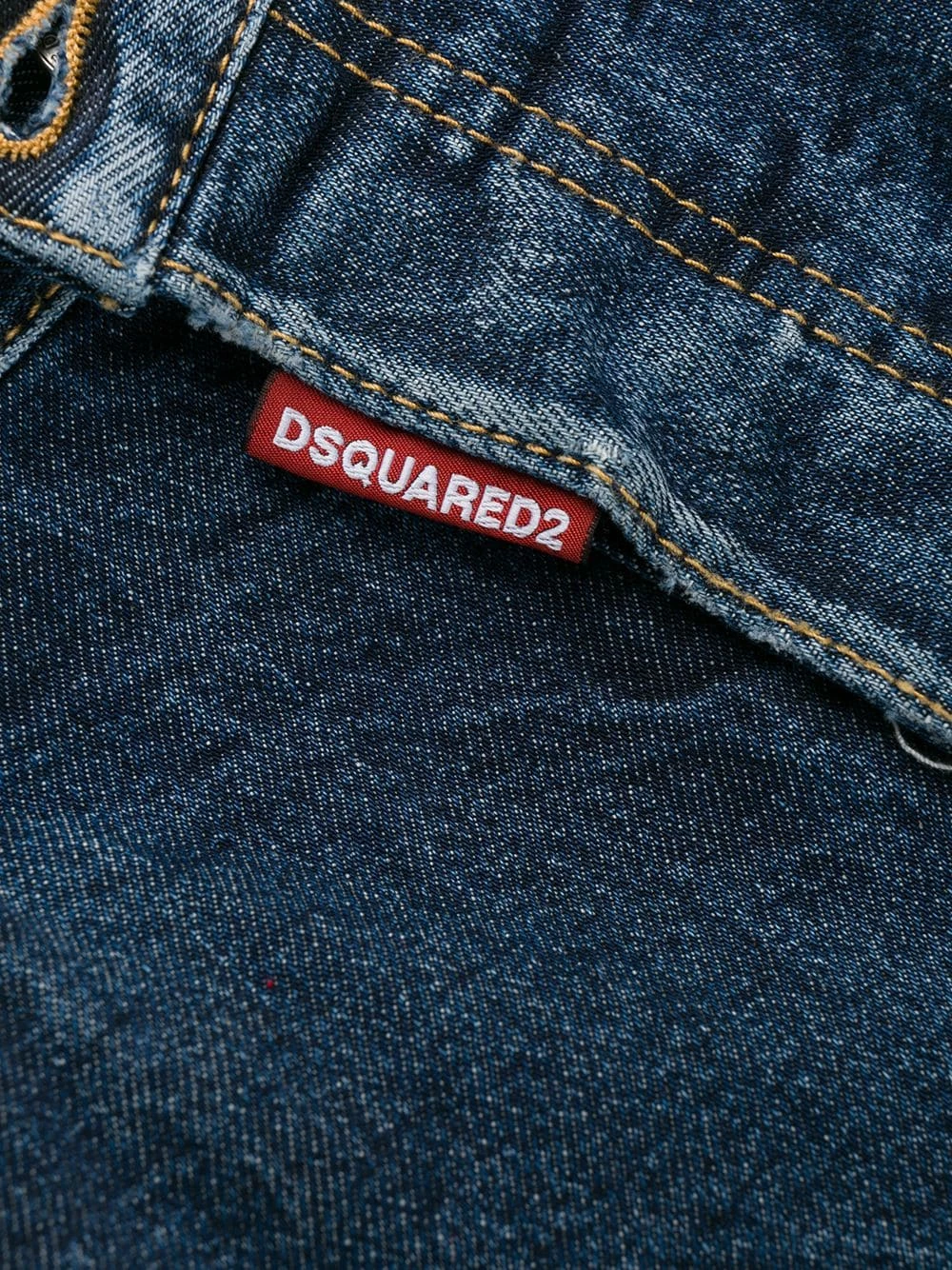 Jean à logo appliqué Dsquared2 avec coupe skinny, bouton et zip, fermeture scratch, poches devant, poches arrière plaquées, détails de surpiqûres et détail usé. Couleur : bleu.
