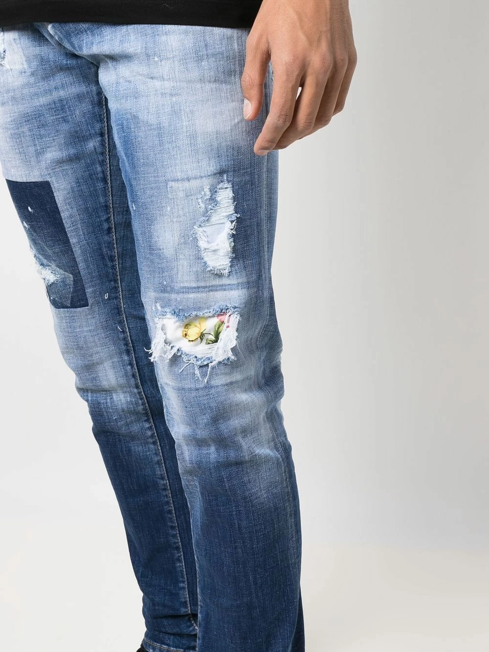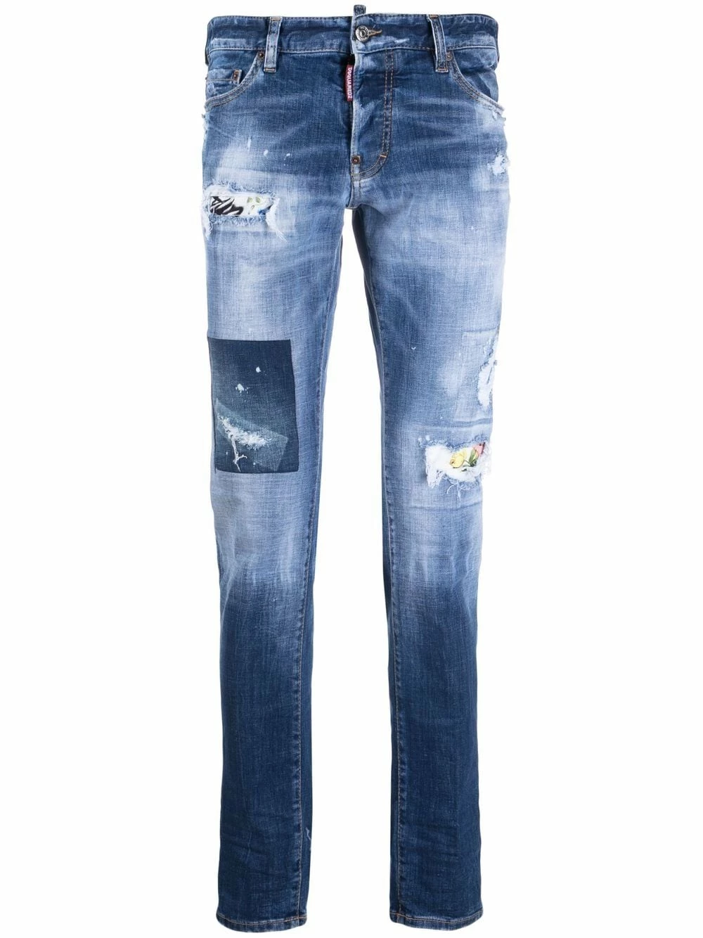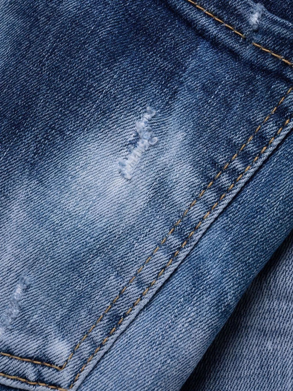 Effet usé, coupe droite, fermeture boutonnée, passants de ceinture, cinq poches classiques. Couleur : bleu. Matière : coton mélangé.