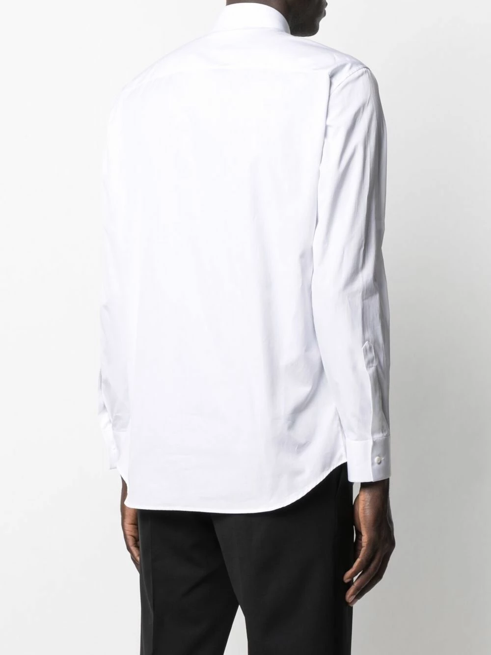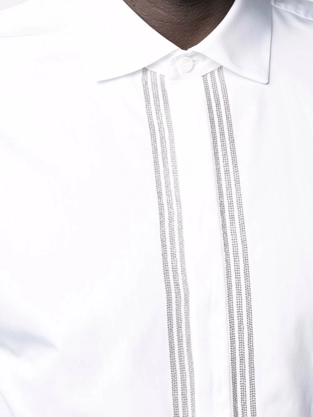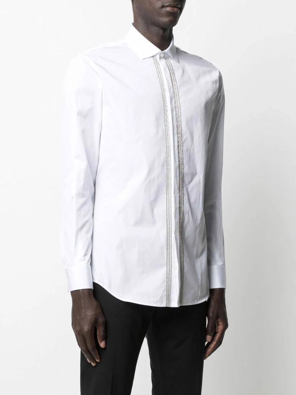 Détails de clous argentés, col classique, manches longues, fermeture dissimulée sur le devant, ourlet incurvé. Couleur : blanc. Matière : coton.