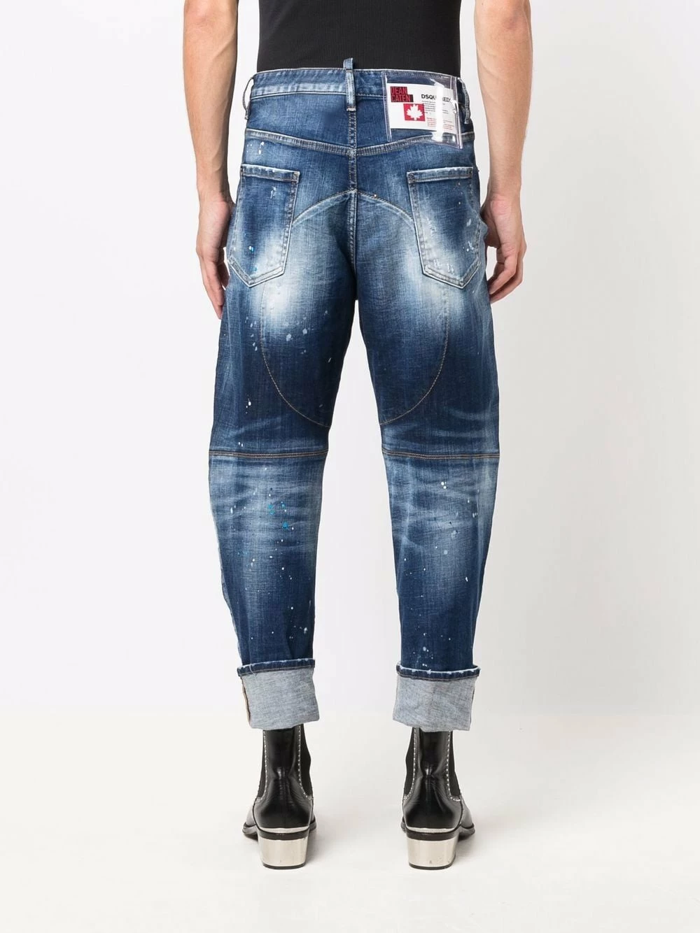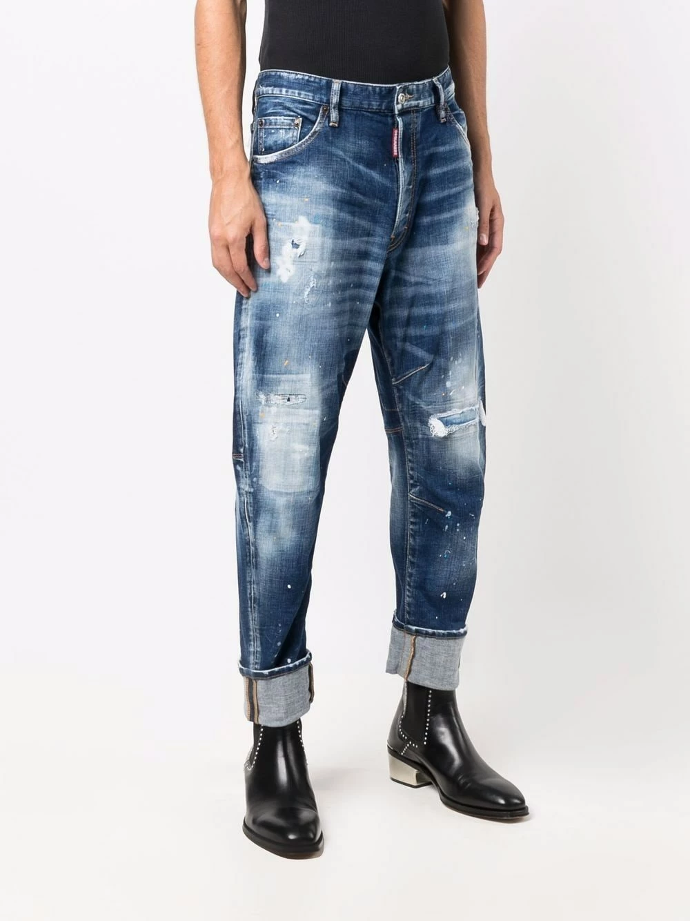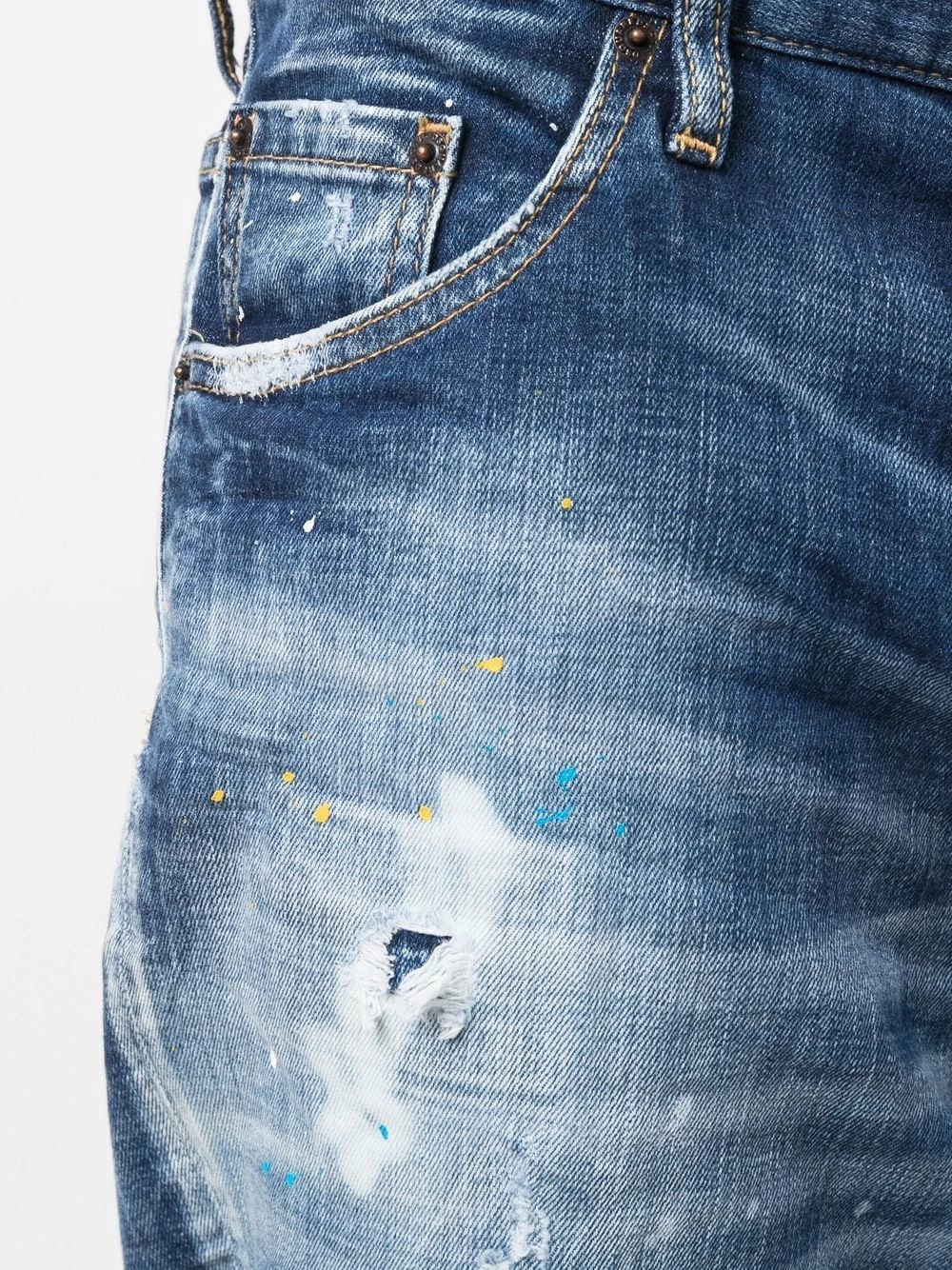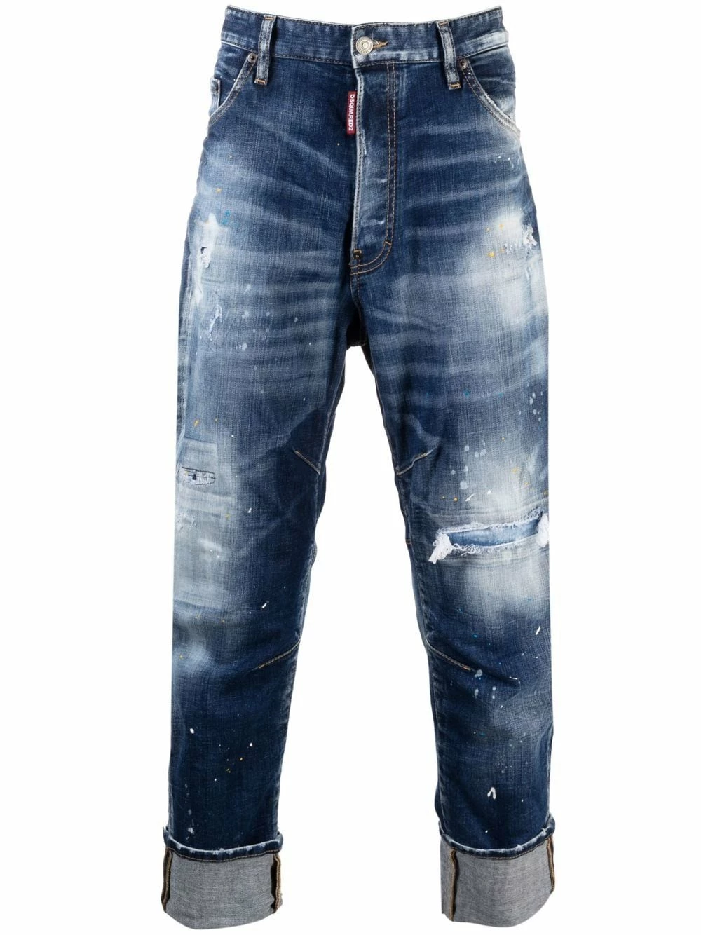 Taille mi-haute, coupe ample, longueur crop, effet taches de peinture, finitions effilochées, effet délavé, effet usé, passants de ceinture, fermeture boutonnée, cinq poches classiques, patch logo sur l’arrière, ourlet retroussé. Couleur : bleu. Matière : coton.