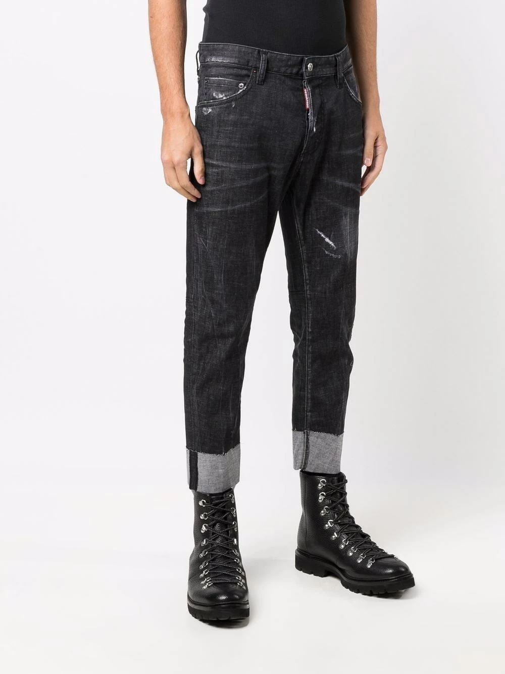 Effet usé, coupe slim, fermeture boutonnée, passants de ceinture, cinq poches classiques. Couleur : noir.