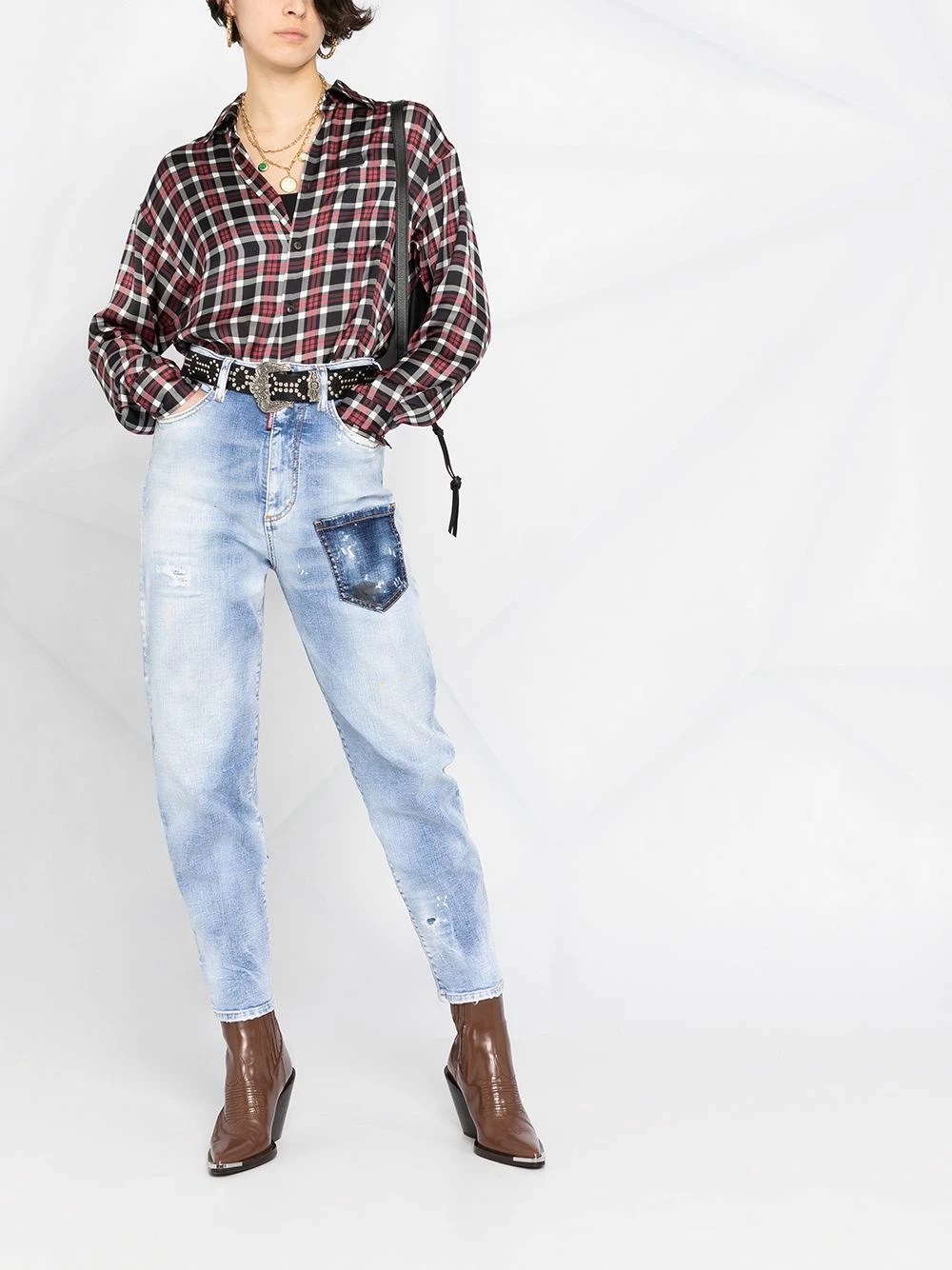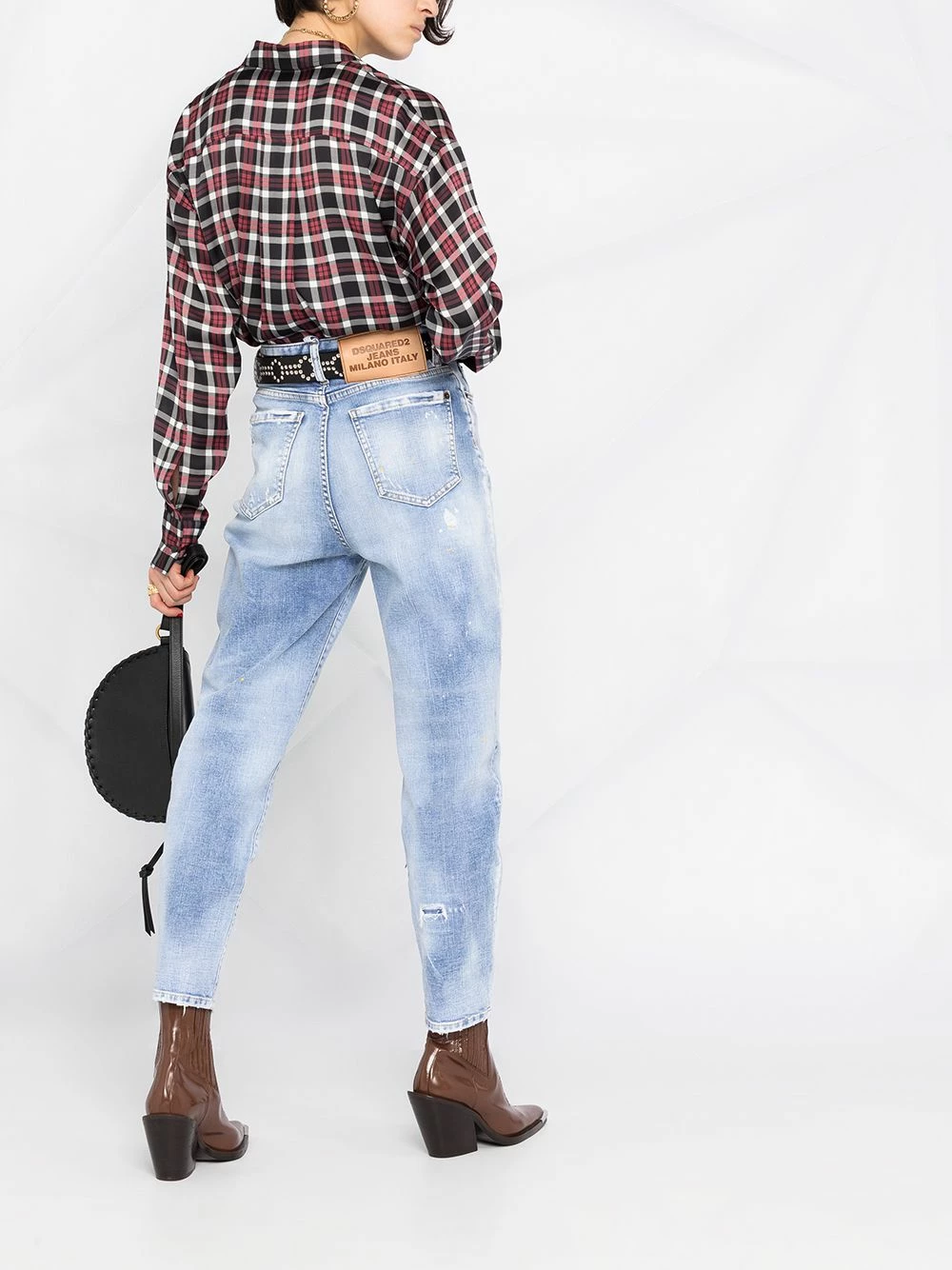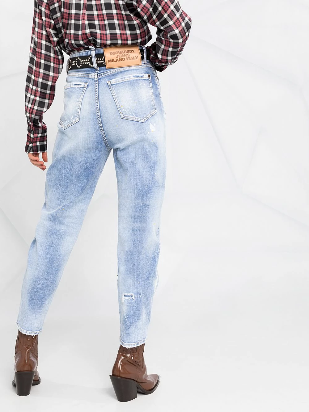 Taille haute, effet usé, effet délavé, boutonnière sur le devant, passants de ceinture, 5 poches classiques, coupe fuselée.