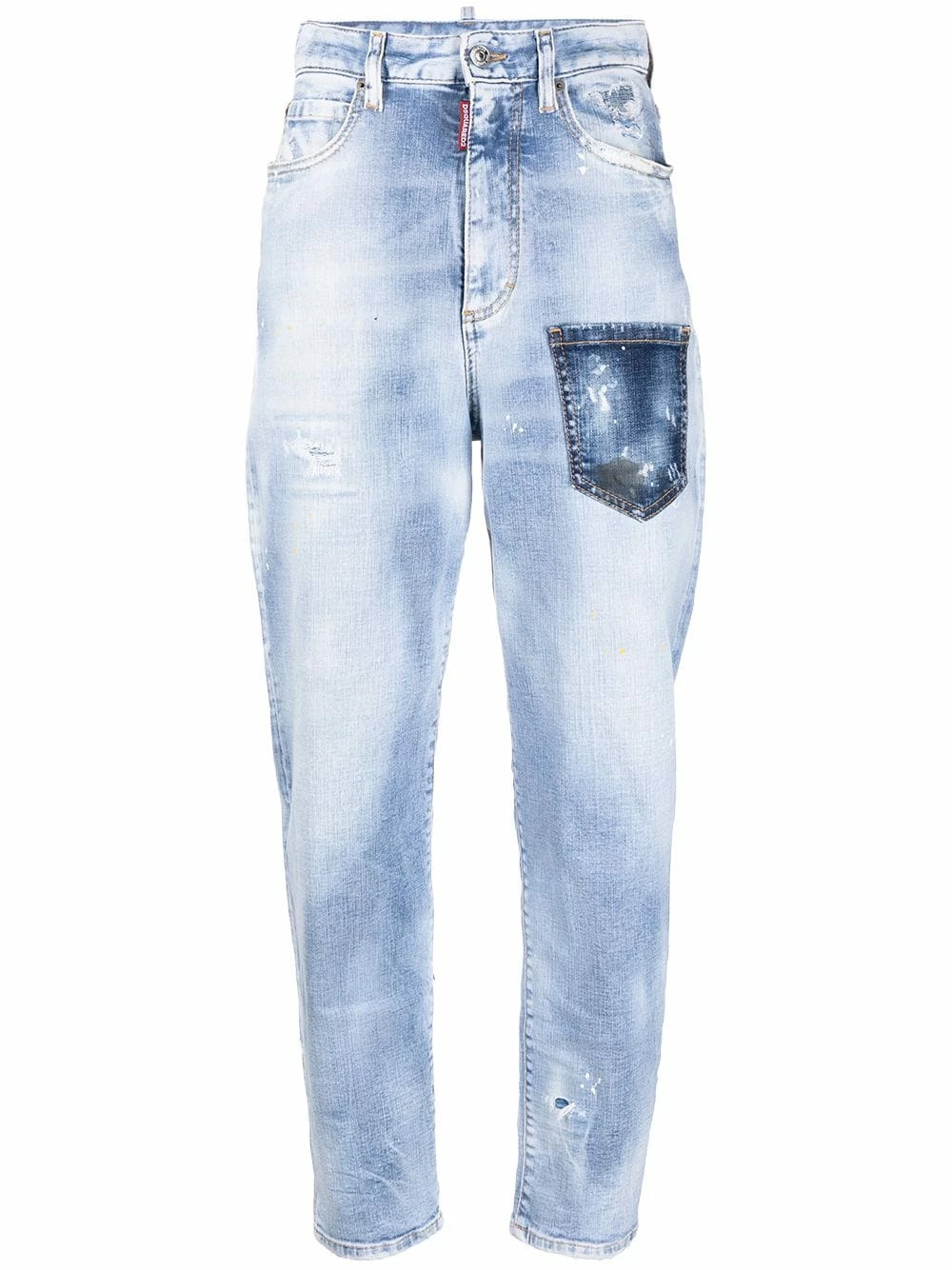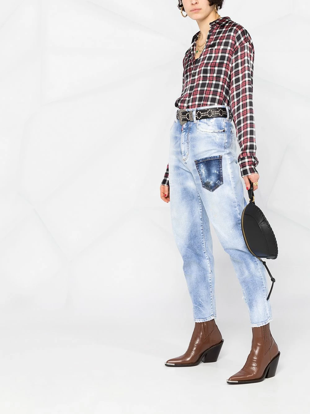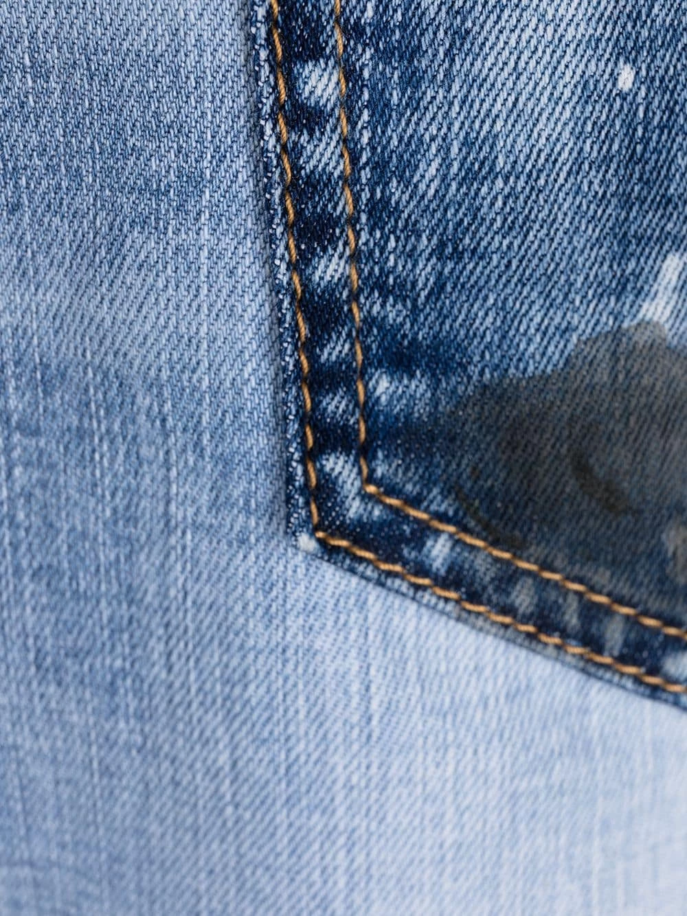 Taille haute, effet usé, effet délavé, boutonnière sur le devant, passants de ceinture, 5 poches classiques, coupe fuselée.