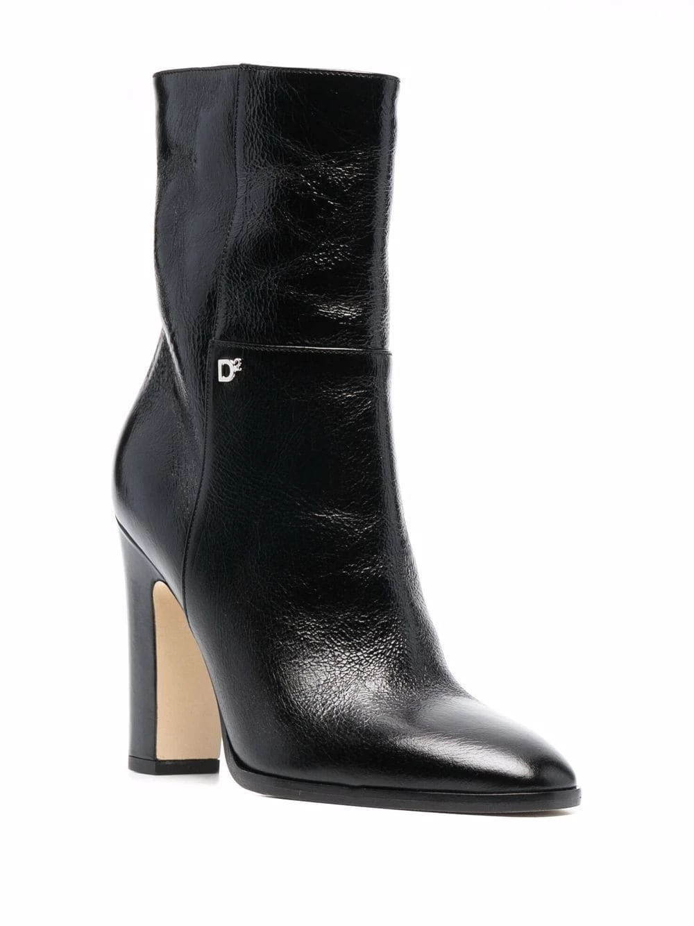 Hauteur cheville, plaque logo argentée, fermeture zippée sur le côté, bout rond, semelle intérieure à logo, talon haut épais. Couleur : noir. Matière : cuir.