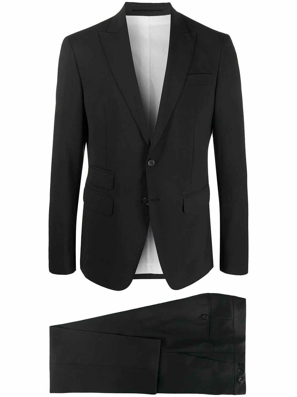 Revers crantés, poche poitrine passepoilée, boutonnière sur le devant, manches longues, deux poches plaquées avant, double fente arrière, fermeture dissimulée sur le devant, poches latérales fendues, poches arrière passepoilées, coupe ajustée. Couleur : noir.