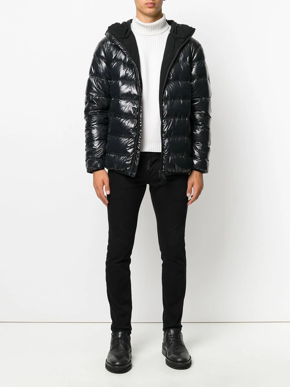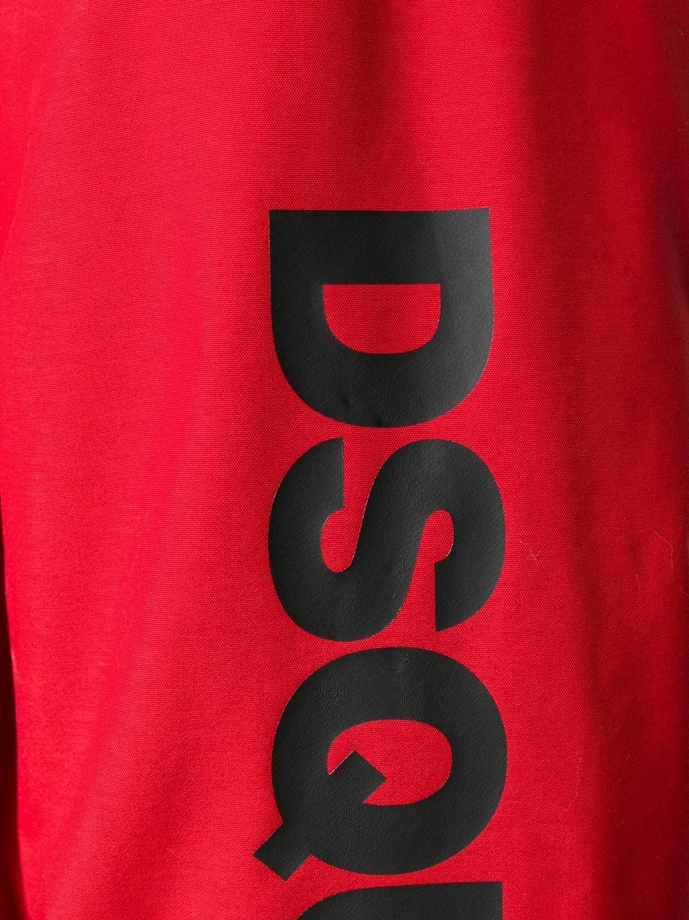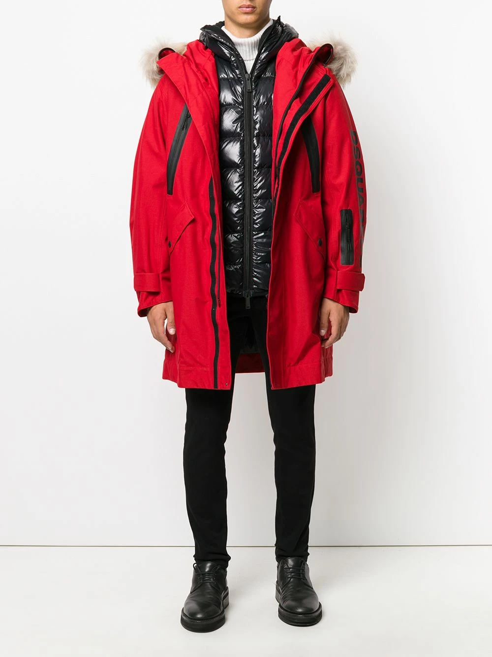 Red cotton logo-print hooded coat from DSQUARED2 featuring a fur trimmed hood, a concealed zip fastening, front flap pockets, front zipped pockets, long sleeves, press stud cuffs, a logo to the arm and a straight hem.