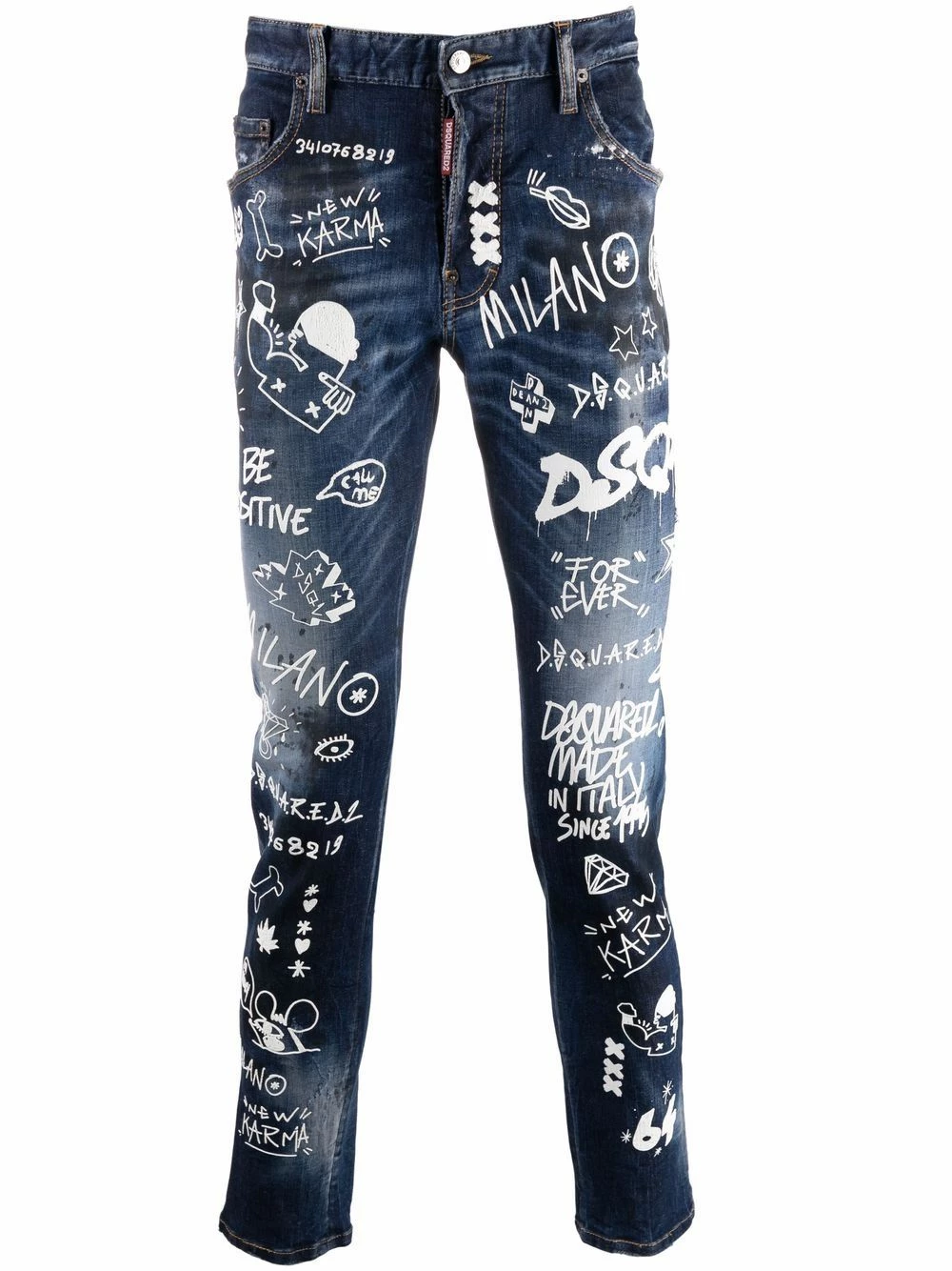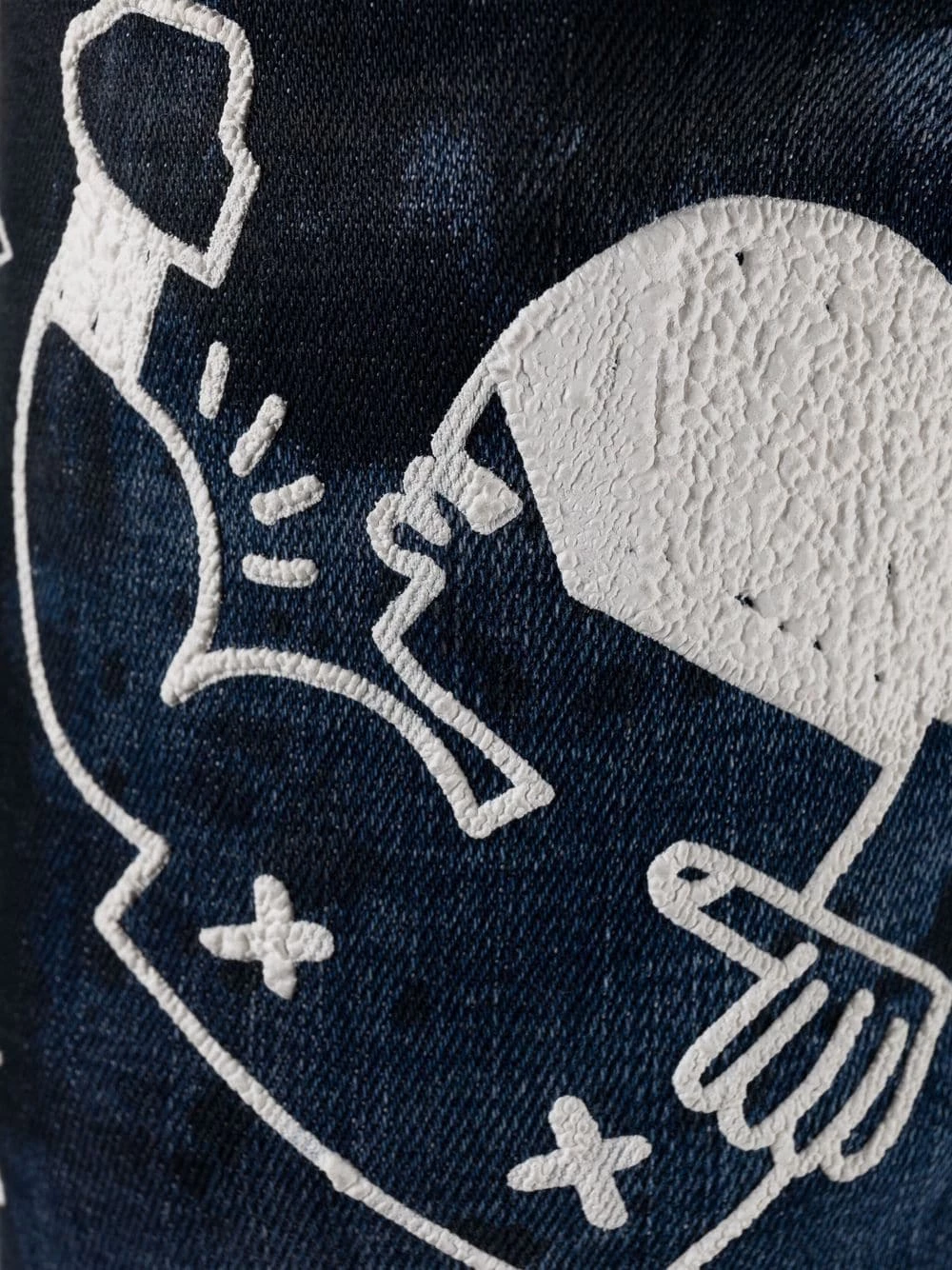 Taille mi-haute, fermeture à zip et boutons sur le devant, cinq poches classiques, passants de ceinture, imprimé graphique, slogan imprimé, coupe droite, patch logo sur l’arrière. Matière : coton.