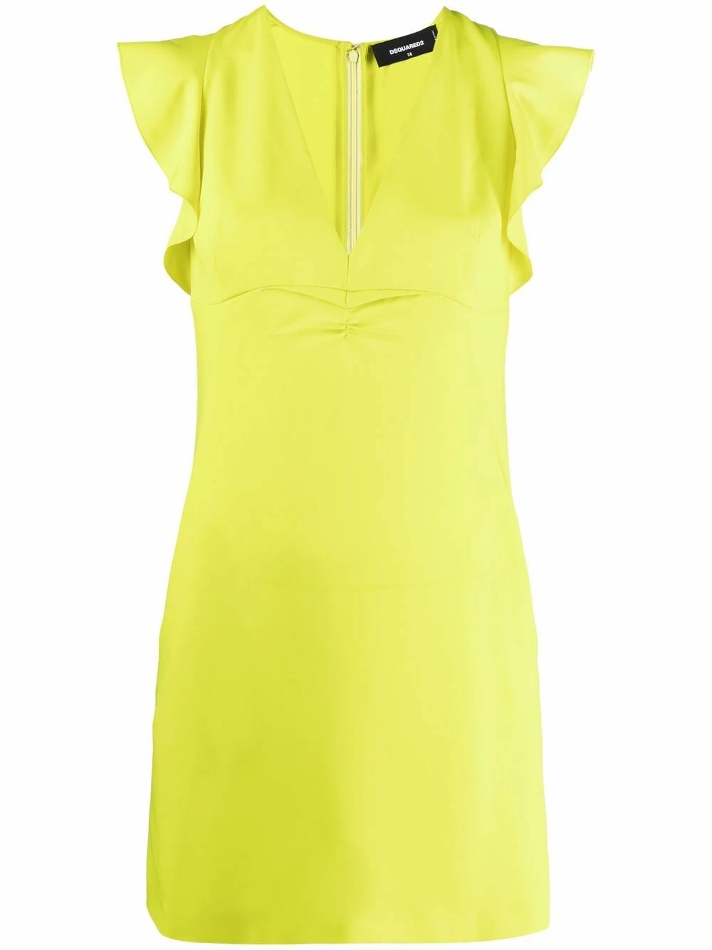 Col v profond, mancherons, détails de fronces, poches plaquées latérales, fermeture zippée dissimulée à l’arrière, coupe évasée, ourlet droit, longueur au dessus du genou. Couleur : jaune.