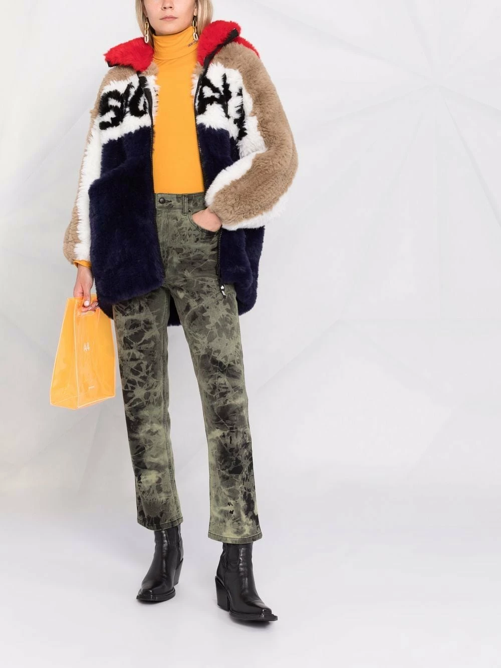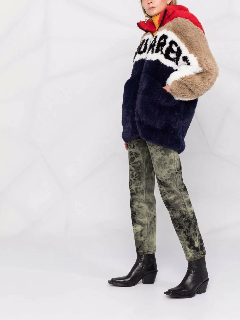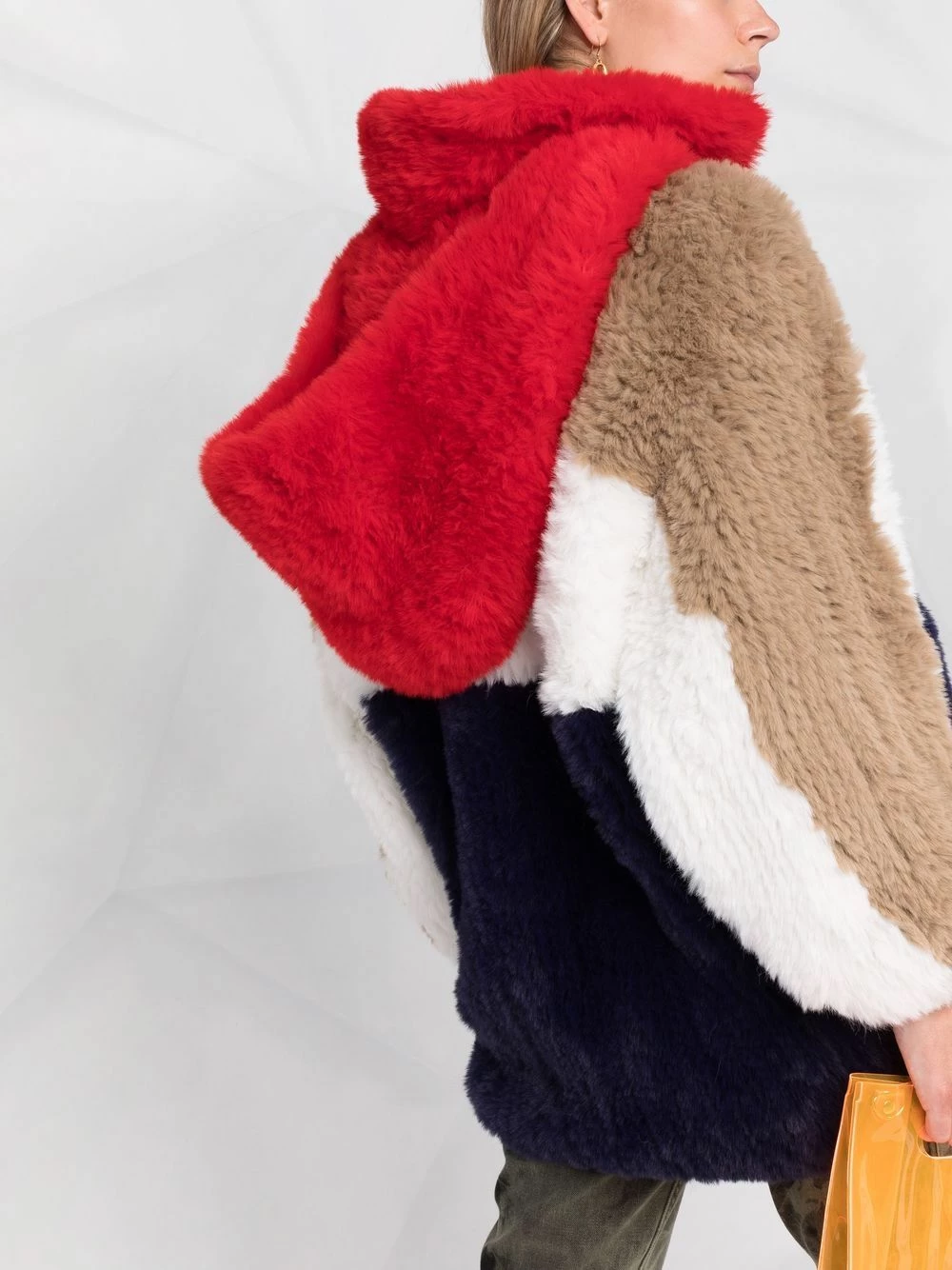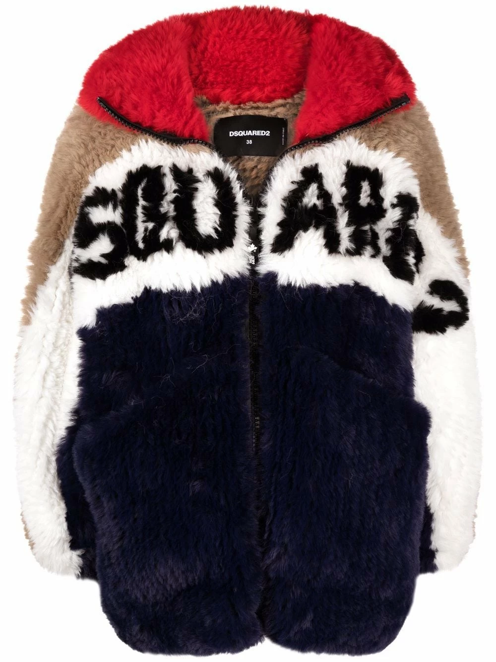 Logo imprimé sur le devant, design colour block, col montant, capuche classique, fermeture zippée devant, manches longues, deux poches plaquées avant. Matière : fourrure artificielle.
