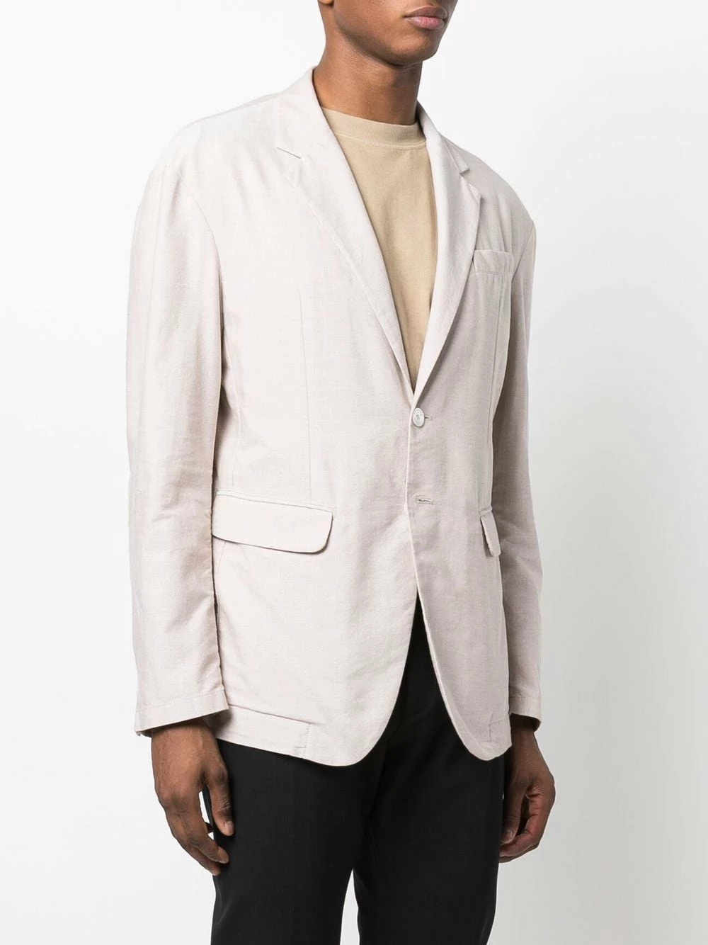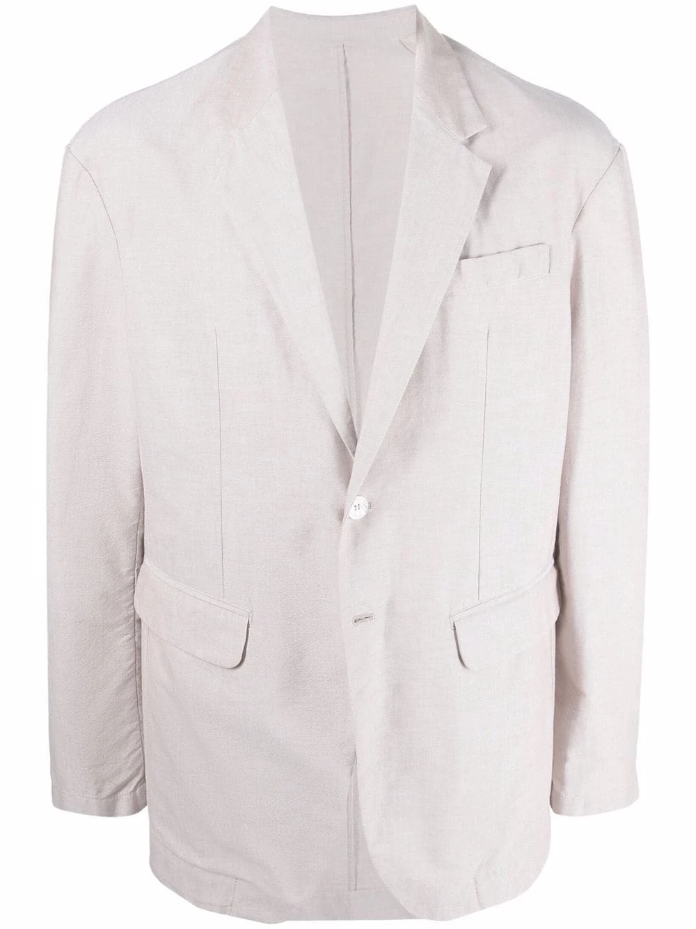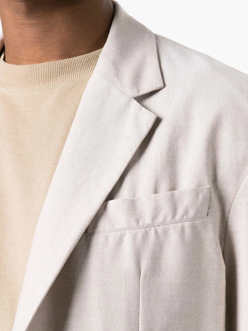 Col cranté, poche passepoilée sur la poitrine, boutonnière sur le devant, deux poches à rabat sur le devant. Matière : coton.