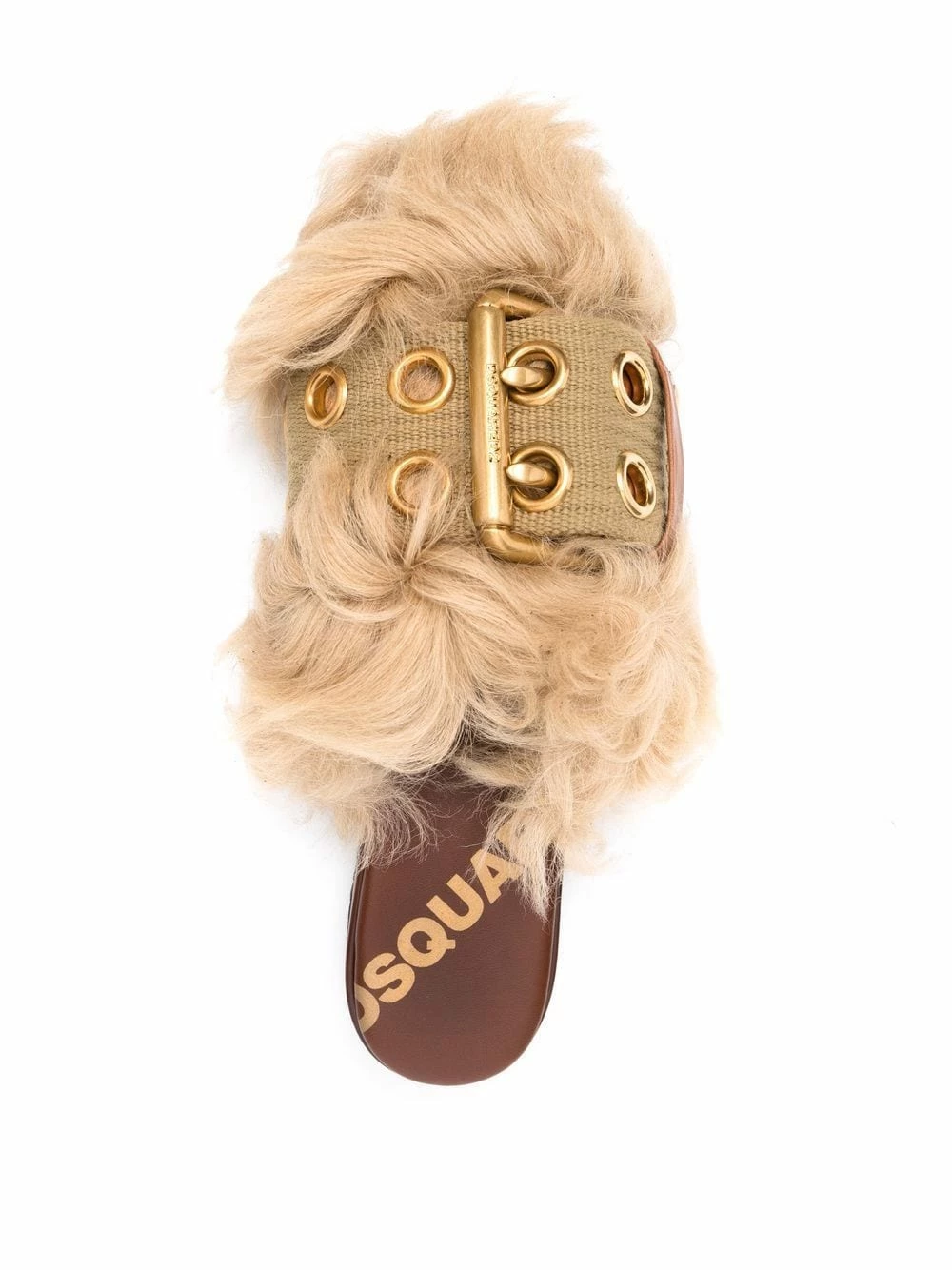 Finitions en métal doré, bout rond, design à enfiler, semelle intérieure à logo, semelle plate. Matière : peau de mouton.
