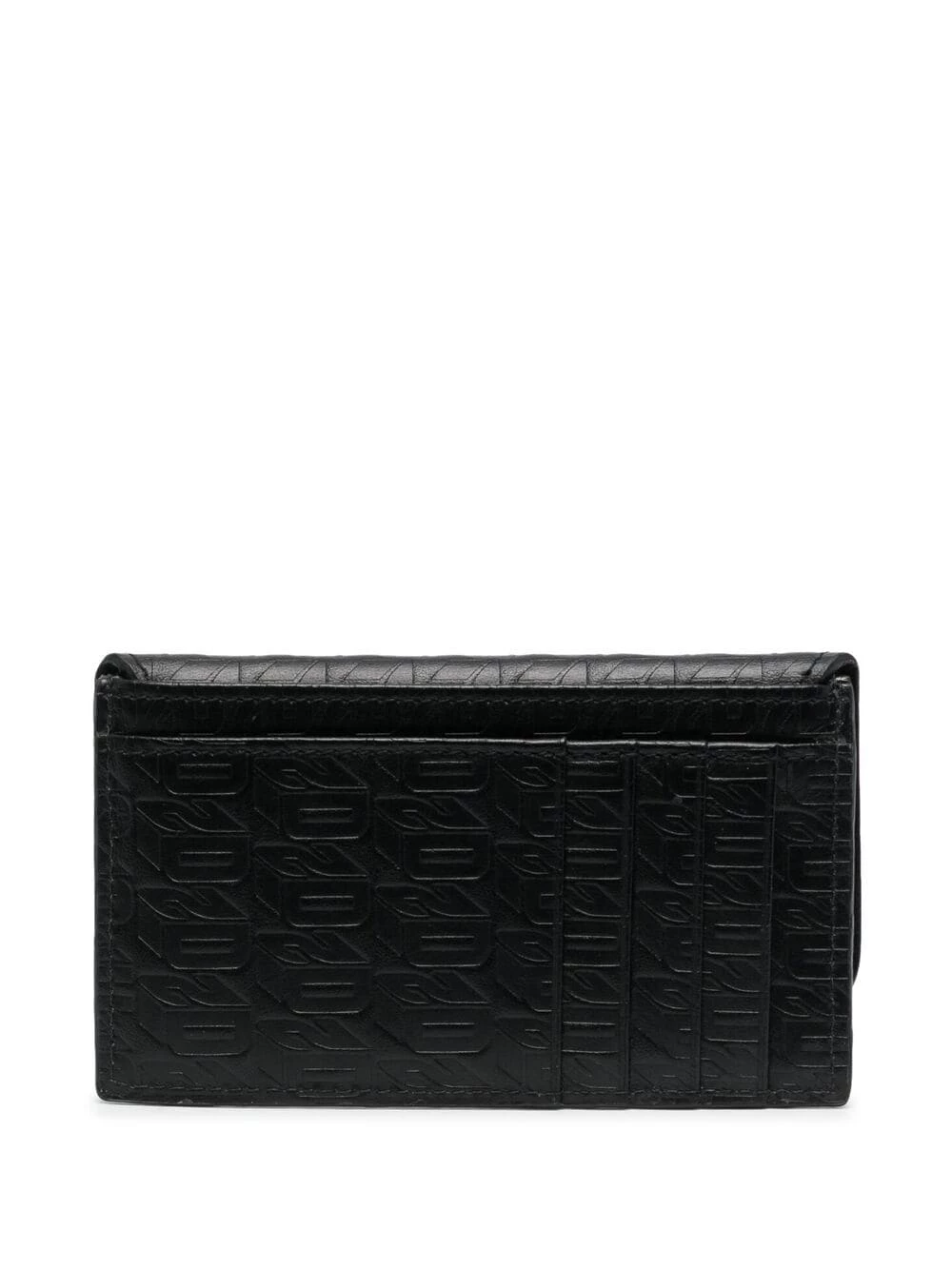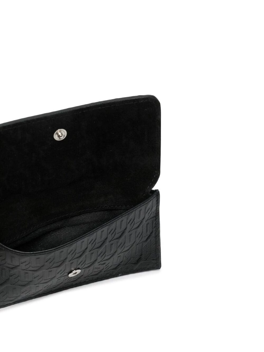 Motif monogrammé embossé, plaque logo argentée, fermeture à boutons pression, poche plaquée à l’arrière. Couleur : noir. Matière : cuir.