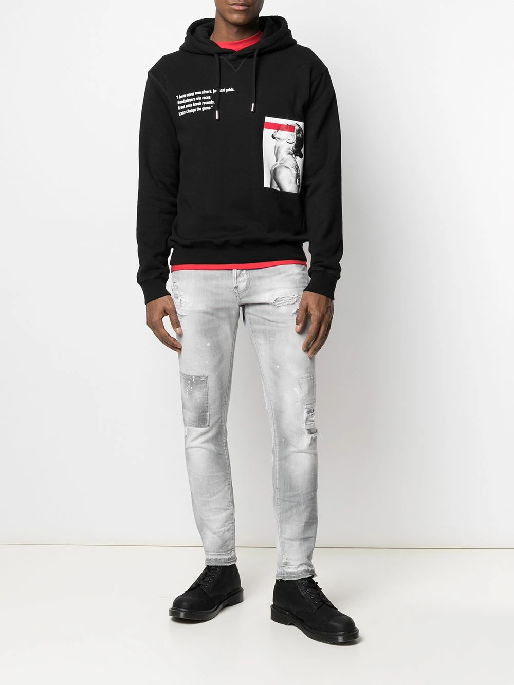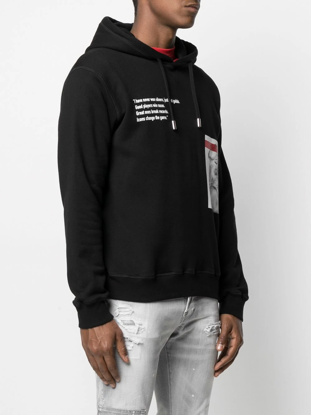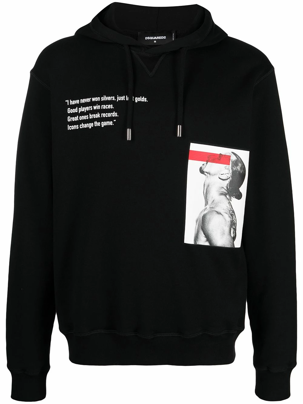 Imprimé graphique, slogan imprimé sur l’avant, logo imprimé à l’arrière, capuche à lien de resserrage, manches longues, ourlet droit. Couleur : noir. Matière : coton.
