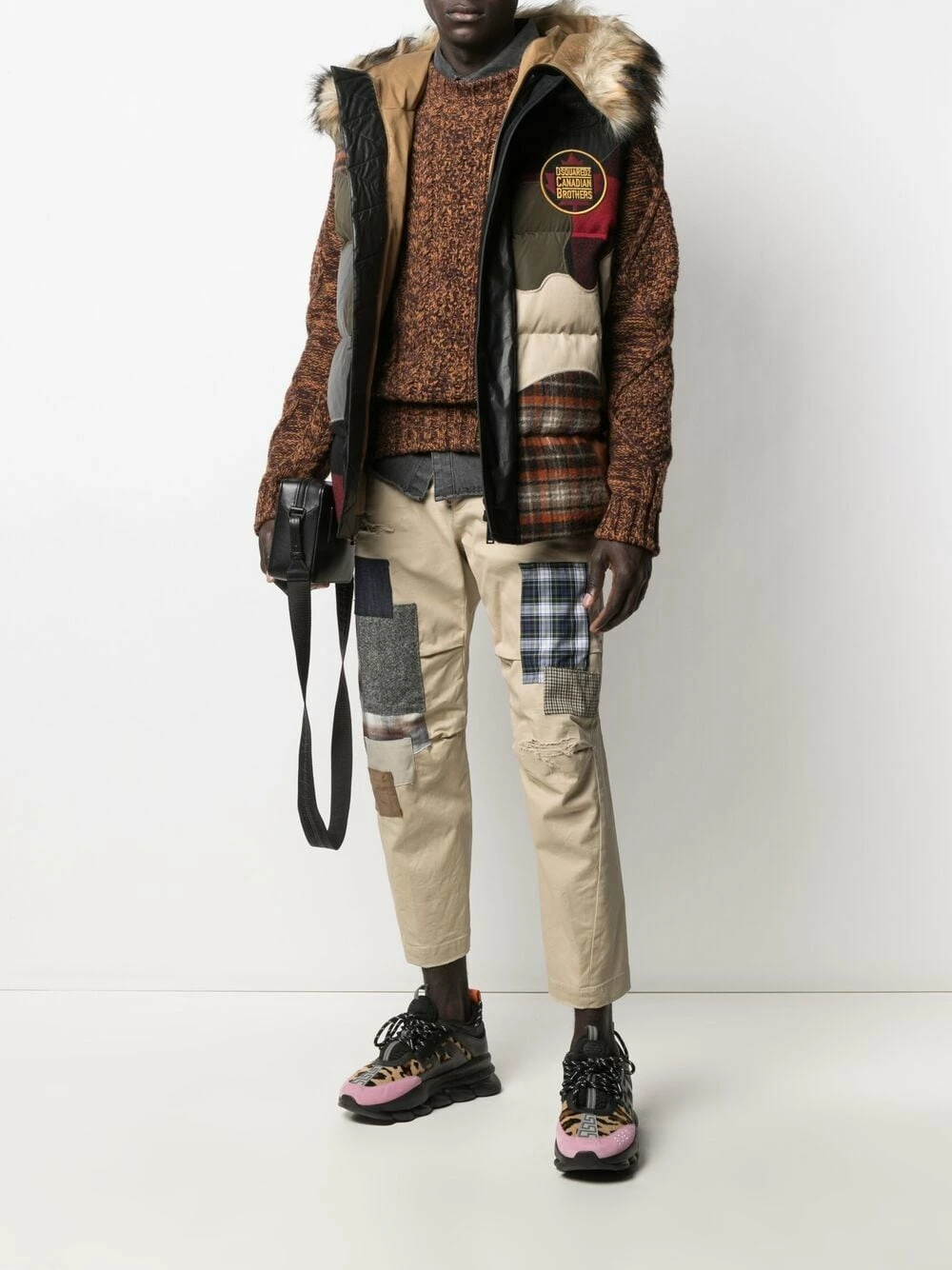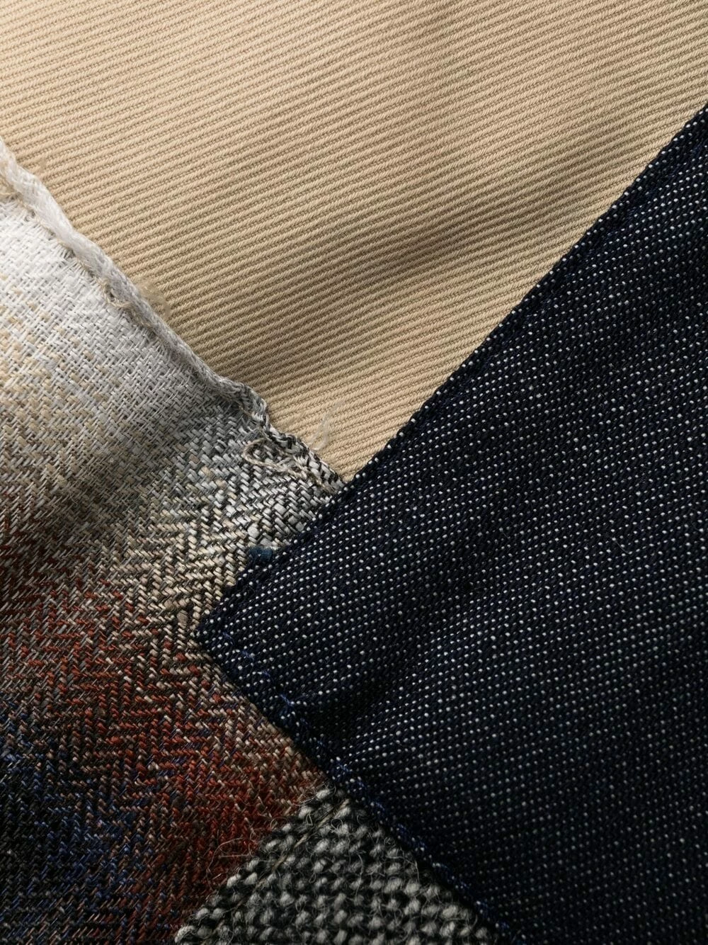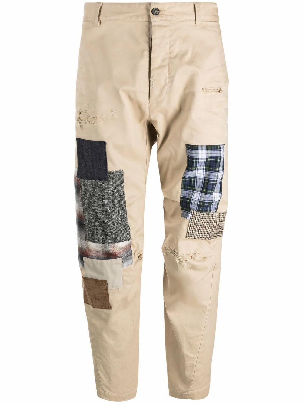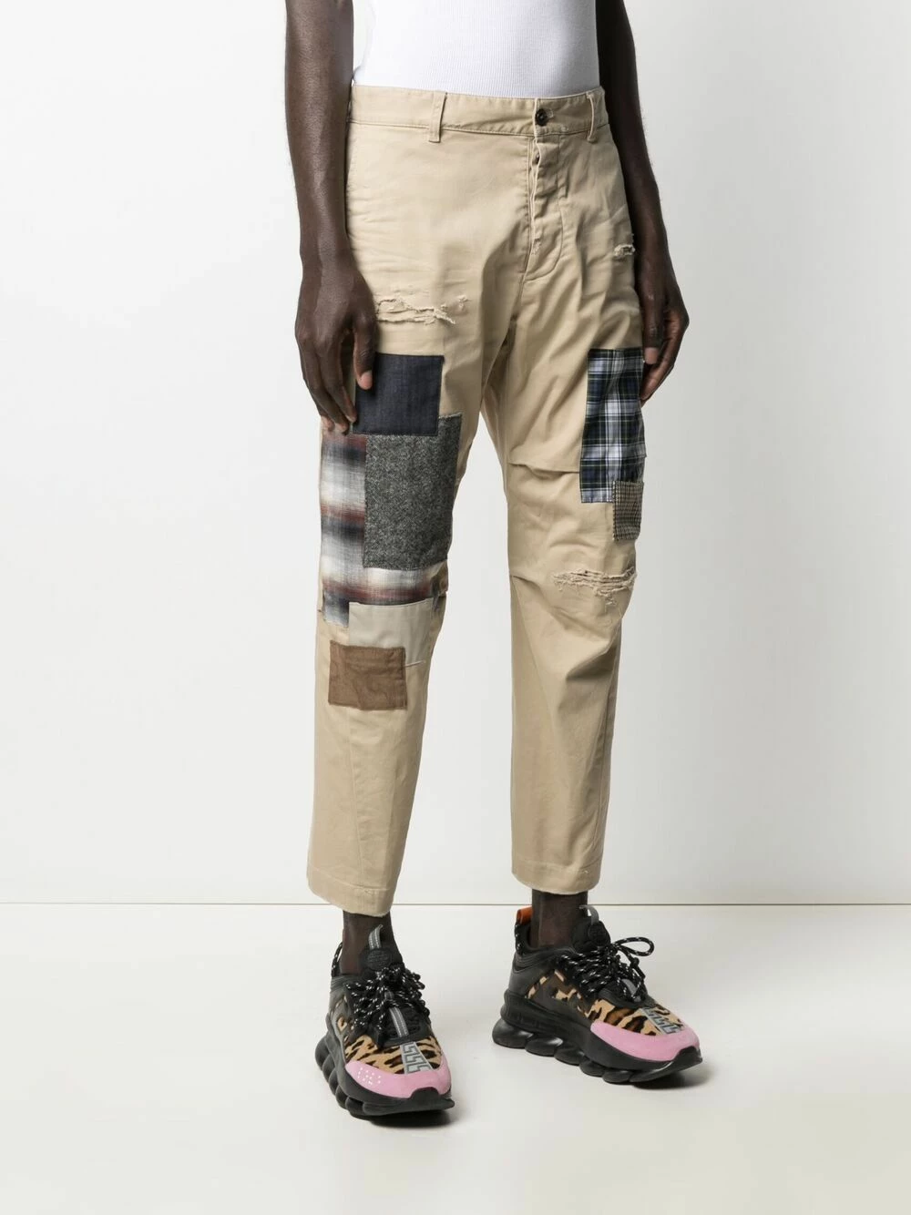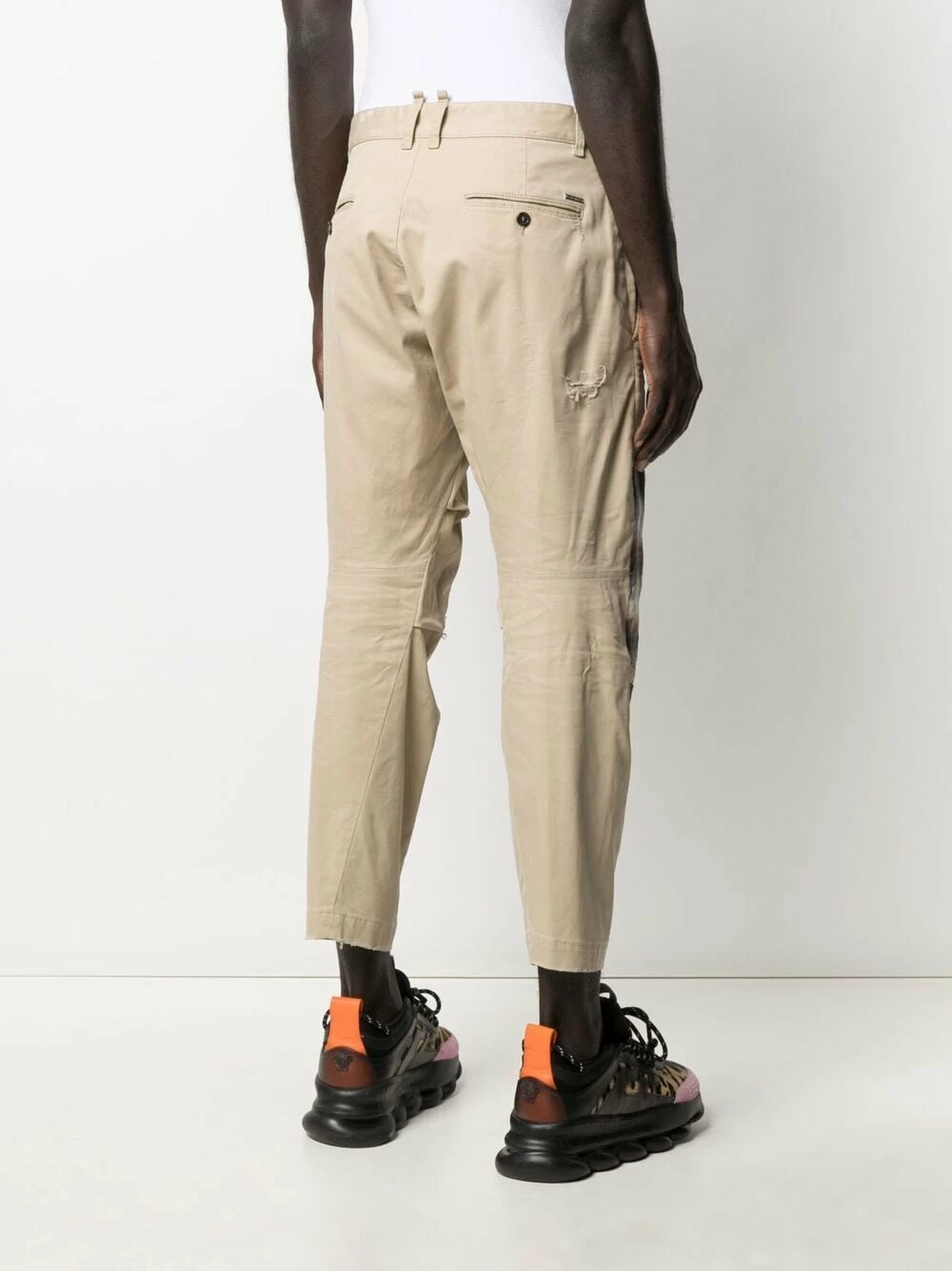 Détails d’empiècements, effet usé, longueur crop, passants de ceinture, fermeture à zip et boutons sur le devant, deux poches latérales fendues, deux poches passepoilées boutonnées à l’arrière.