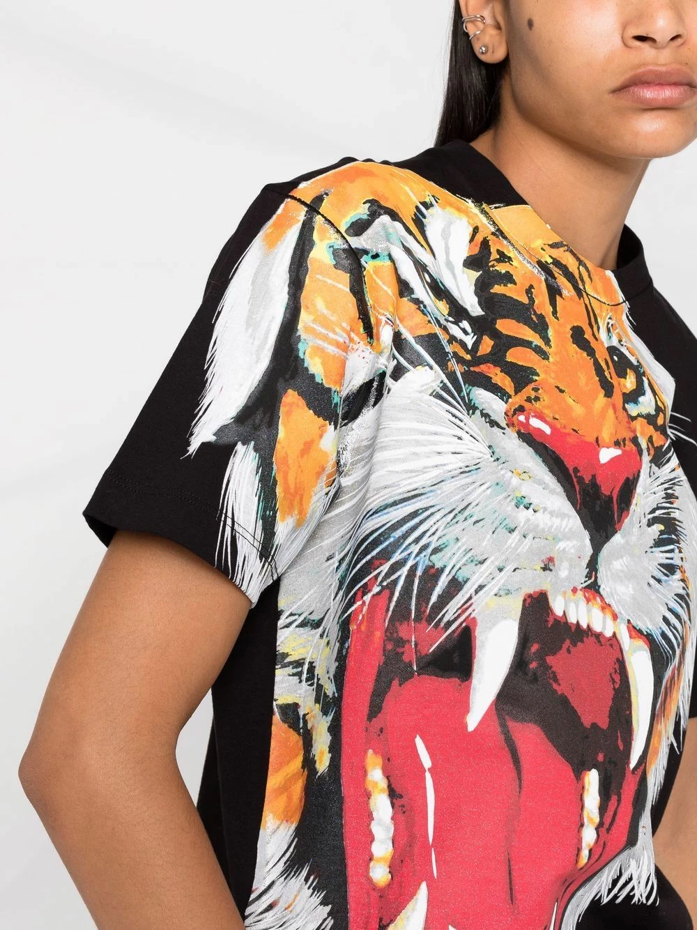 Logo imprimé sur le côté, imprimé tigre, encolure ronde, manches courtes, ourlet droit. Couleur : noir. Matière : coton.