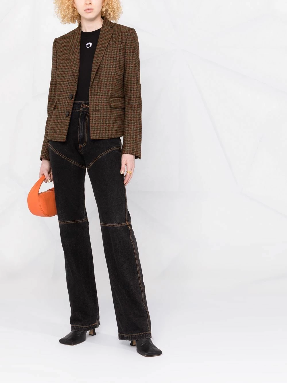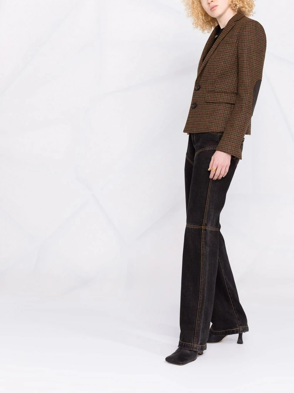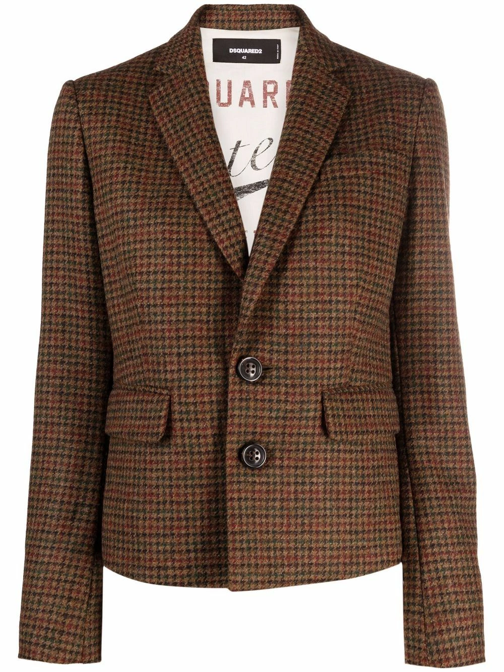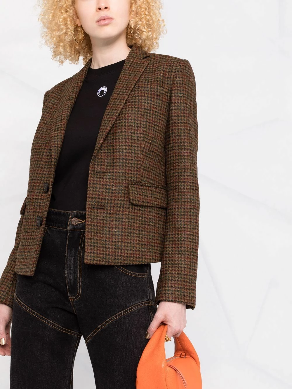 Motif pied-de-poule, revers crantés, boutonnière sur le devant, manches longues, coudières, fente arrière. Couleur : marron. Matière : laine.