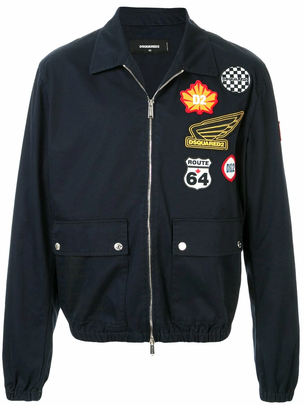 Veste bomber à design patchwork en coton Dsquared2 avec fermeture zippée devant, manches longues, design patchwork, poches devant à rabat, ceinture élastique et poignets élastiqués. Couleur : bleu.